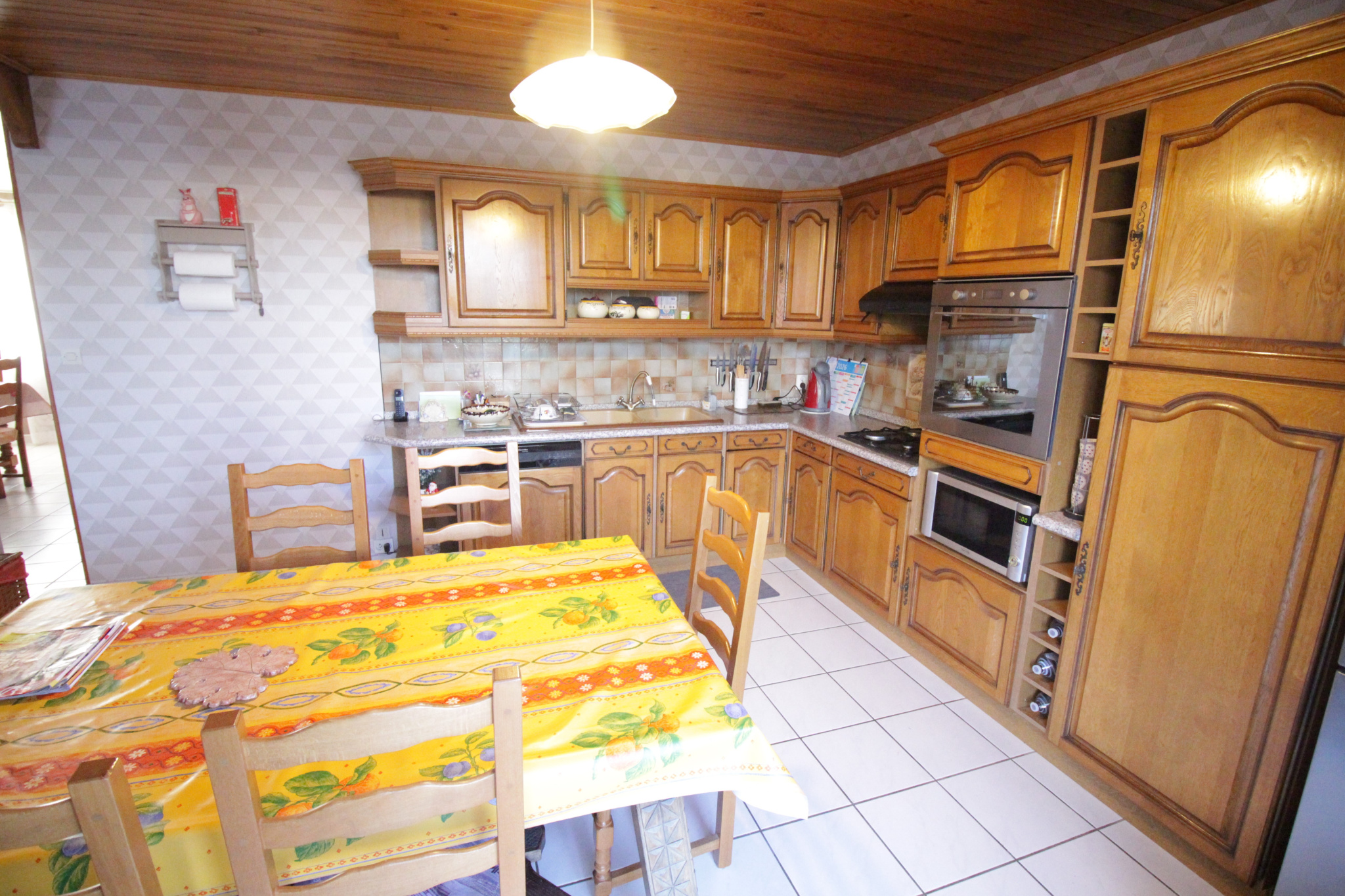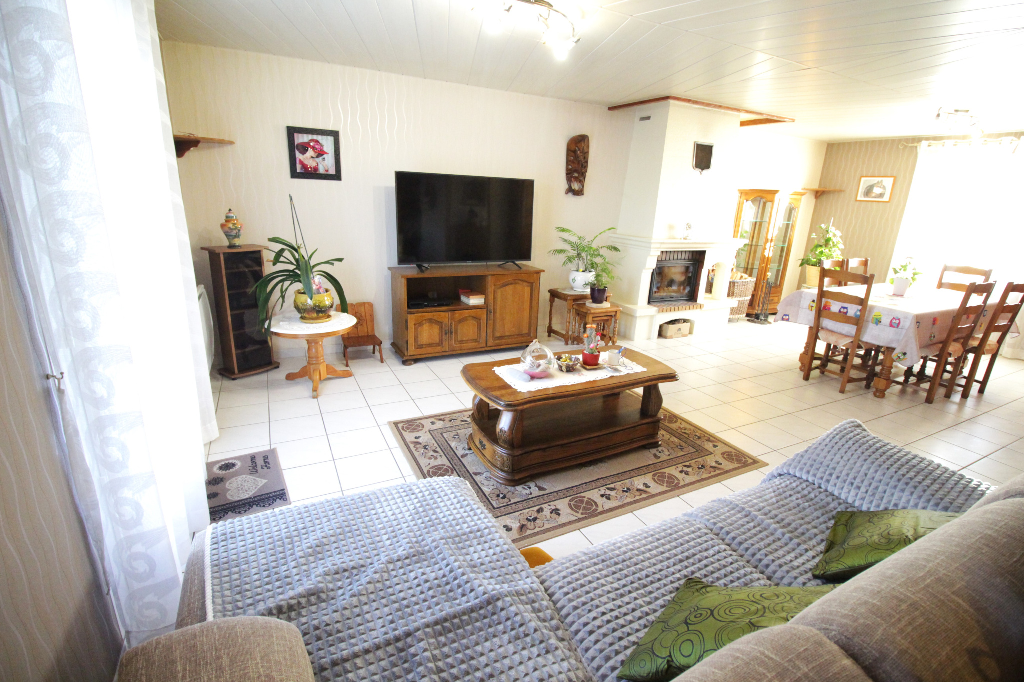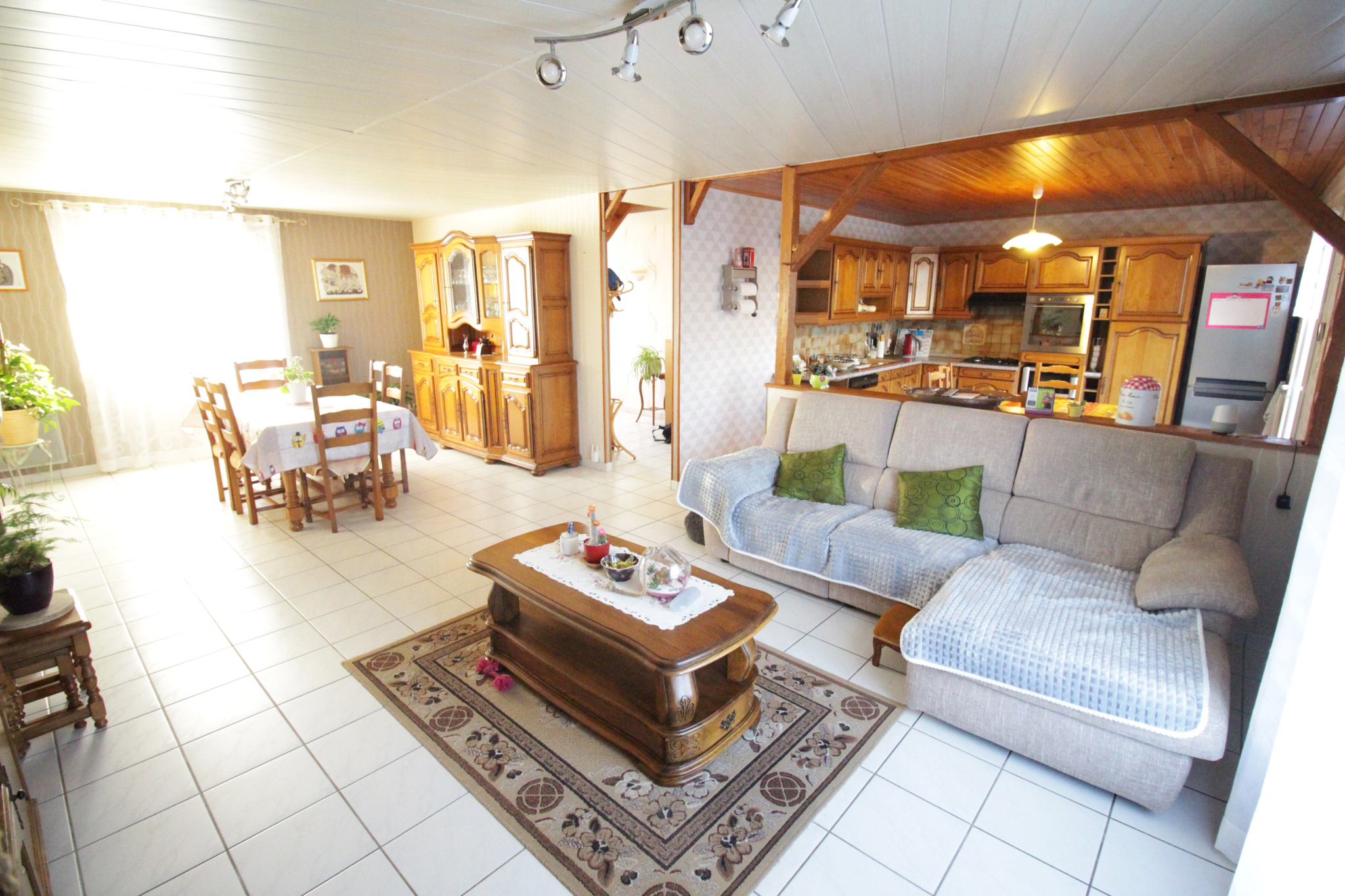 De plain-pied vous bénéficiez d'une grande entrée, d'un ensemble d'environ 50 m2 comportant un salon-séjour avec une cheminée insert et d'une cuisine aménagée/équipée.