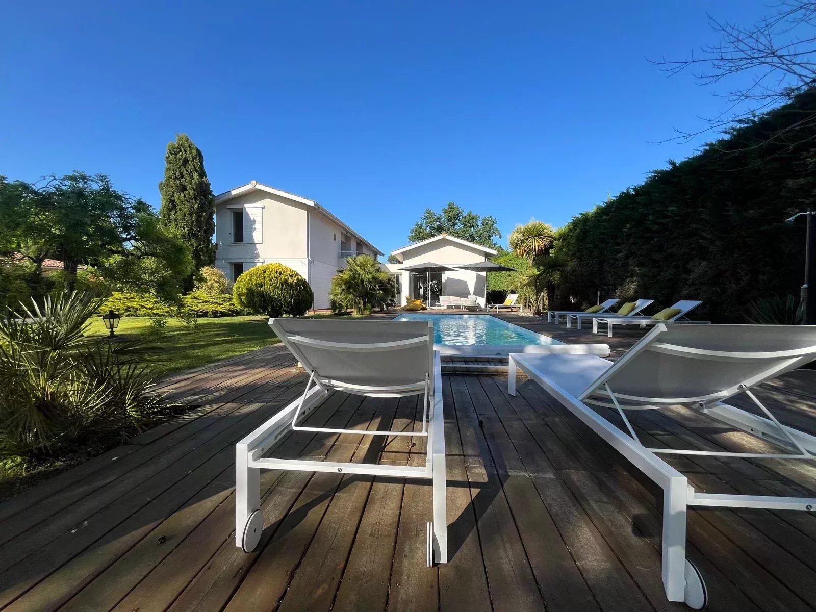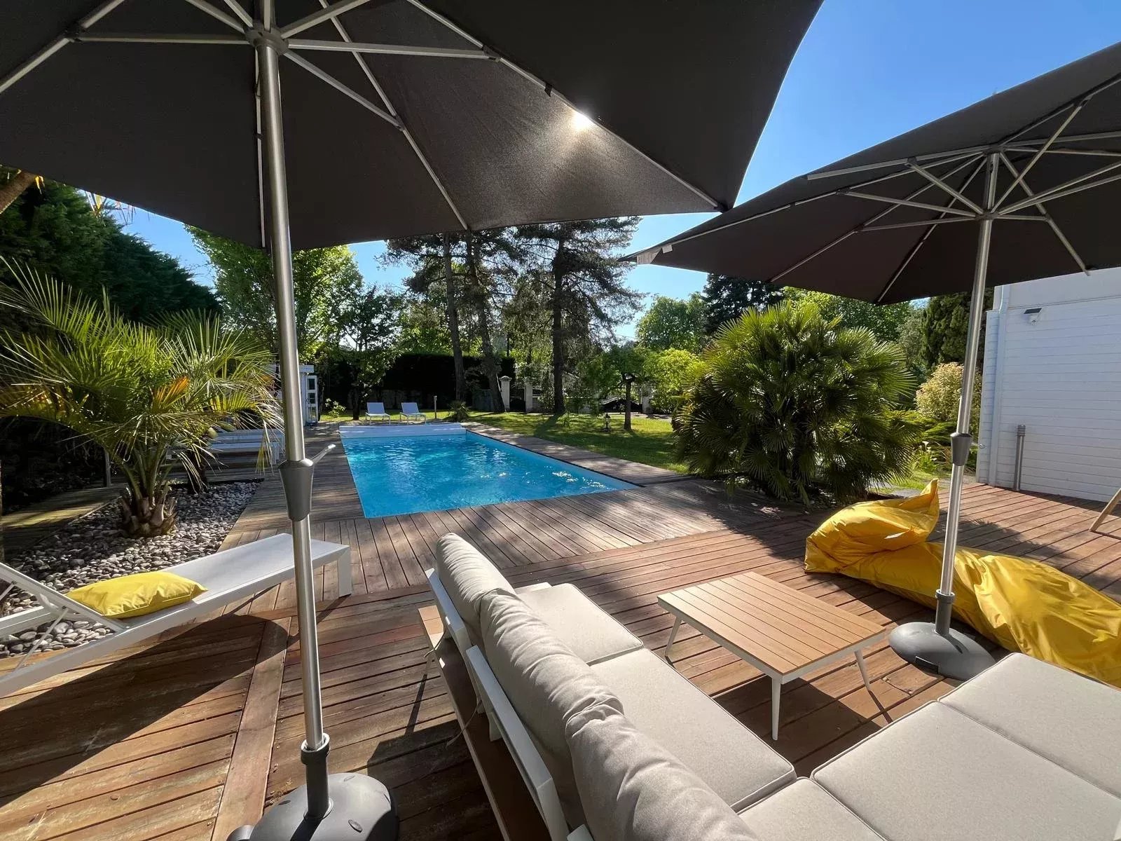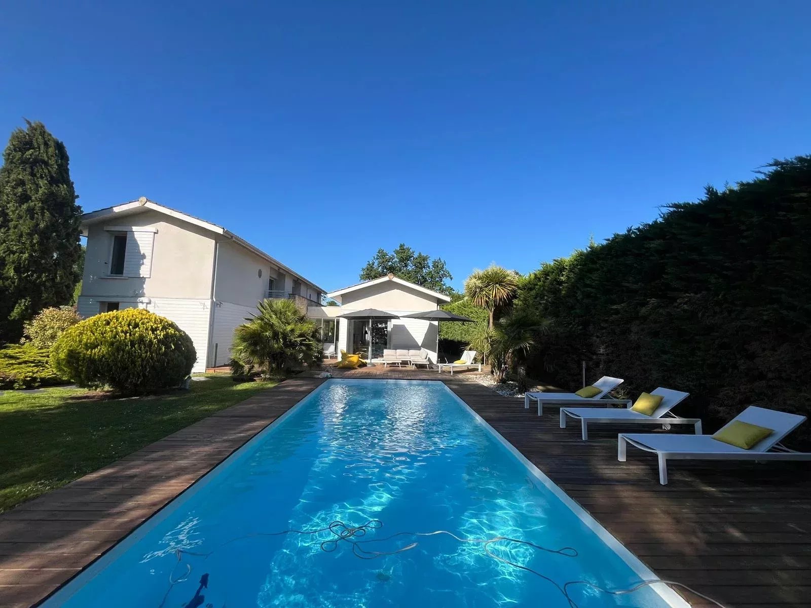 L’extérieur se distingue par un jardin paysager et une grande piscine, invitant à la détente et aux moments de convivialité. L’ensemble est parfaitement aménagé pour profiter des beaux jours en toute intimité.