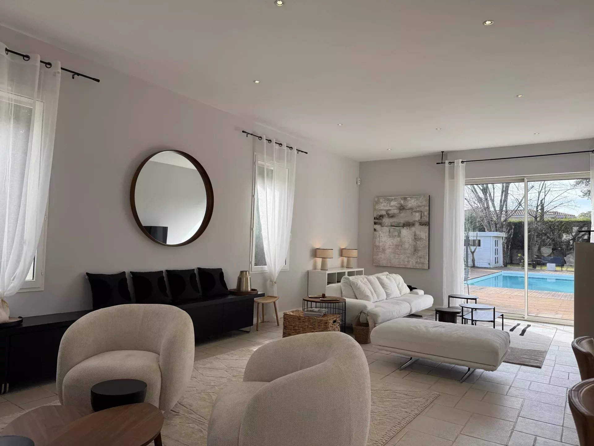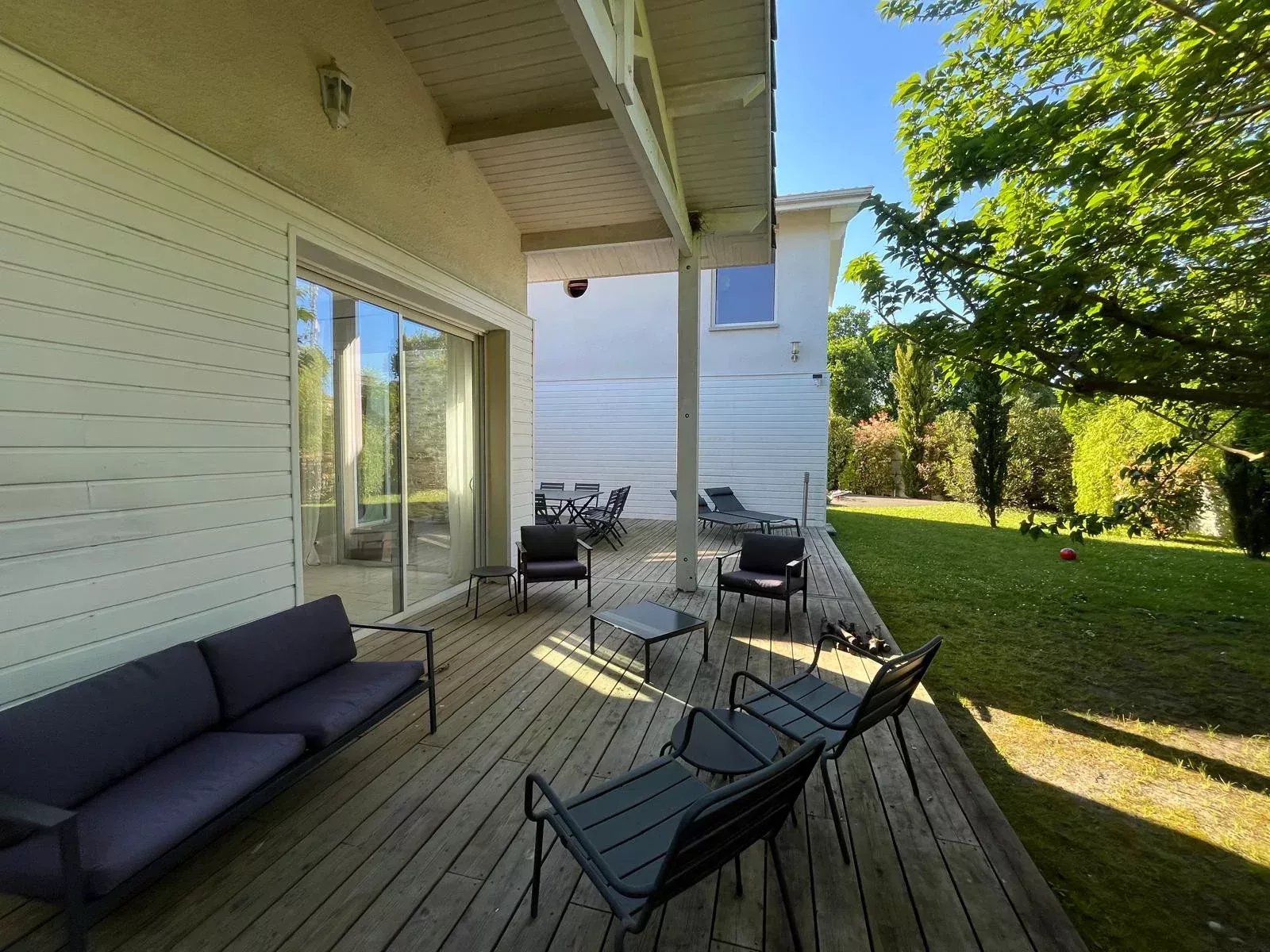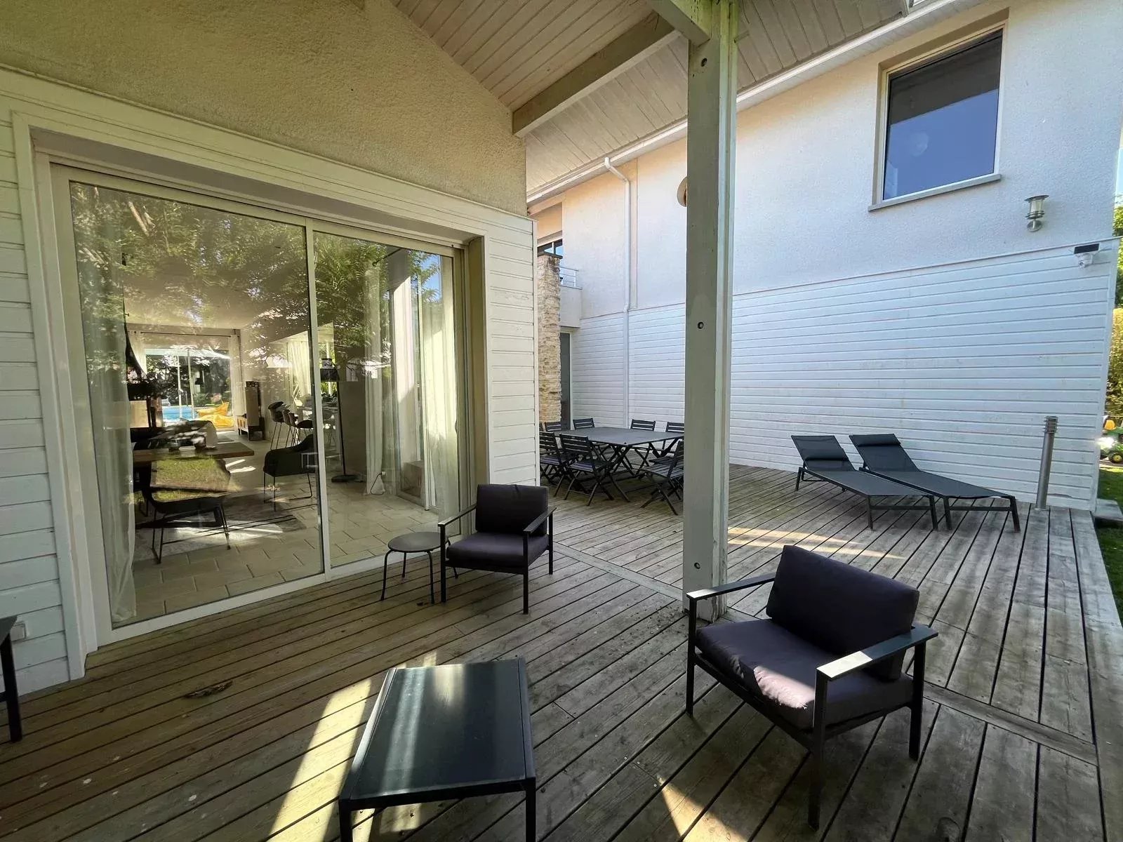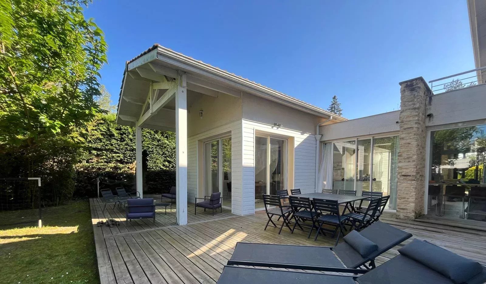 L’extérieur se distingue par un jardin paysager et une grande piscine, invitant à la détente et aux moments de convivialité. L’ensemble est parfaitement aménagé pour profiter des beaux jours en toute intimité.