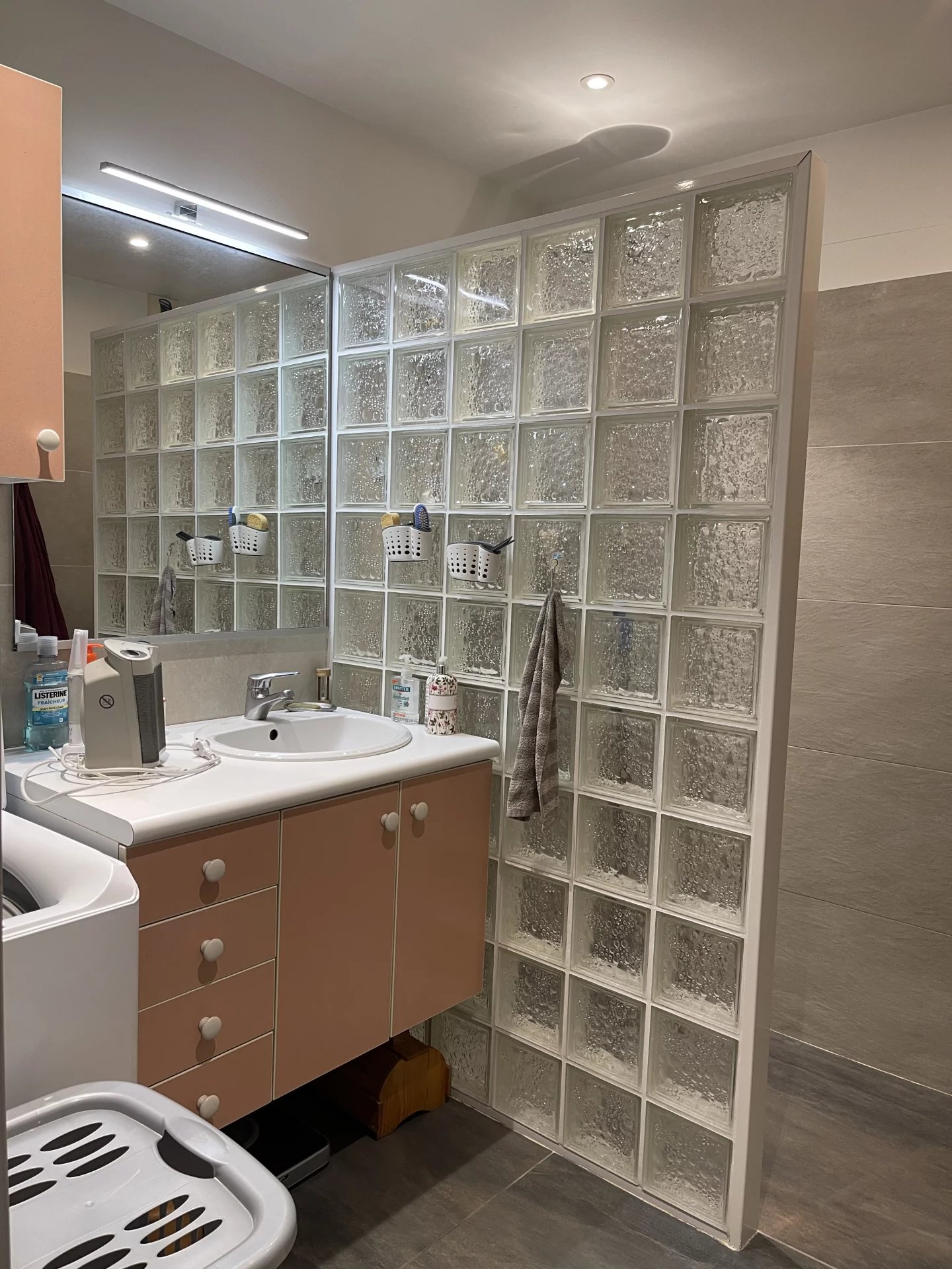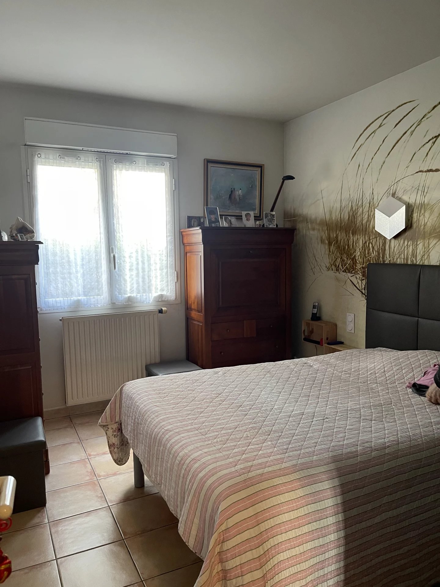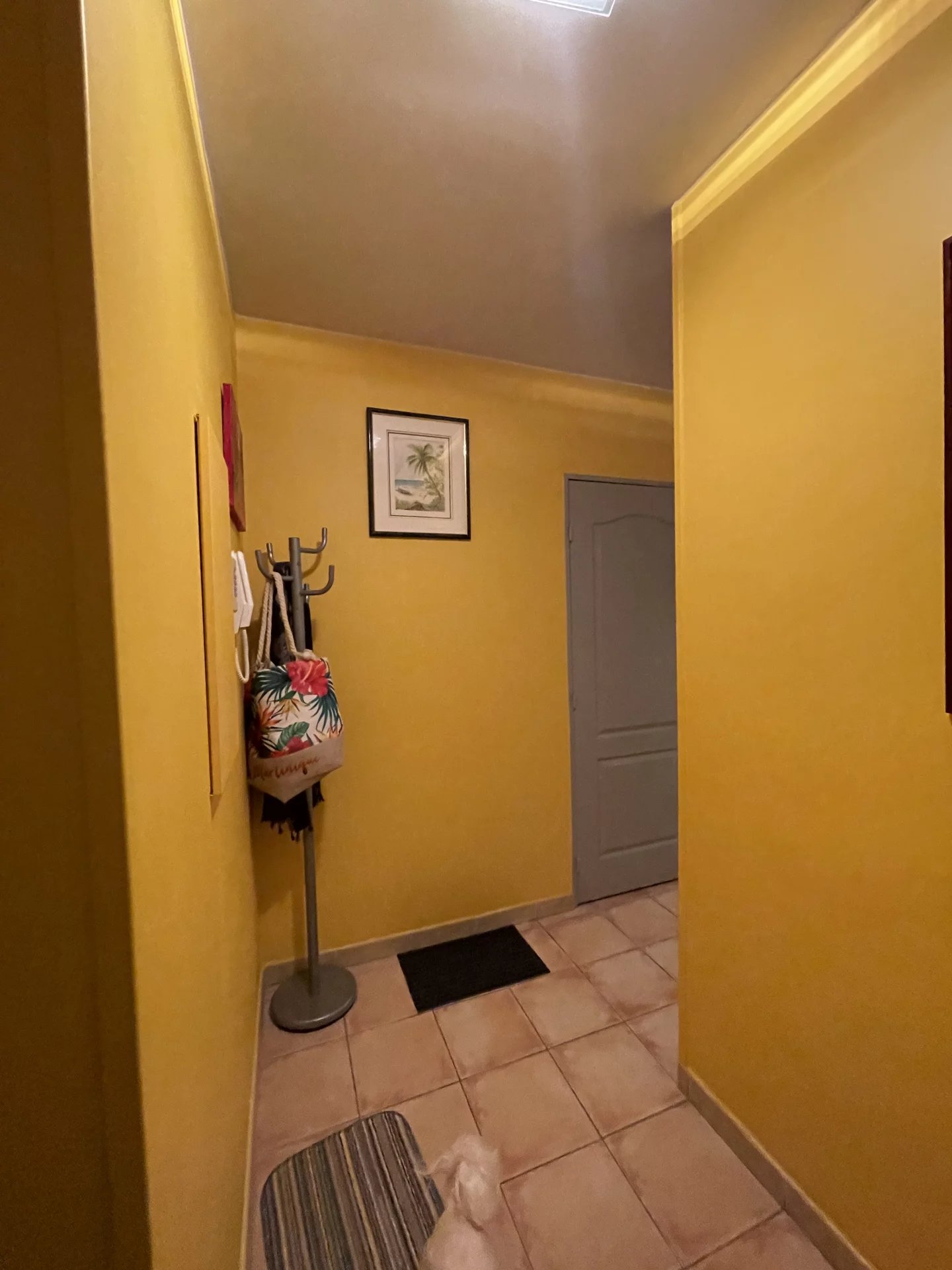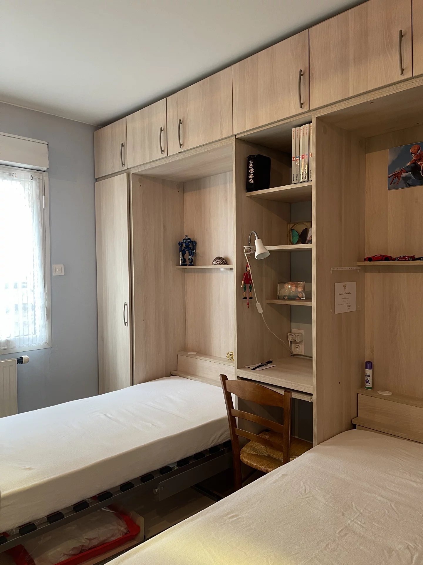 Entrée avec placard mural et coffre encastré. Cuisine équipée et aménagée avec climatisation réversible, meubles hauts et bas, plaque vitro céramique, hotte aspirante, four, four micro-ondes, refrigérateur-congélateur et lave-vaisselle, ouverte sur le séjour avec luminaires et double rideaux. un WC avec lave-mains, une salle d'eau avec lavabo sur meuble et miroir, cabine douche, une chambre avec penderie aménagée, une deuxième chambre avec penderie et 2 lits en 90 cm encastrés dans penderie et rangements.