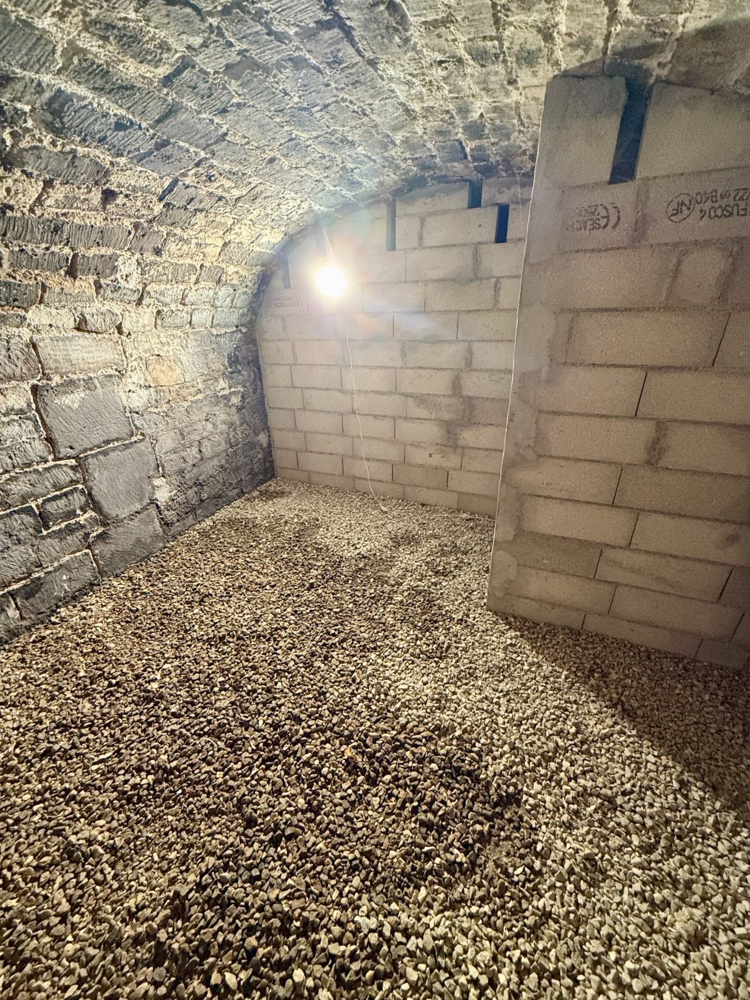 Cave saine, ventilée, avec lumière, vide et facilement accessible.
