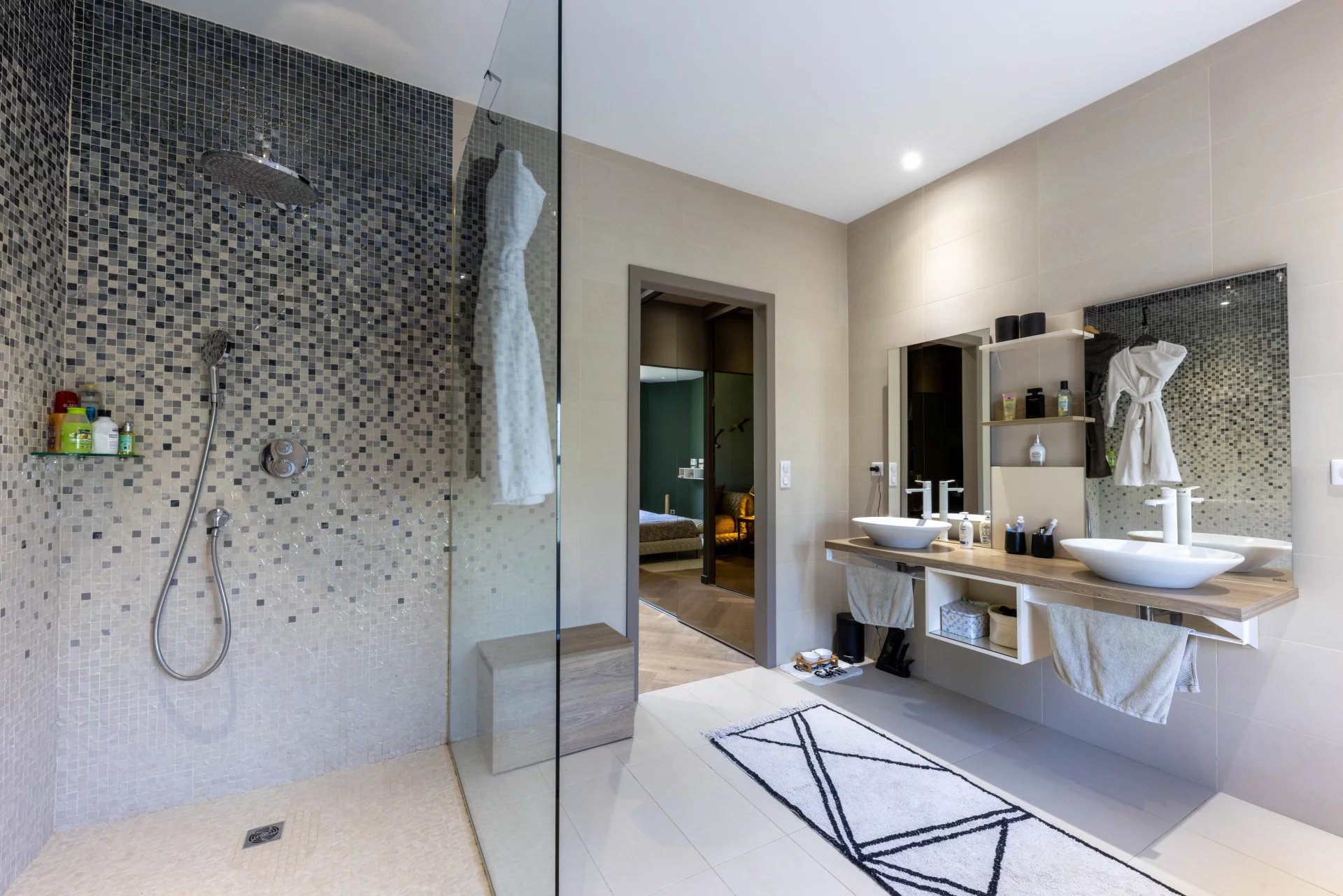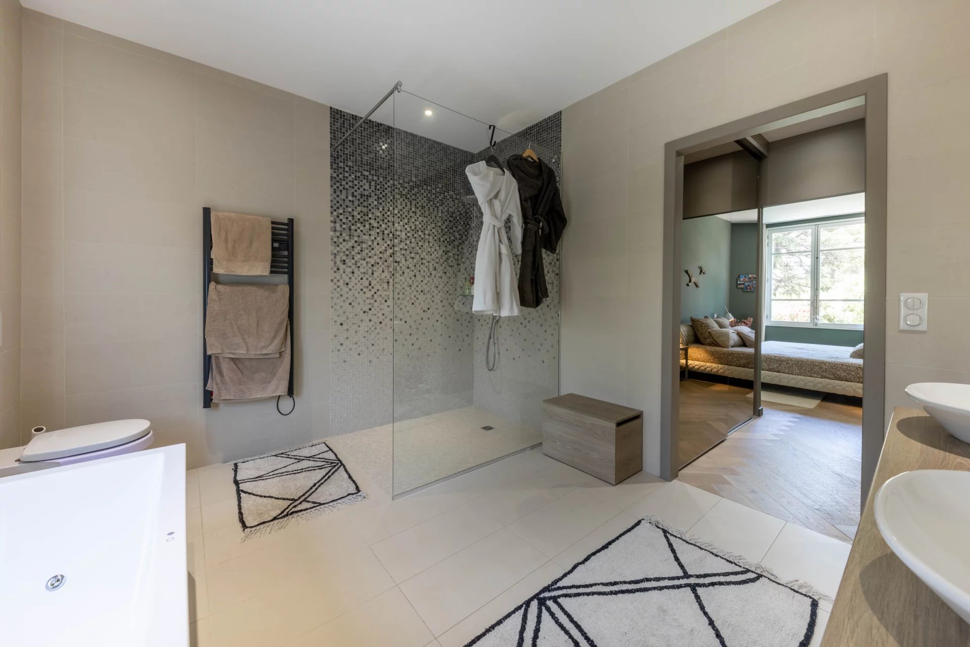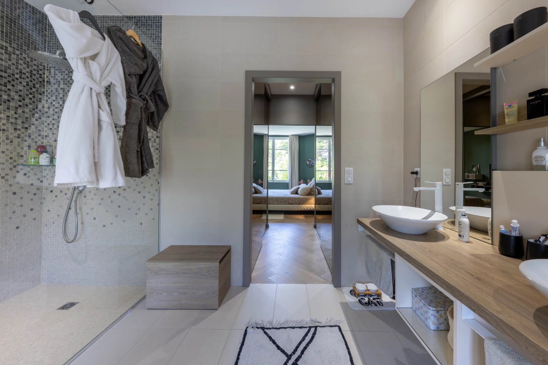 À l'étage, la chambre principale avec son dressing offre un espace privé confortable. Elle est accompagnée d'une salle de bains/douche attenante pour un confort ultime. Deux autres chambres ainsi qu'une salle de bains supplémentaire complètent cet étage, offrant amplement d'espace pour la famille et les invités.