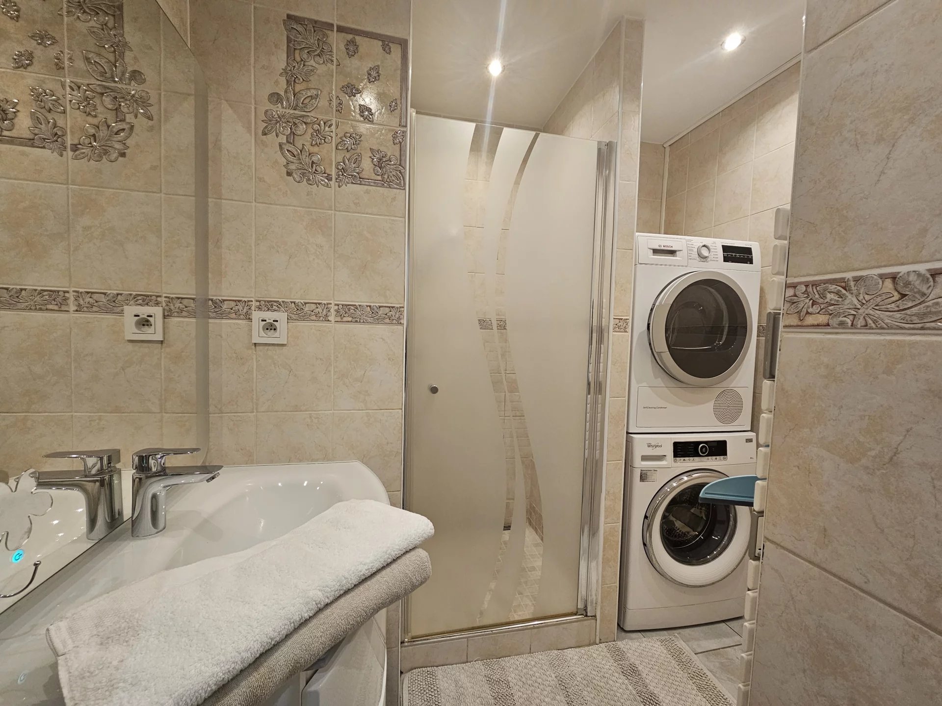 Une salle de bains rénovée : Bien agencée avec douche et espace de rangement.