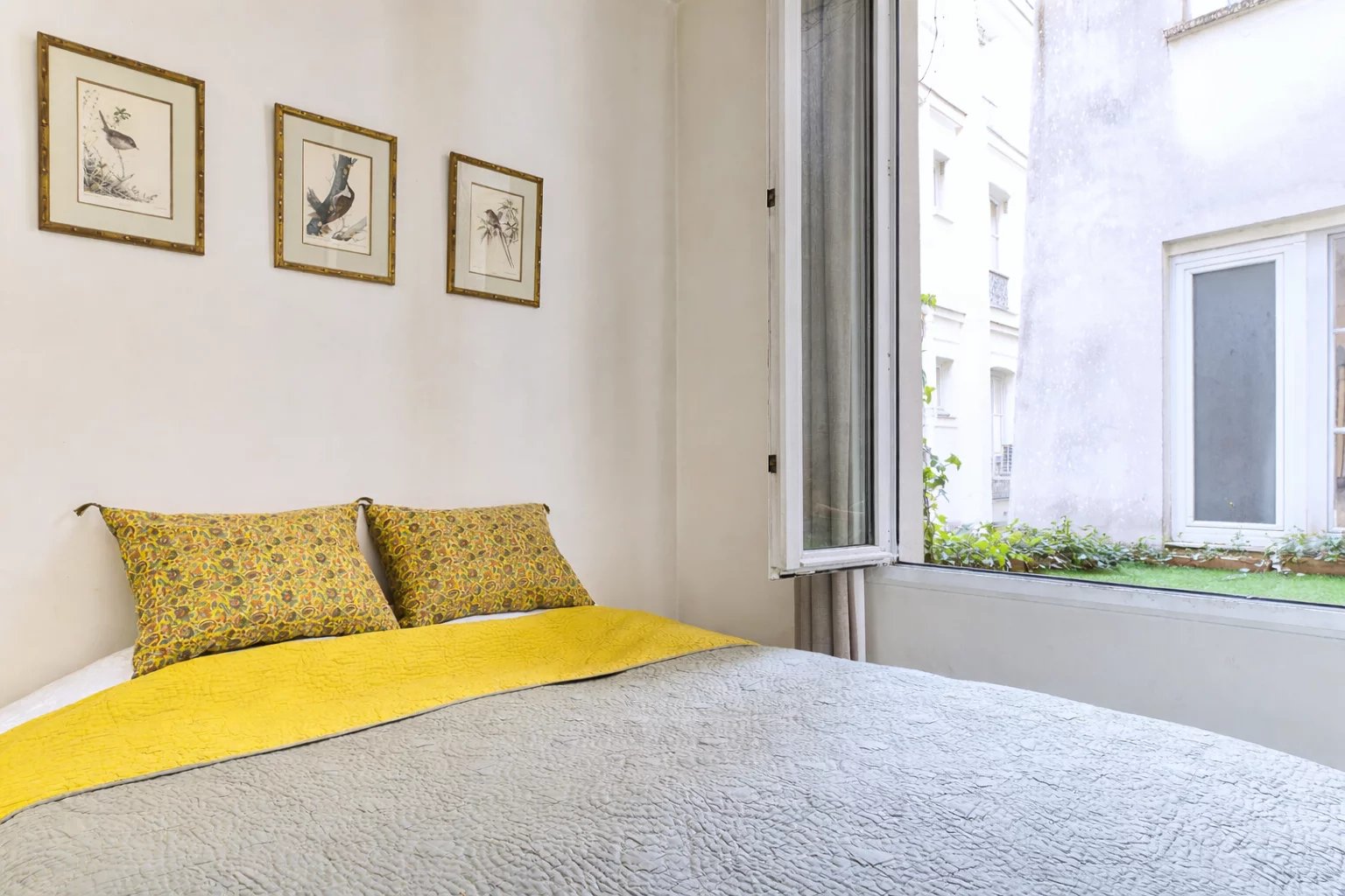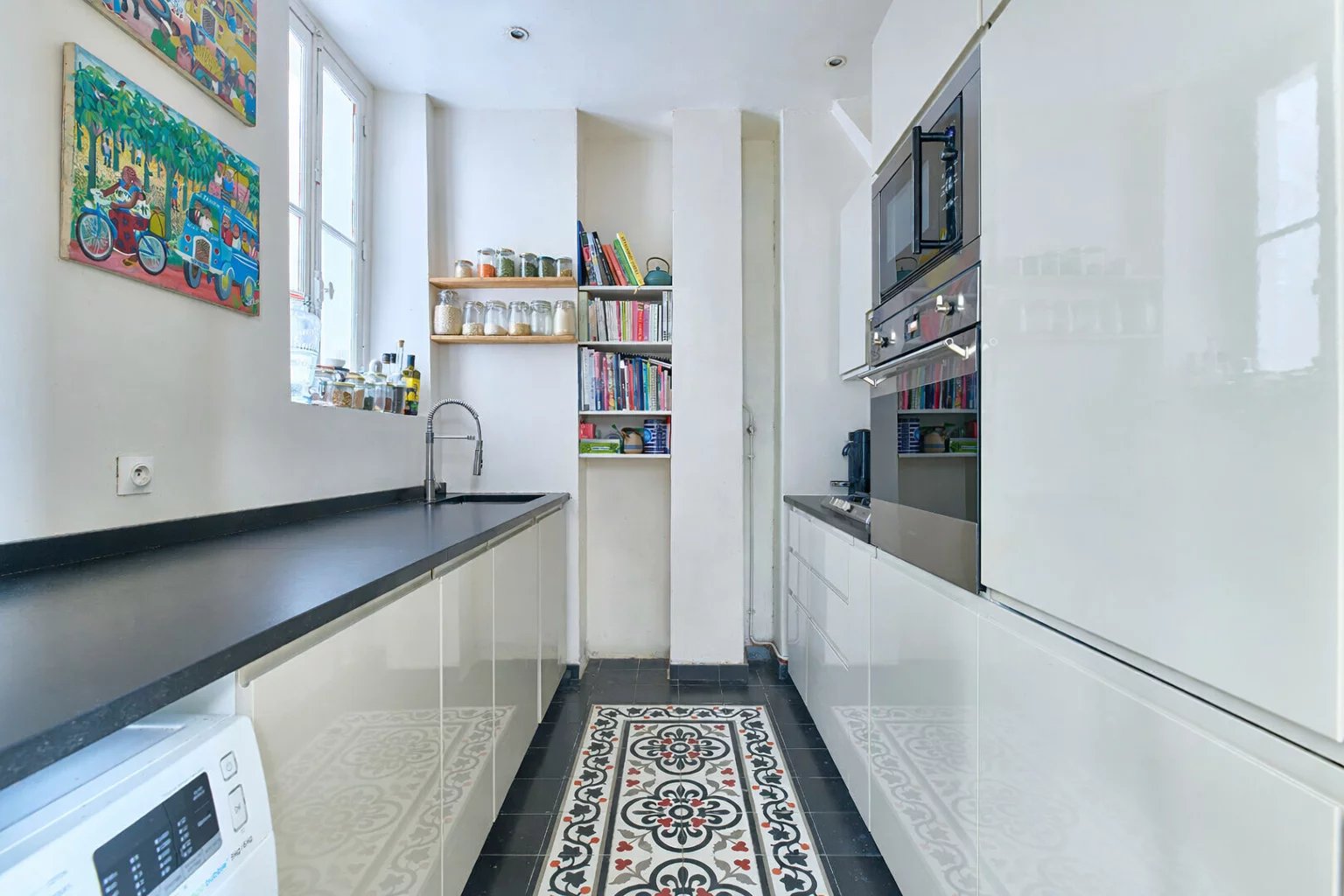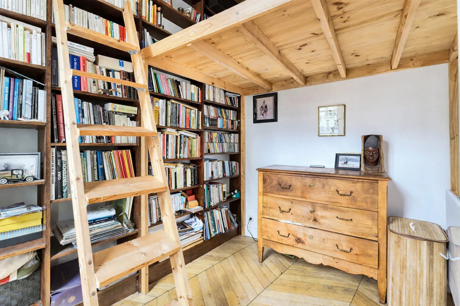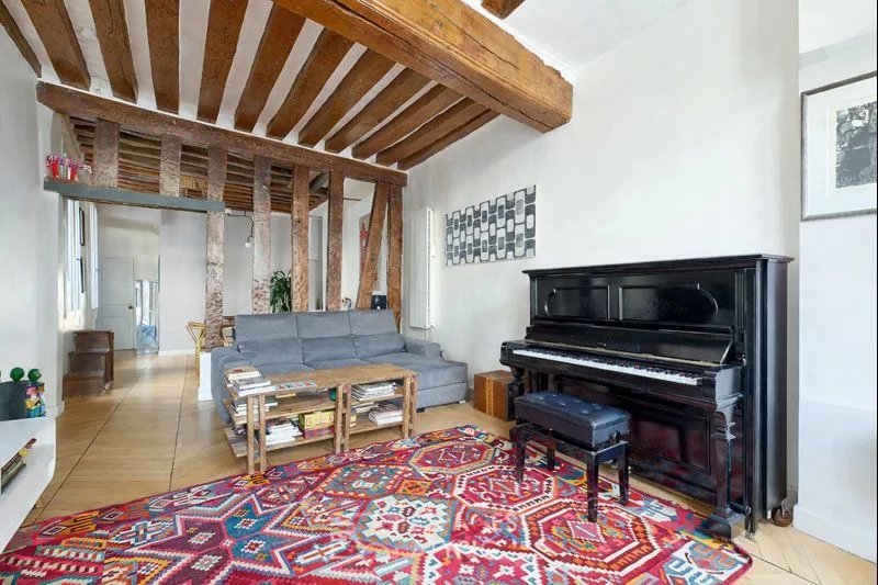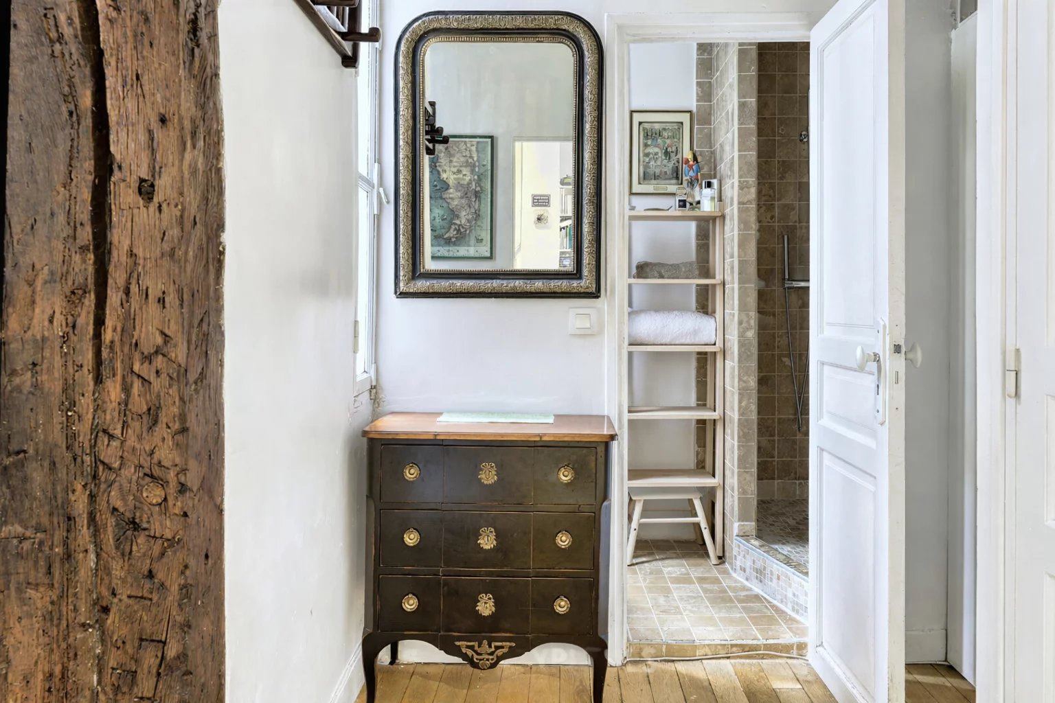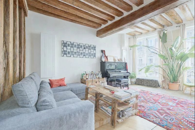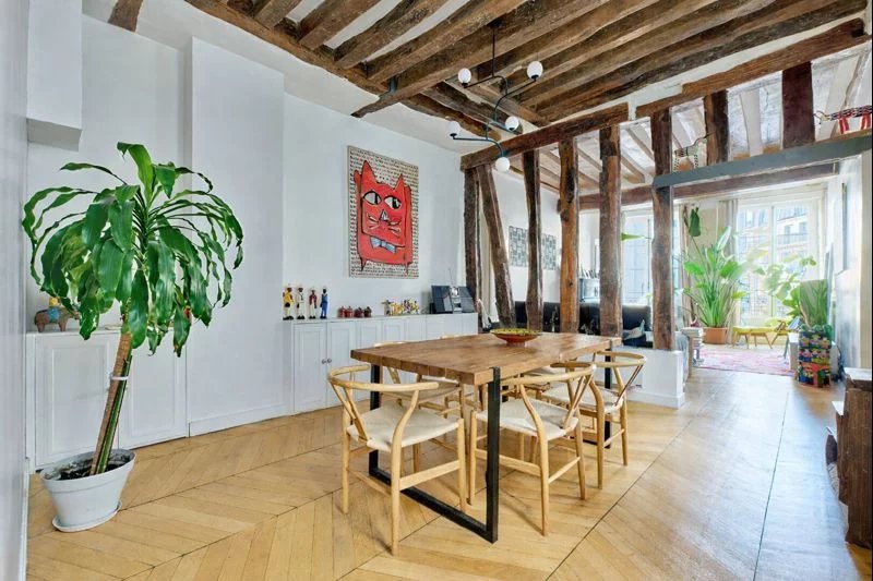 La belle hauteur sous plafond de plus de 3 mètres, les poutres apparentes et les colombages lui donnent ce charme parisien intemporel, typique du quartier Montorgueil.