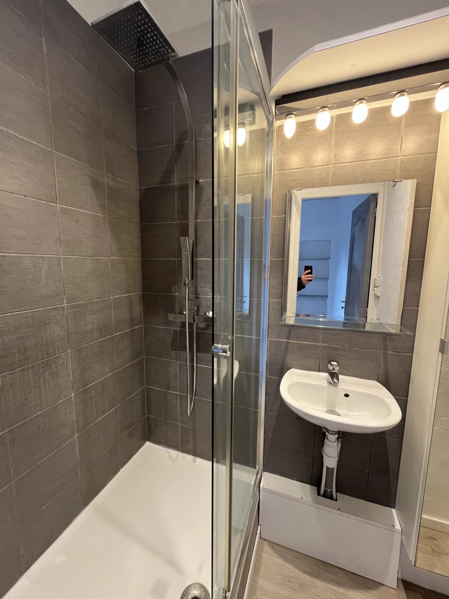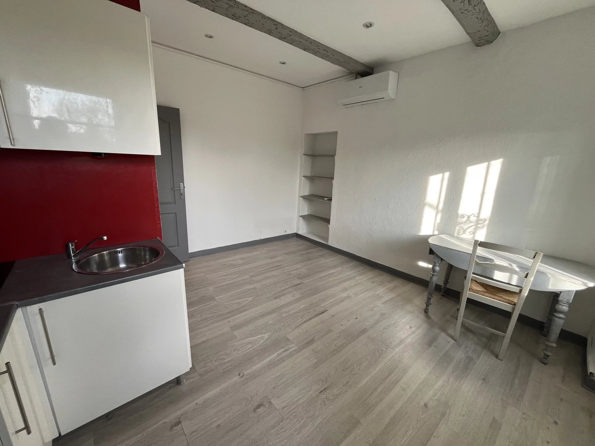 Studio de 17m² avec terrasse rénové et climatisé comprenant une pièce de vie avec cuisine ouverte et aménagée et une salle d'eau avec toilettes.