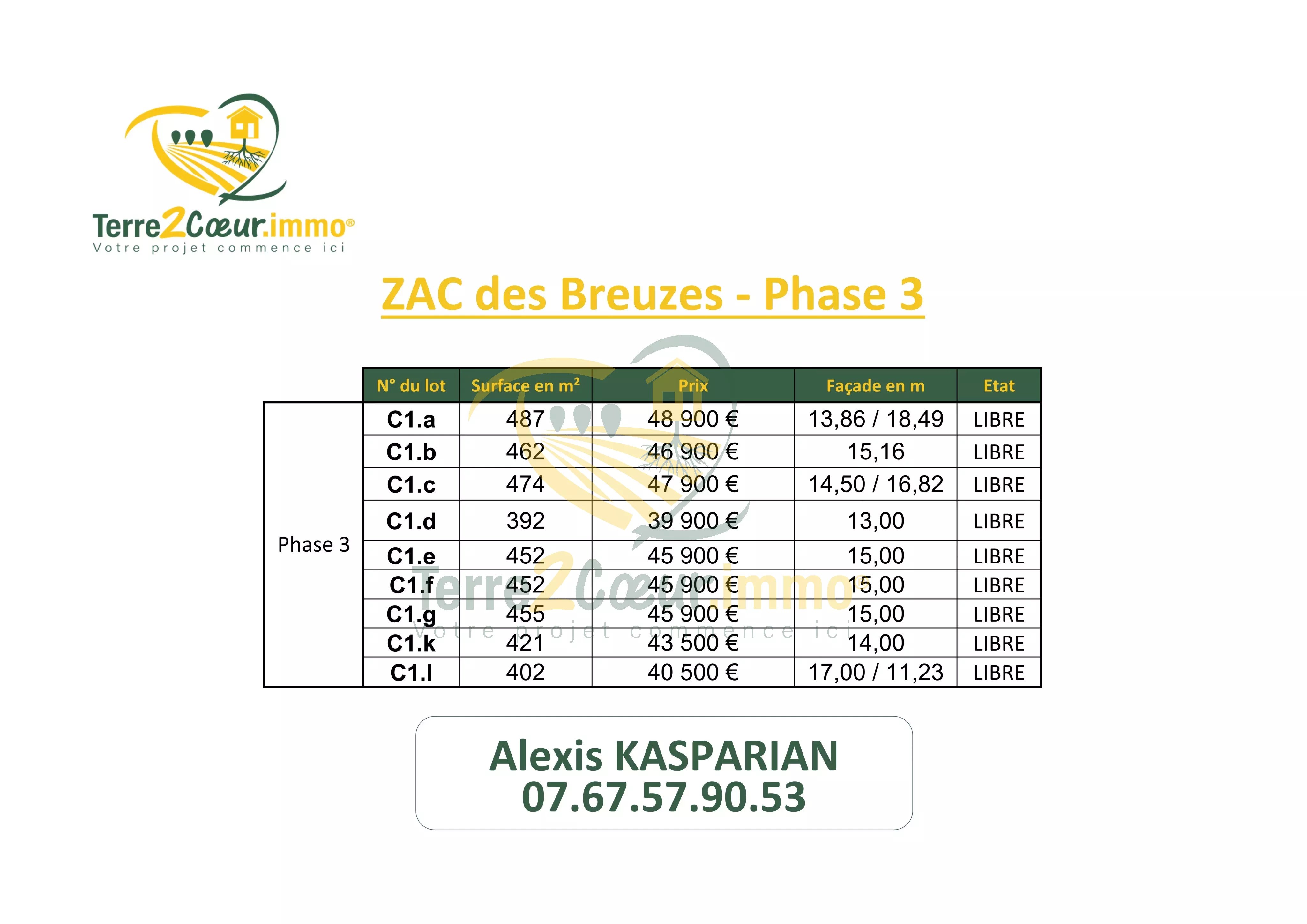 🌿 À vendre – Terrains à bâtir entièrement viabilisés à Bourges – ZAC des Breuzes (Phase 3) 🌿 📍 Entre le Chemin de Villeneuve et la Route de la Chapelle – Cadre verdoyant et emplacement stratégique ! ✨ Un véritable quartier nature aux portes de la ville : la ZAC des Breuzes bénéficie d’un magnifique parc paysager, idéal pour les promenades, les loisirs en plein air et un cadre de vie sain et apaisant. 🔹 Parcelles disponibles : de 327 m² à 774 m² 💰 Prix : de 32 900 € à 75 500 € – voir grille tarifaire en annexe 🎯 Des surfaces adaptées à tous les projets : primo-accédants, familles, investisseurs ou résidence secondaire ✅ Terrains 100 % viabilisés : Eau, Électricité, Gaz, Fibre, Tout-à-l’égout ✅ Bornés et avec étude de sol G1 déjà réalisée ✅ Libre constructeur : donnez vie à votre projet en toute liberté ! 💡 Avantages fiscaux exclusifs : Taxe de raccordement au tout-à-l’égout réduite Taxe d’aménagement en partie exonérée ➡ Un gain d’environ 4 000 € sur n’importe quel terrain choisi ! 📍 Emplacement de choix : Accès direct à la rocade et à l’autoroute À proximité de MBDA Arrêts de bus, écoles, commerces et équipements à quelques minutes Quartier calme mais extrêmement bien desservi 🎁 Opportunité rare à Bourges avec avantages financiers inclus ! 💼 Honoraires à la charge du vendeur 📞 Pour découvrir la grille des prix, recevoir un plan de la ZAC ou organiser une visite, contactez Alexis, votre conseiller foncier. 🔎 Plus d’informations sur les risques potentiels : 👉 georisques.gouv.fr 🌟 ZAC des Breuzes – Un nouveau quartier naturel et dynamique pour concrétiser tous vos projets de vie !