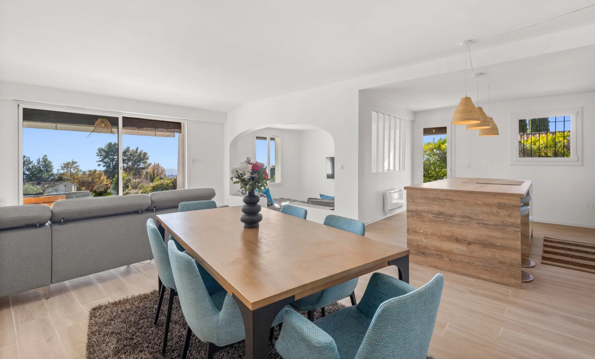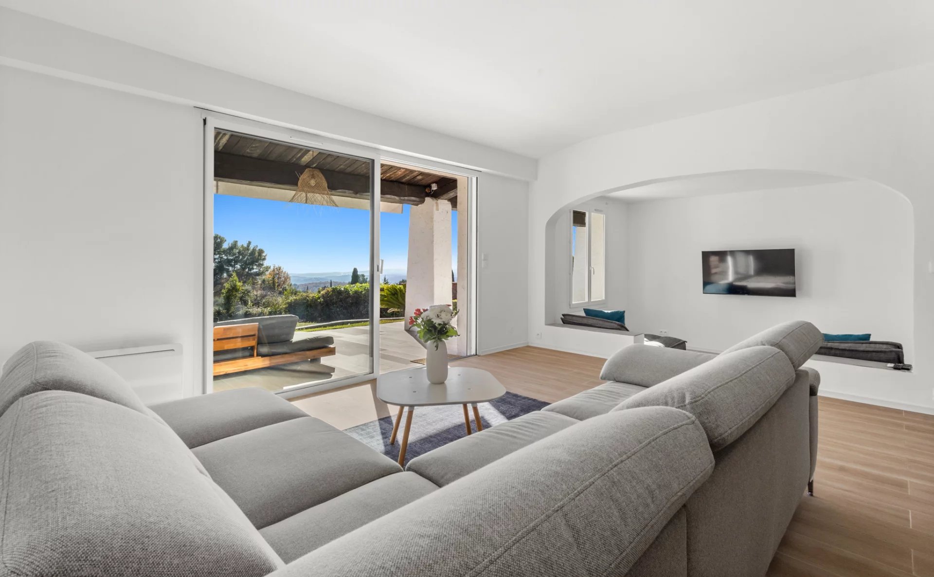 À seulement 10 minutes à pied du village de Tourrettes-sur-Loup, cette superbe villa bénéficie d’une magnifique vue mer et offre un cadre de vie paisible, au calme absolu. Édifiée sur un terrain plat de 3 000 m², la propriété jouit d’un environnement rare et privilégié. La villa se compose de trois chambres et trois salles d’eau, dont une suite parentale à l’étage avec terrasse privative. Les espaces de vie sont généreux et lumineux, avec une grande cuisine entièrement équipée, ouverte sur un vaste séjour et une salle à manger, ainsi qu’un agréable coin détente aménagé. À l’extérieur, une terrasse couverte permet de profiter de l’ombre durant les mois d’été, tandis que la piscine chauffée de 10 × 5 m assure un confort optimal tout au long de l’année. La villa est entièrement climatisée et bénéficie d’une exposition sud-ouest, garantissant une luminosité et un ensoleillement remarquables. La propriété dispose également d’un double garage, offrant un potentiel de transformation selon vos besoins, ainsi que de trois places de stationnement extérieures. Idéale aussi bien en résidence principale que pour un investissement locatif, avec chiffres locatifs disponibles sur demande. Année de construction : 1985 Raccordement au tout-à-l’égout