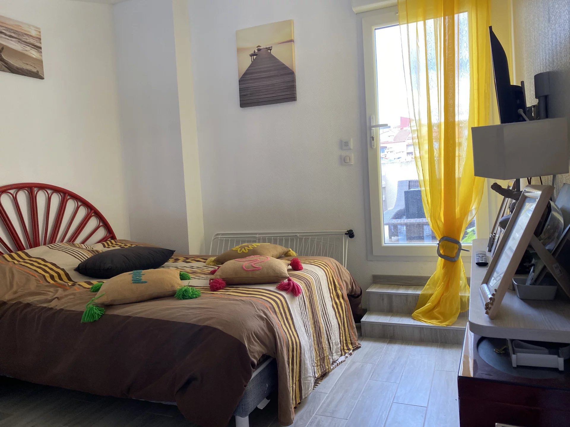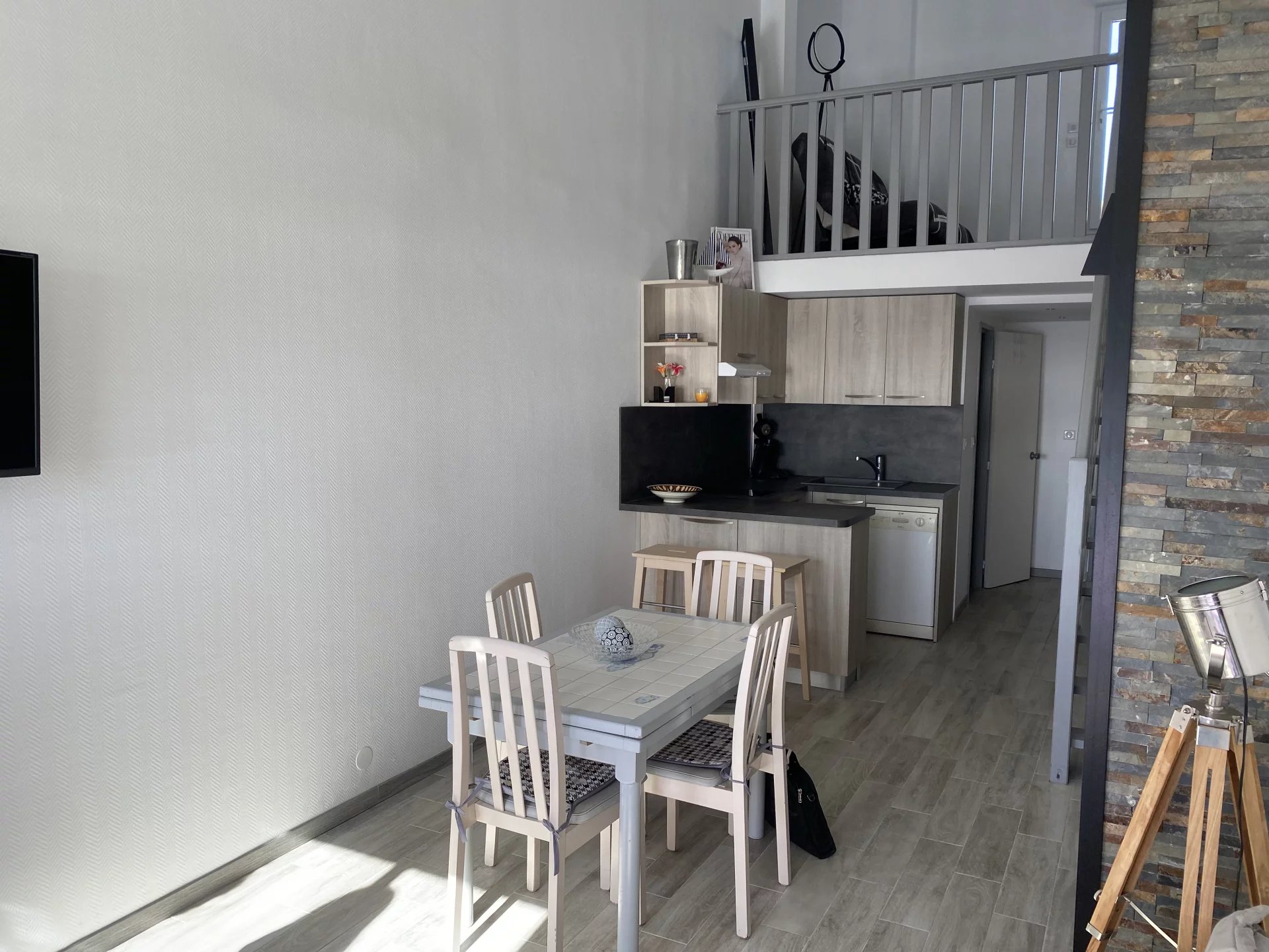 RARE - Superbe T2 traversant au dernier étage 3/3 exposé plein sud avec vue sur le quai St Martin, le port et la mer. A 10 mns à pied des plages et 200 mètres du centre port. Il est composé à l'entrée d'un placard, d'une salle d'eau avec une grande douche et un WC, une cuisine ouverte et équipée (four, réfrigérateur, congélateur, lave-vaisselle, plaque et hotte, micro-ondes). Celle-ci donne sur une belle pièce de vie dôtée d une climatisation avec sa grande baie vitrée pour admirer le panorama. A l'arrière une très grande chambre avec double placard vitré, climatisation réversible et un retour pour un bureau. A l'étage une grande mezzanine de 13 m2 et une large terrasse de 20m2 . Place de parking privée