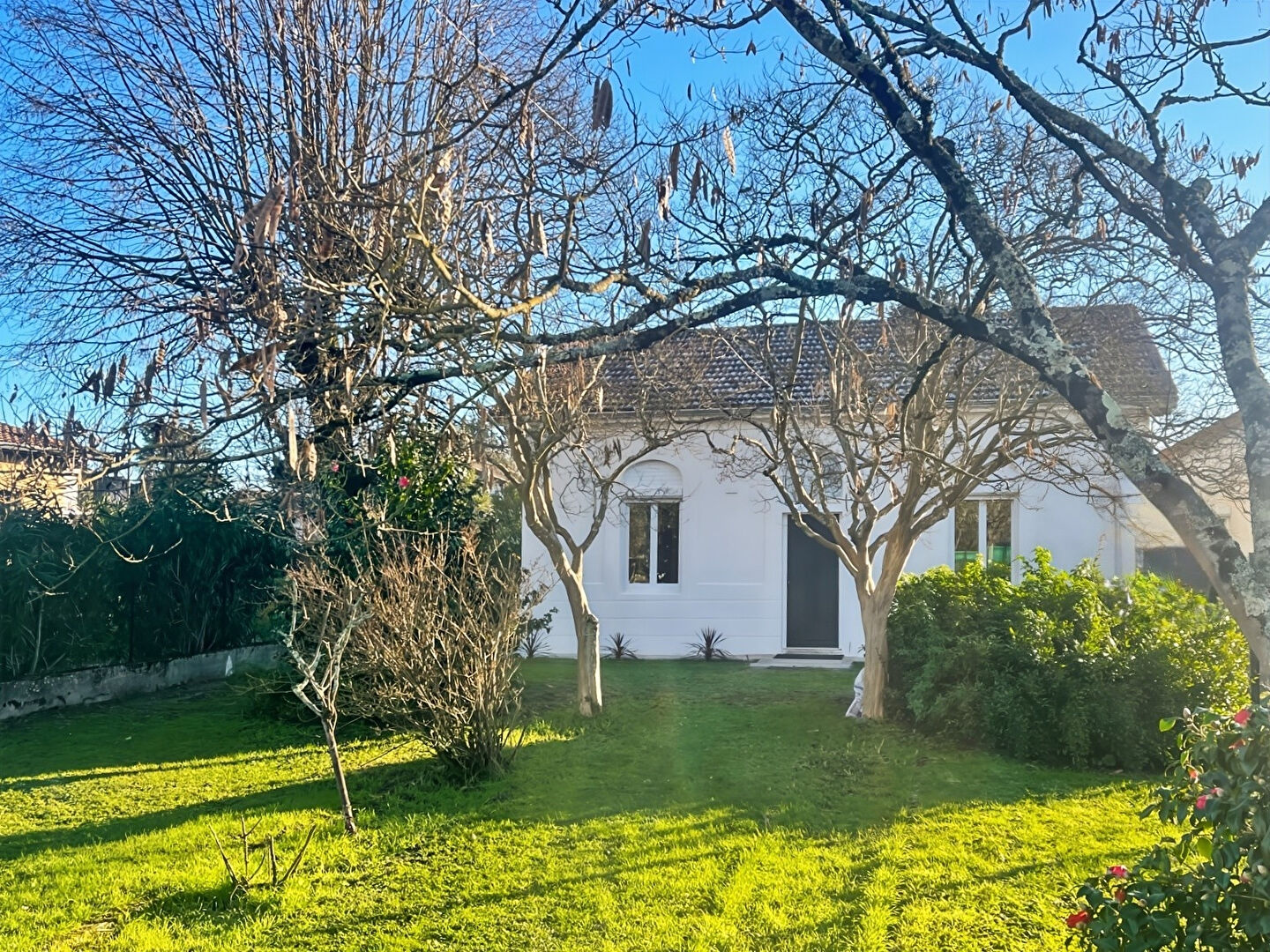 MERIGNAC Limite Cauderan Superbe echoppe de plain-pied entierment rénovée avec envirion 438m² de terrain. Entrée, séjour donant sur une belle terrasse arrière sans aucun vis-à-vis. 3 chambres dont une suite parentale, salle de bains, wc. Climatisation gainable, joli jardin arboré piscinable, volets roulants electrique, Garantie dommage ouvrage.