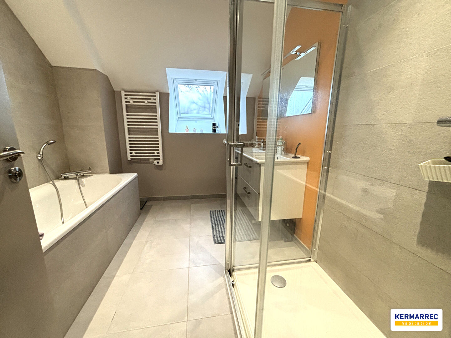 UNIQUEMENT CHEZ KERMARREC - Dans un lotissement à Saint-M'Hervé, A VENDRE maison contemporaine de 2010 construite en briques et ardoises naturelles exposée EST-SUD-OUEST comprenant une entrée avec un placard, un salon-séjour avec une cuisine aménagée et équipée, un buanderie, une chambre, une salle d'eau, un wc. A l'étage, une mezzanine, 4 chambres avec placards, une salle de bains avec douche, un wc. Un double garage avec porte électrique et grand grenier au-dessus pouvant être aménagé. Belle terrasse. Le tout sur un terrain d'environ 1000 m² clos. Cour bitumée. Classe énergie : C - Prix 308 400 euros HAI - Réf.3154 (4.54 % honoraires TTC à la charge de l'acquéreur.) Didier RACAPE (EI) Agent Commercial - Numéro RSAC : 812631414 - Rennes.