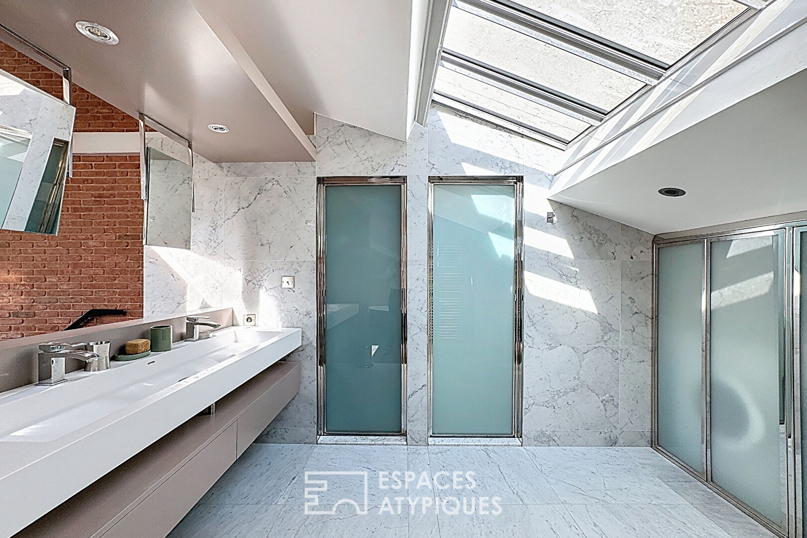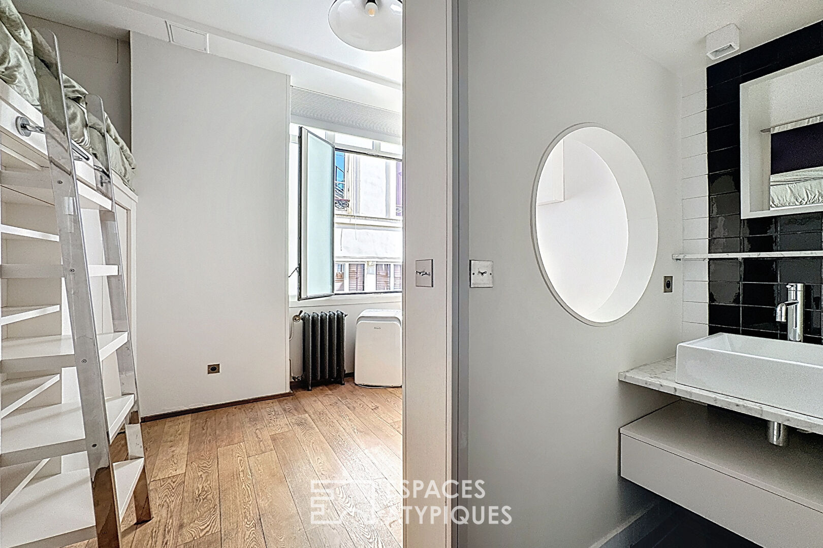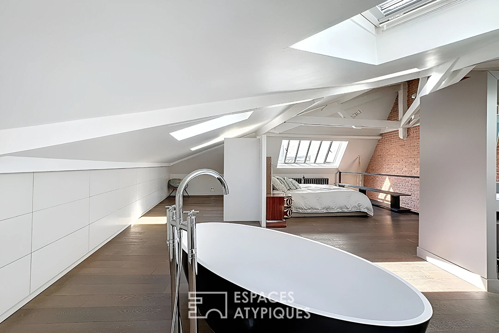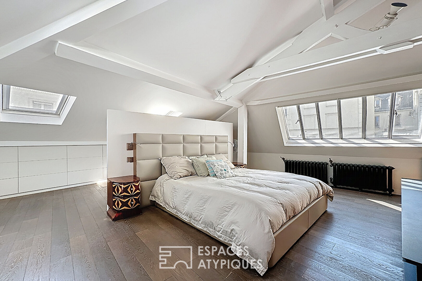 A proximité de la Place des Victoires, au calme d'une cour, ce duplex en dernier étage esprit loft rénové par un architecte d'intérieur de 153,37 m2 (106,10 m2 Carrez) séduit par ses volumes, sa luminosité et la qualité de sa rénovation. Il se situe au deuxième étage par escaliers d'une copropriété bien entretenue avec gardienne. Dès l'entrée, la vaste pièce de vie profite de nombreuses fenêtres qui inondent l'espace de clarté et mettent en valeur le séjour ainsi que la cuisine ouverte. Les briques rouges apparentes, le parquet à chevrons en chêne massif et la cheminée à gaz viennent réchauffer l'atmosphère. Côté nuit, le premier niveau accueille une première chambre avec sa propre salle d'eau et des toilettes séparées. L'étage est quant à lui entièrement consacré à une suite de maître en open space intégrant tout le confort nécessaire : chambre sous verrières, salle de douche avec toilettes et double vasque, élégante baignoire hors sol contemporaine, nombreux agencements de dressing intégrés? Un bien rare dans le quartier, à proximité immédiate du Sentier et de ses adresses animées, tout en préservant le calme d'une cour protégée. Une cave complète ce bien soumis au régime de copropriété. Métro Bourse (ligne 3) Contact : Joachim + 33 6 23 54 34 32 (4.08 % honoraires TTC à la charge de l'acquéreur.) Copropriété de 65 lots - dont 38 lots habitation. (Pas de procédure en cours). Charges annuelles : 4500 euros. JOACHIM DRUART (EI) Agent Commercial - Numéro RSAC : 838 692 671 - Paris.