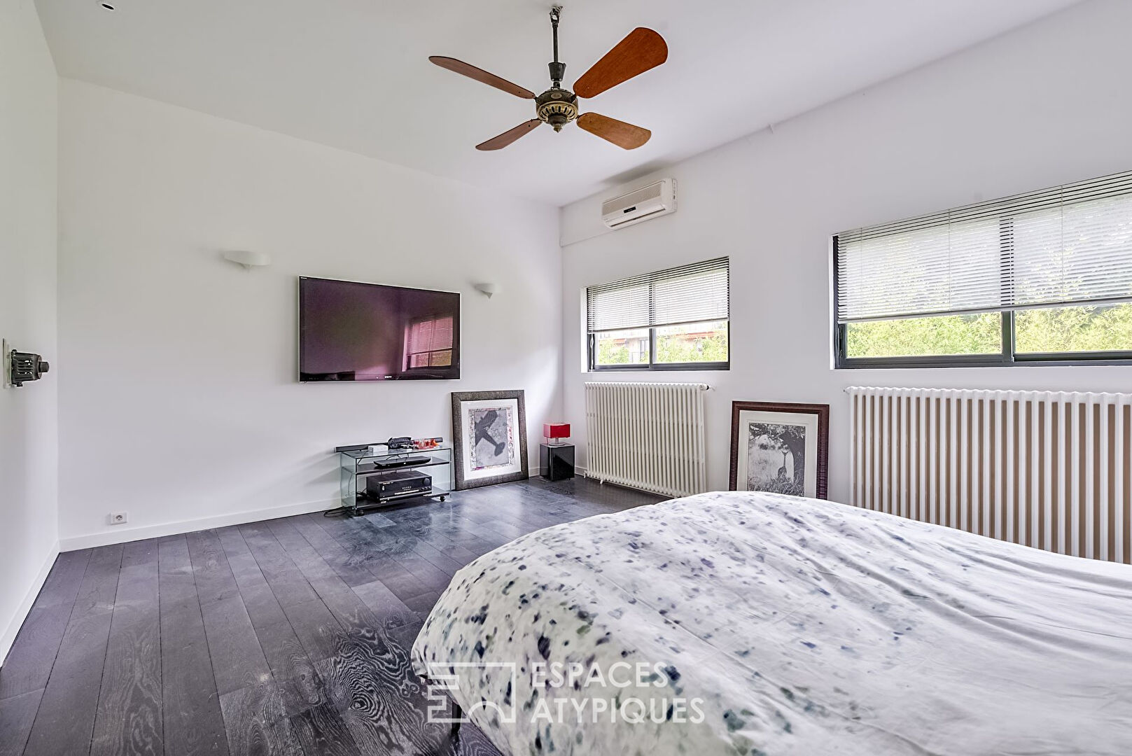 A proximité immédiate des Bords de Marne, ce lieu d'exception à la structure de type Eiffel, puise son histoire dans l'exposition universelle de 1900. Ce véritable loft est en pleine propriété et développe une surface totale de 407 m² réparti sur deux niveaux. Le rez-de-chaussée se compose d'un hall donnant accès à une monumentale pièce de vie traversante de 135 m², ouverte sur une bambouseraie. Aménagée en open-space, cette pièce bénéficie d'une installation audio avec cabine DJ. Elle distribue, d'un côté, une cuisine équipée de 35 m² donnant sur une terrasse et de l'autre une salle de douche avec toilette et sauna. L'étage propose un vaste espace ouvert, distribuant une salle de sport, un bureau, une salle de douche avec wc et buanderie, un dressing ainsi que trois grandes chambres dont l'une imaginée comme un îlot central. Verrière et fenêtres assurent à l'ensemble du volume une luminosité rare tout au long de l'année. Un garage et une place de parking complètent ce bien. Bords de Marne : 100 mètres RER E : Nogent - Le Perreux CLASSE ÉNERGIE: D CLASSE CLIMAT: C Montant moyen estimé des dépenses annuelles d'énergie pour un usage standard, établi à partir des prix de l'énergie de l'année 2021 entre: 4440 euros et 6090 euros. Les informations sur les risques auxquels ce bien est exposé sont disponibles sur le site Géorisques : https://www.georisques.gouv.fr Contact: Camille - 06 66 78 90 24 - Agent commercial - RSAC: 934 726 043 Créteil Camille DEFOSSEZ (EI) Agent Commercial - Numéro RSAC : 934 726 043 - Créteil.