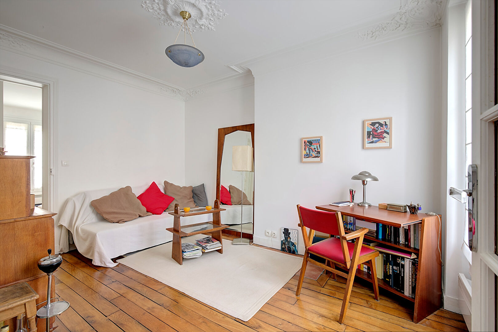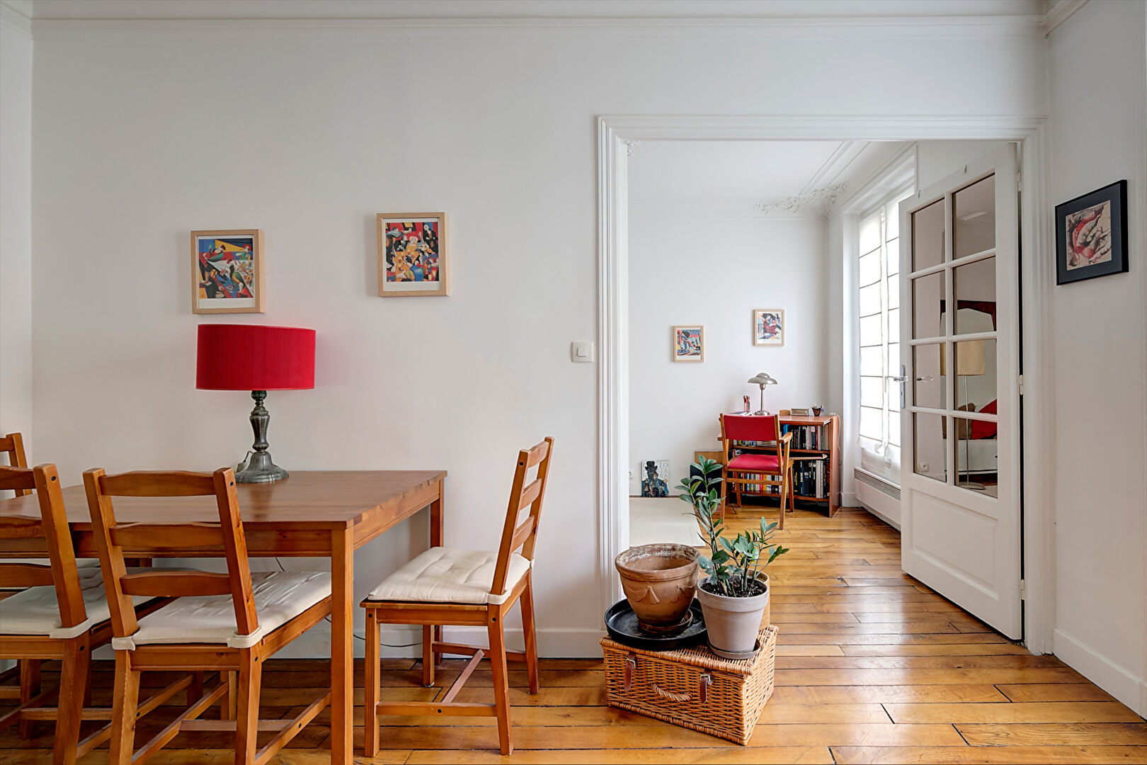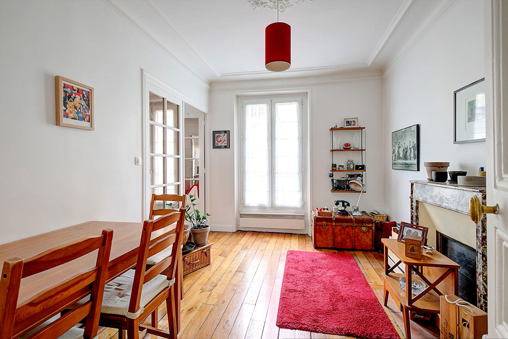 Paris 18 eme / Village Ramey / Rue Eugène Sue Au coeur du très recherché village Ramey, à quelques pas de Jules Joffrin et de ses commerces, découvrez ce charmant appartement 2/3 pièces traversant de 45 m², ayant conservé tout le cachet de l'ancien. Situé au 4 eme étage d'un bel immeuble en pierre de taille avec gardienne, il se compose d'une entrée, d'un double séjour de 25m², d'une chambre au calme sur cour avec rangements, d'une cuisine indépendante et d'une salle de bains avec WC. (possibilités de 2eme chambre) La disposition en étoile, particulièrement agréable à vivre, offre une belle luminosité grâce à une double exposition et cinq fenêtres. Parquet en chêne, cheminée et moulures soulignent le caractère authentique de ce bien. Deux caves saines complètent l'ensemble. Copropriété bien entretenue. Un appartement de charme, idéalement situé, au coeur d'un quartier vivant et convivial. Copropriété de 146 lots - dont 102 lots habitation. (Pas de procédure en cours). Charges annuelles : 2300 euros.