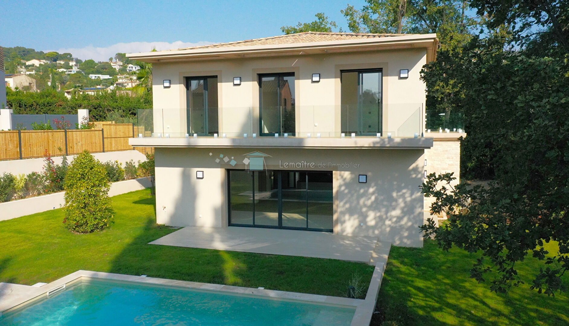 * Mougins Secteur Pibonson grande bastide, domaine privé comprenant 3 villas sécurisées * Superbe villa californienne neuve, en frais de notaire réduits, de 160 m² avec ascenseur, bâtie sur un terrain plat de 1055 m² au calme et proche des axes principaux. Bénéficiant de prestations haut de gamme, cette villa dispose d'une cuisine équipée et aménagée ouvrant sur un vaste espace de réception de 68 m² donnant avec une grande baie en galandage sur la terrasse et son espace piscine balnéo. buanderie, cave a vin en verre. A l'étage : 3 chambres dont 1 suite parentale avec salle de douche et dressing avec une terrasse de 10 m², une salle de bains et douche, un wc. Garage de 20 m² , chauffage par pompe à chaleur et ballon thermodynamique. Garantie dommage ouvrage, RE 2020 finitions en cours pour fin octobre. A voir rapidement...