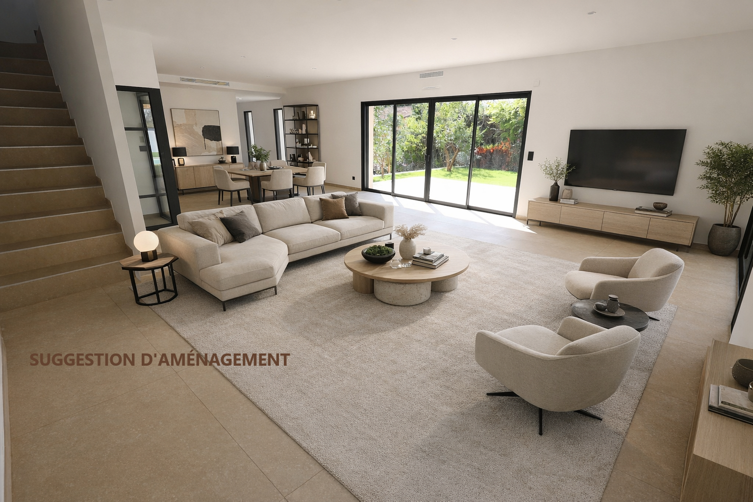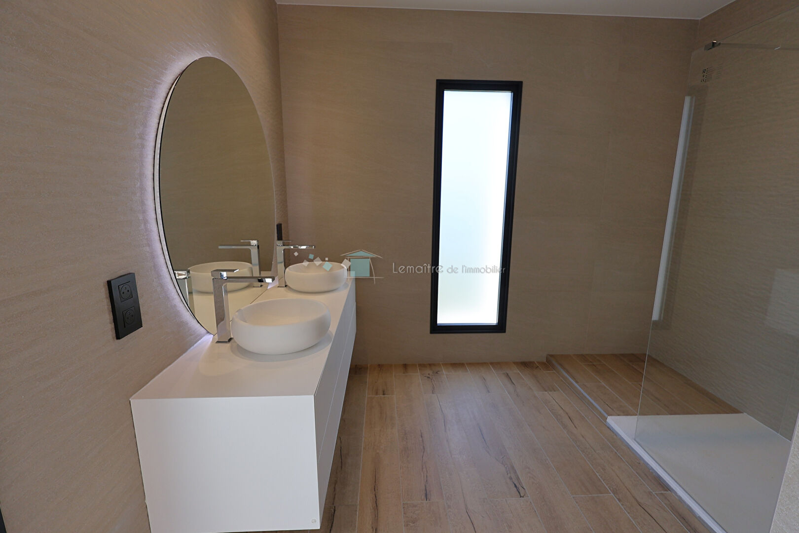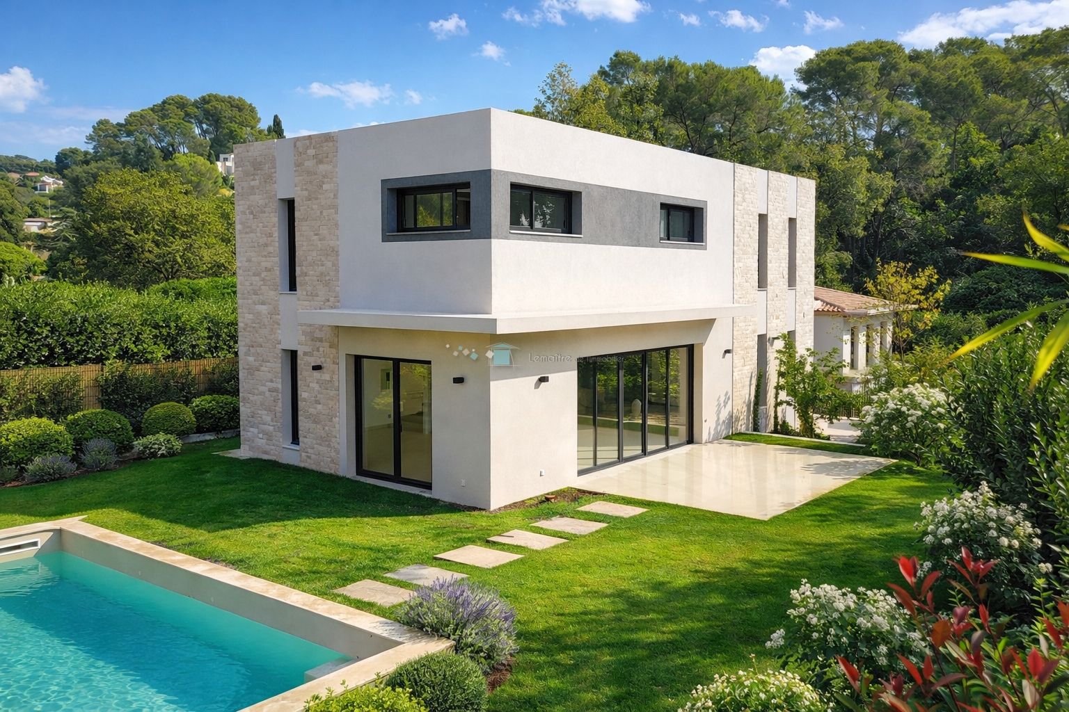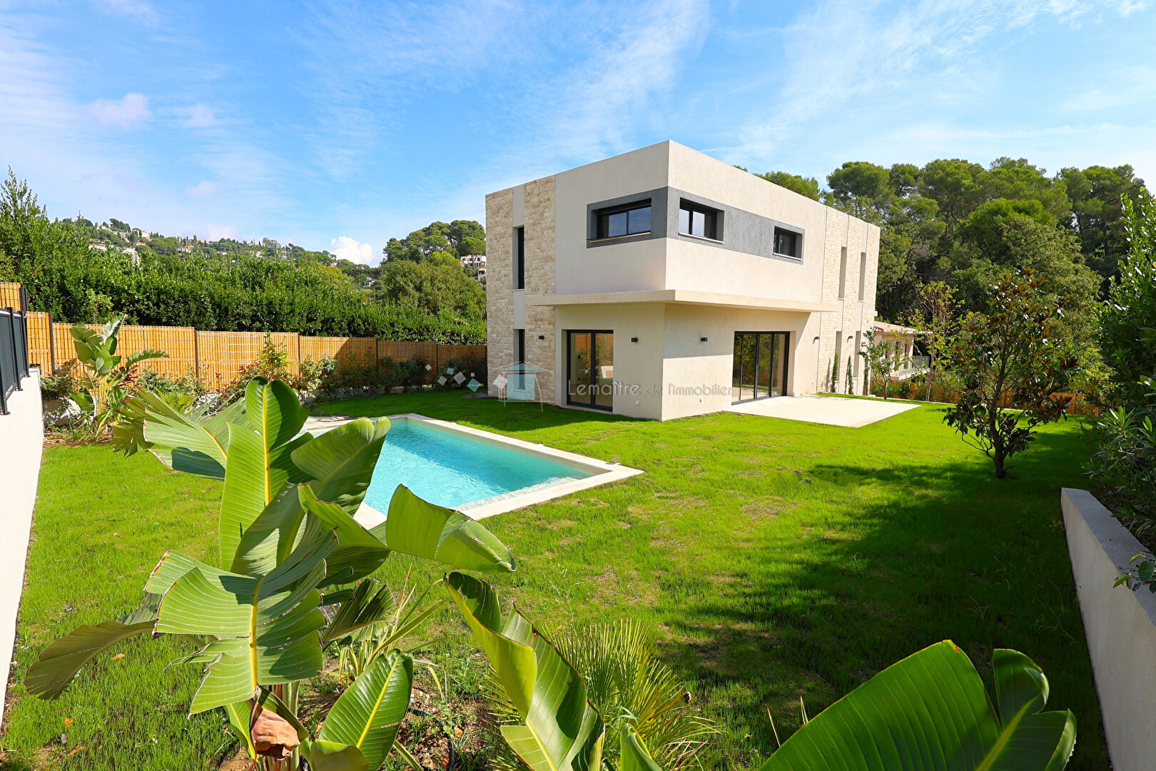 * Mougins Secteur Pibonson grande bastide, domaine privé de 3 villas sécurisées * Superbe villa (2) californienne NEUVE en frais de notaire réduits de 170 m² avec ascenseur, bâtie sur un terrain plat de 1080 m² au calme, proche des axes principaux. Bénéficiant de prestations haut de gamme, cette villa dispose d'une cuisine équipée et aménagée ouvrant sur un vaste espace de réception de 77 m² grandes baies vitrées en galandages donnant sur la terrasse et son espace piscine balnéo. A l'étage : 3 chambres dont 1 suite parentale avec salle de bain et dressing avec terrasse, une salle de bains et douche, un wc. Garage de 20 m² , chauffage par pompe à chaleur et ballon thermodynamiques. Garantie dommage ouvrage, RE 2020 finitions en cours pour fin octobre. Rare sur le secteur...