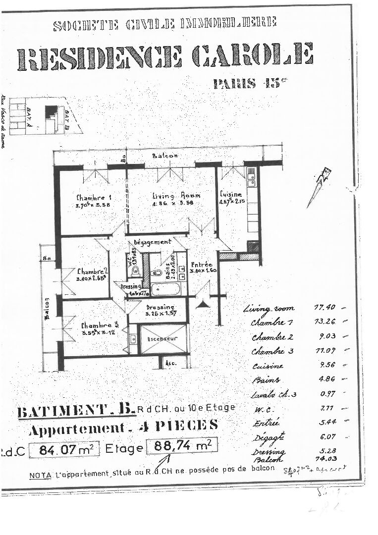 Rue Vasco de Gama (Métro Balard ou Pte de Versailles) immeuble récent de bon standing avec gardien, espaces verts, ascenseur, chauffage collectif, au 6ème étage appartement composé d'une entrée, cuisine aménagée, séjour prolongé d'un balcon, dégagement, salle de bains, wc séparés, 3 chambres, chauffage collectif, cave, parking