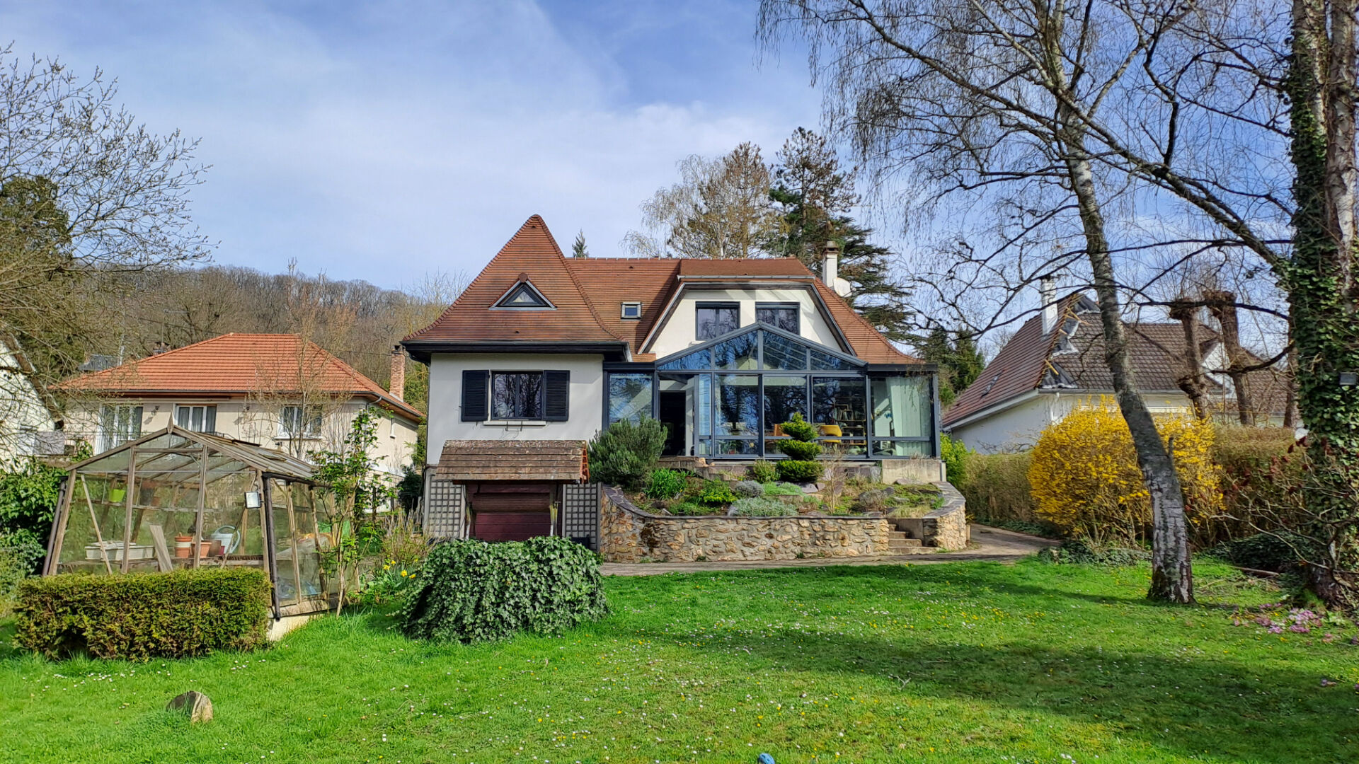 Belle maison de 185m² au sol pour 165m² habitables, entièrement rénovée en 2019, sans vis-à-vis et face à la forêt, proche de toutes les commodités comprenant au rez de chaussée : une spacieuse véranda donnant sur un séjour avec un poêle à bois et une cuisine ouverte entièrement aménagée et équipée, un couloir desservant 2 chambres avec placards, une salle de bains, et un WC. A l'étage : un palier vous mènera vers 2 chambres, dont une avec espace coiffeuse et un grand dressing possédant de nombreux rangements, une salle de bains + douche et un WC. Un sous-sol total avec un espace buanderie équipé d'un point d'eau, un garage de 25 m² avec une porte automatique et un local jardin. Chauffage gaz, fenêtres doubles vitrage PVC et aluminium, volets électriques et volets battants, climatisation et chauffage au sol dans la véranda. Terrain de 1303 m², un barbecue, une exposition plein Sud, un puit, un rangement extérieur pour le bois. Gare RER B et centre ville à 15 min à pied. Les informations sur les risques auxquels ce bien est exposé sont disponibles sur le site Géorisques : www.georisques.gouv.fr
