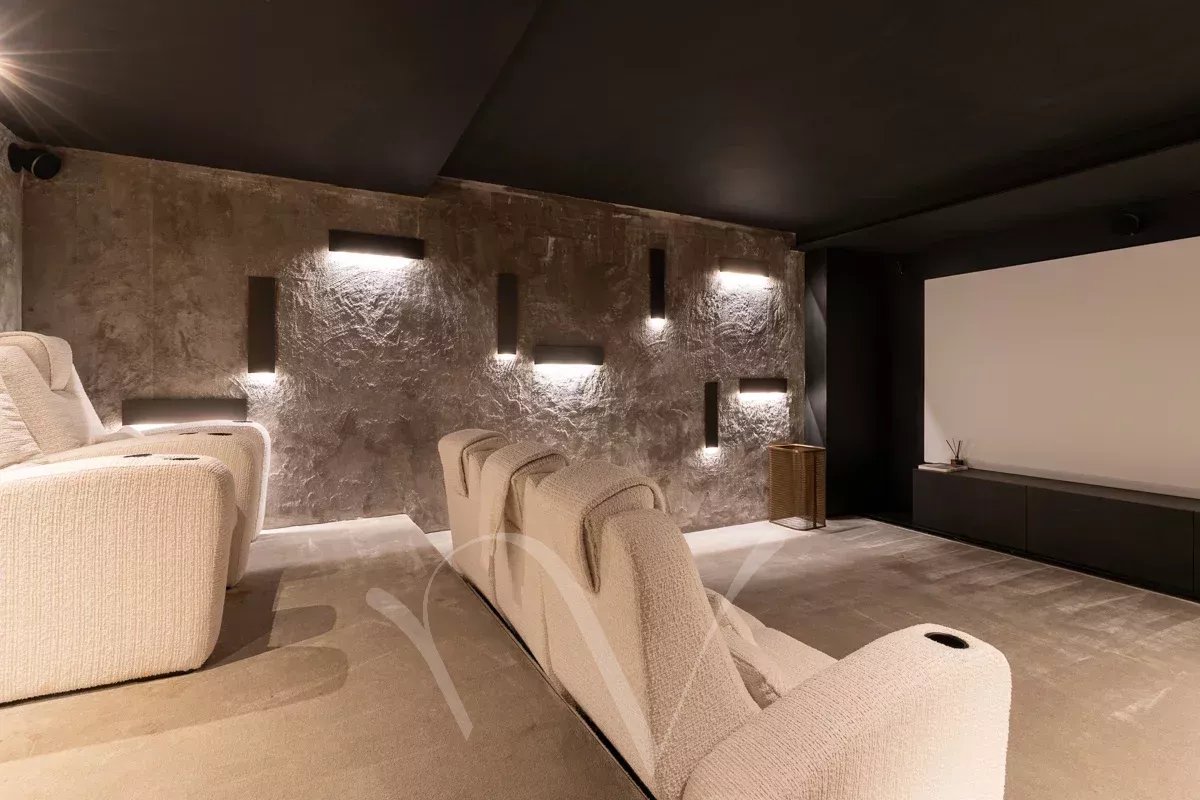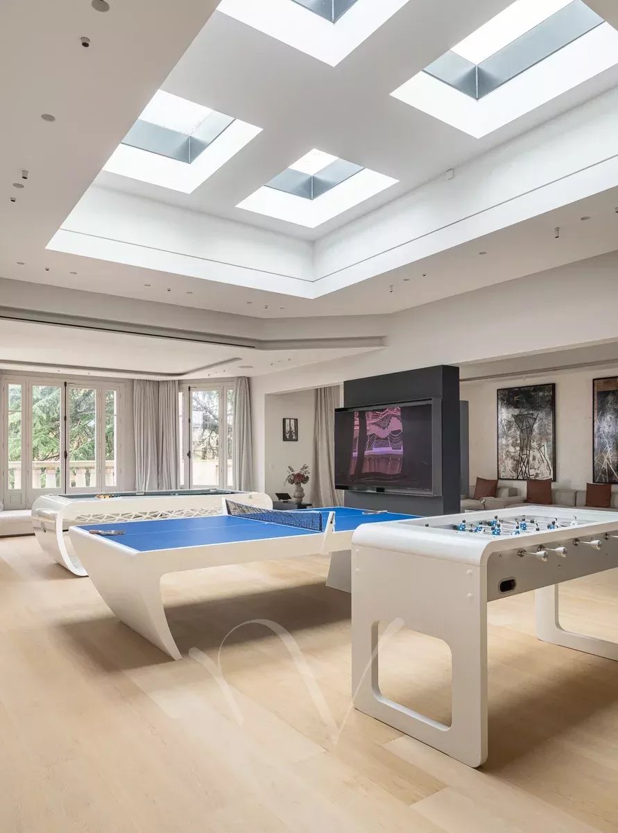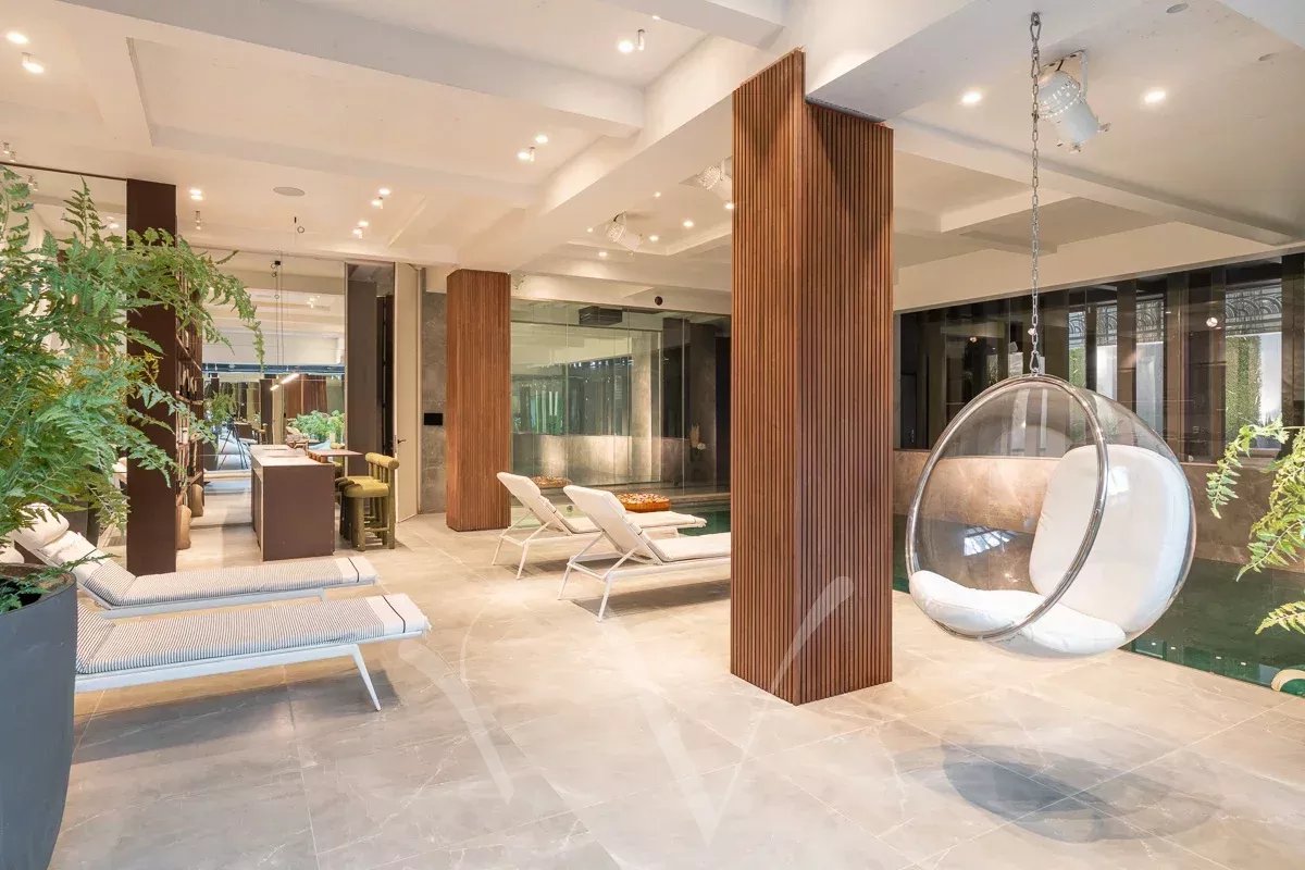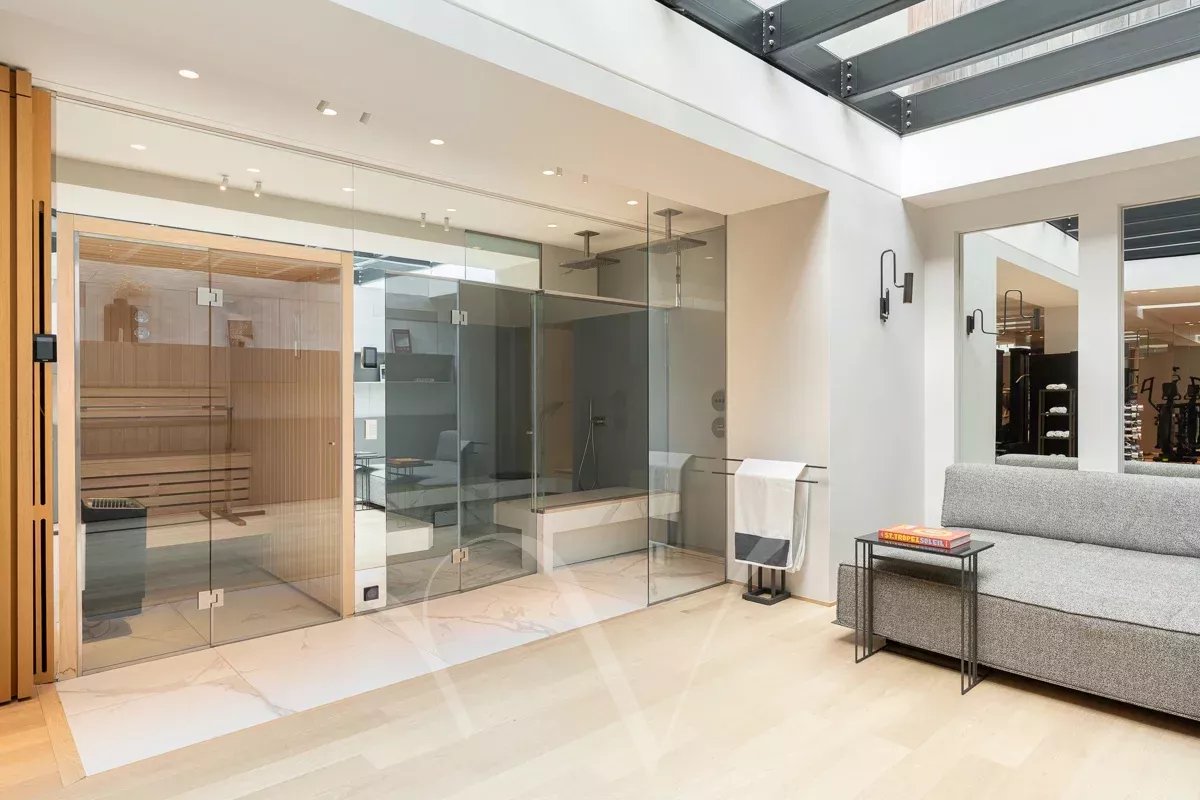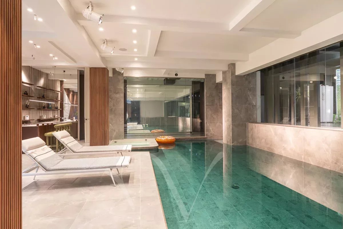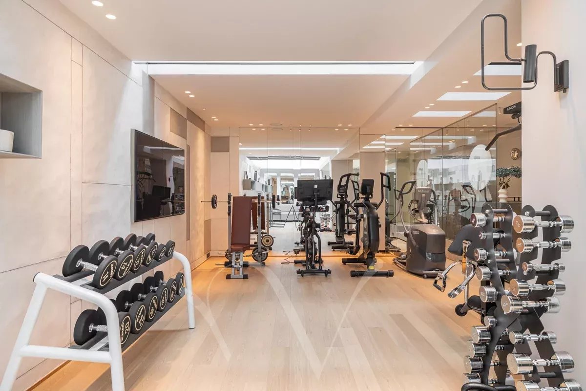 Au sous-sol, une piscine, un espace détente, une salle de sport, un sauna, un hammam et une salle de cinéma.