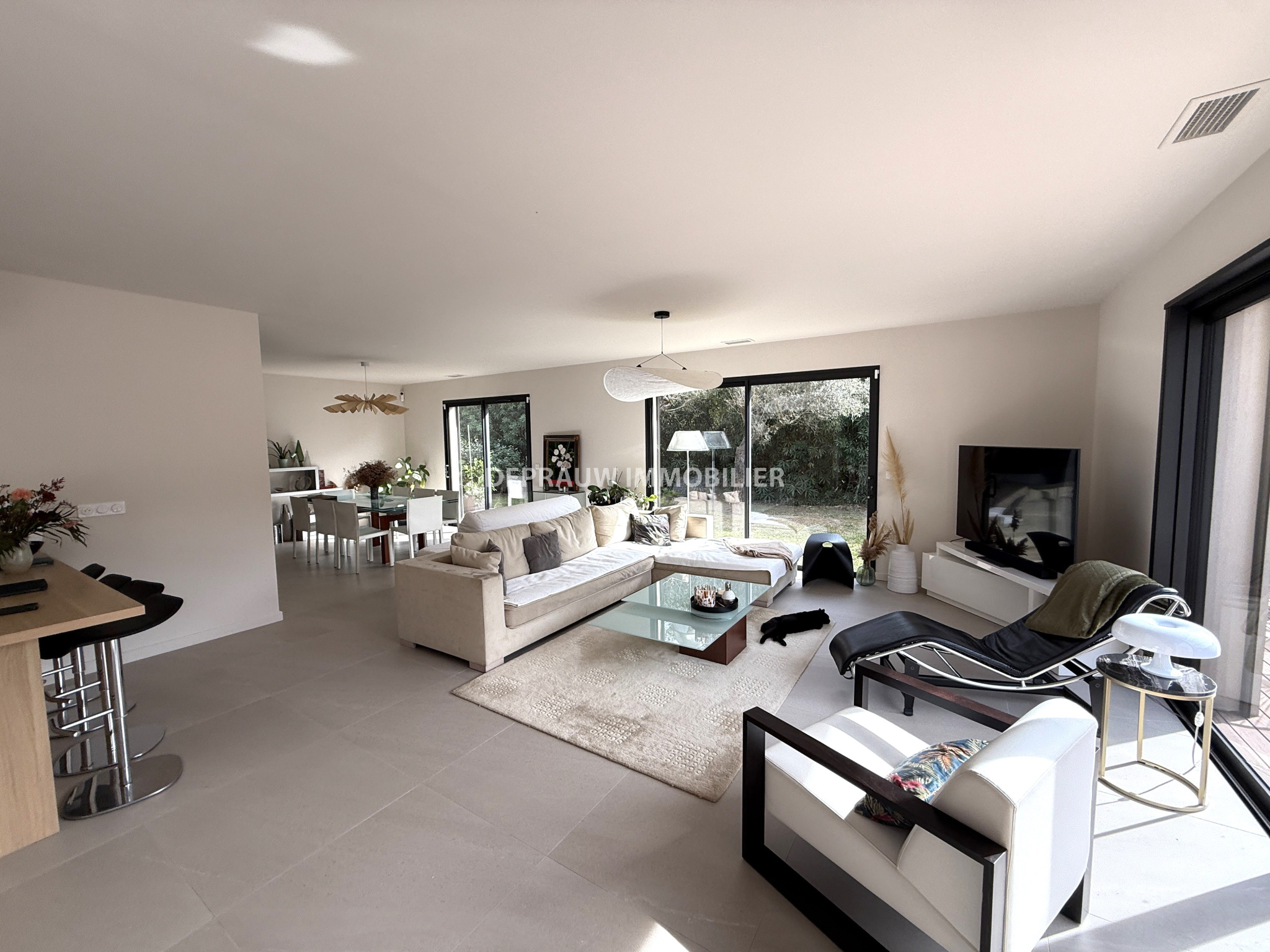 Elle s'organise autour d'une grande pièce de vie lumineuse, composée d'un séjour d'environ 49 m2 et d'une cuisine de 24 m2, ouverts sur l'extérieur grâce à de grandes baies vitrées à galandage. Un bureau attenant à la pièce de vie peut aisément être aménagé en chambre supplémentaire selon les besoins (12 m2). Une entrée et des toilettes avec lave main vous accueillent