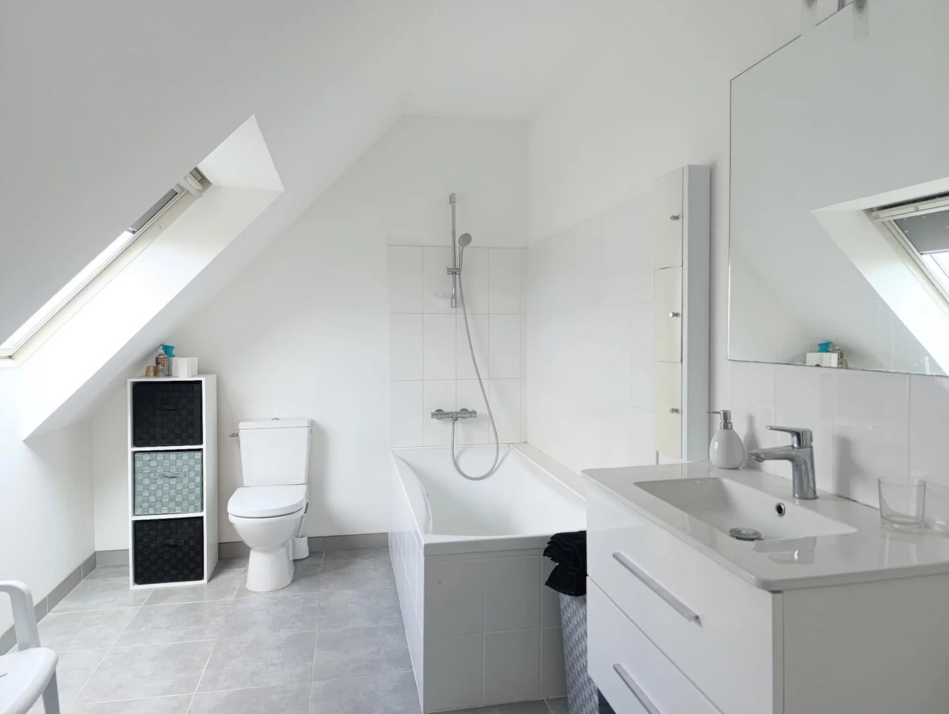 A l'étage : une grande chambre et sa salle de bains.