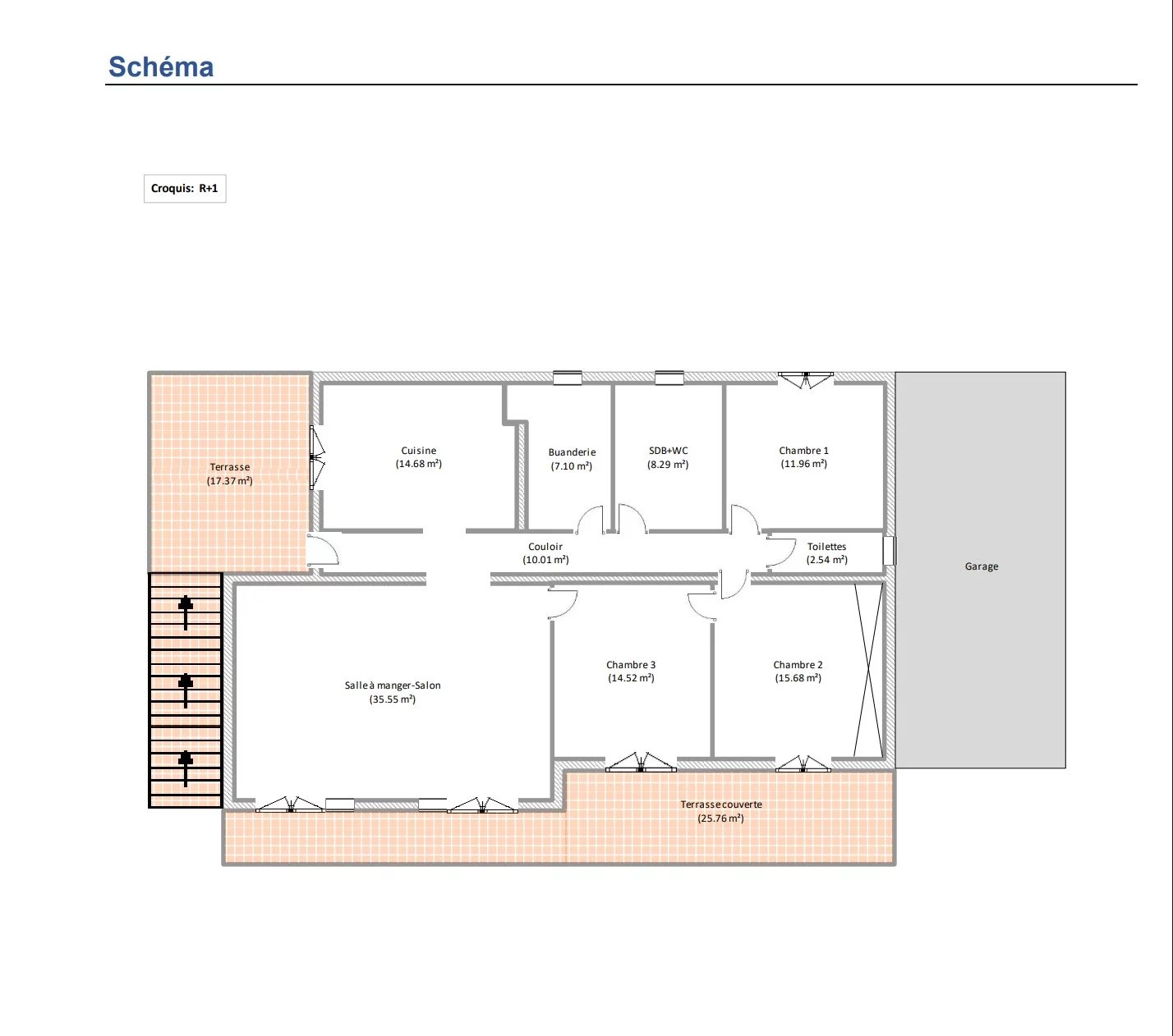 Le rez-de-jardin est composée d'une belle terrasse coté entrée de 17 m², un couloir, une cuisine équipée, un séjour/salon et sa terrasse couverte de 26 m², trois chambres, une buanderie, un