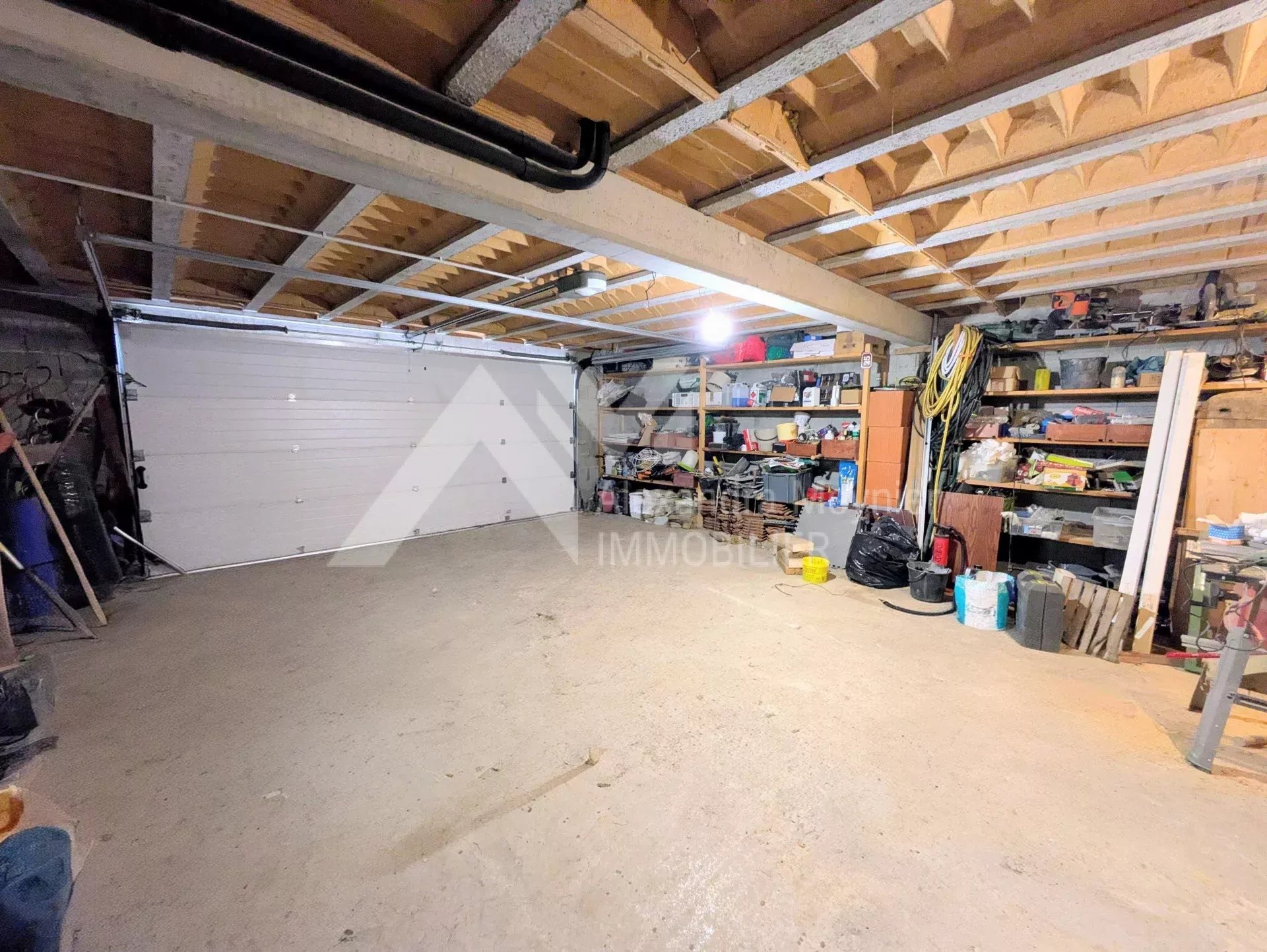 Un sous-sol complet d'environ 140m²: garage avec grande porte motorisée, buanderie, atelier et stockage.