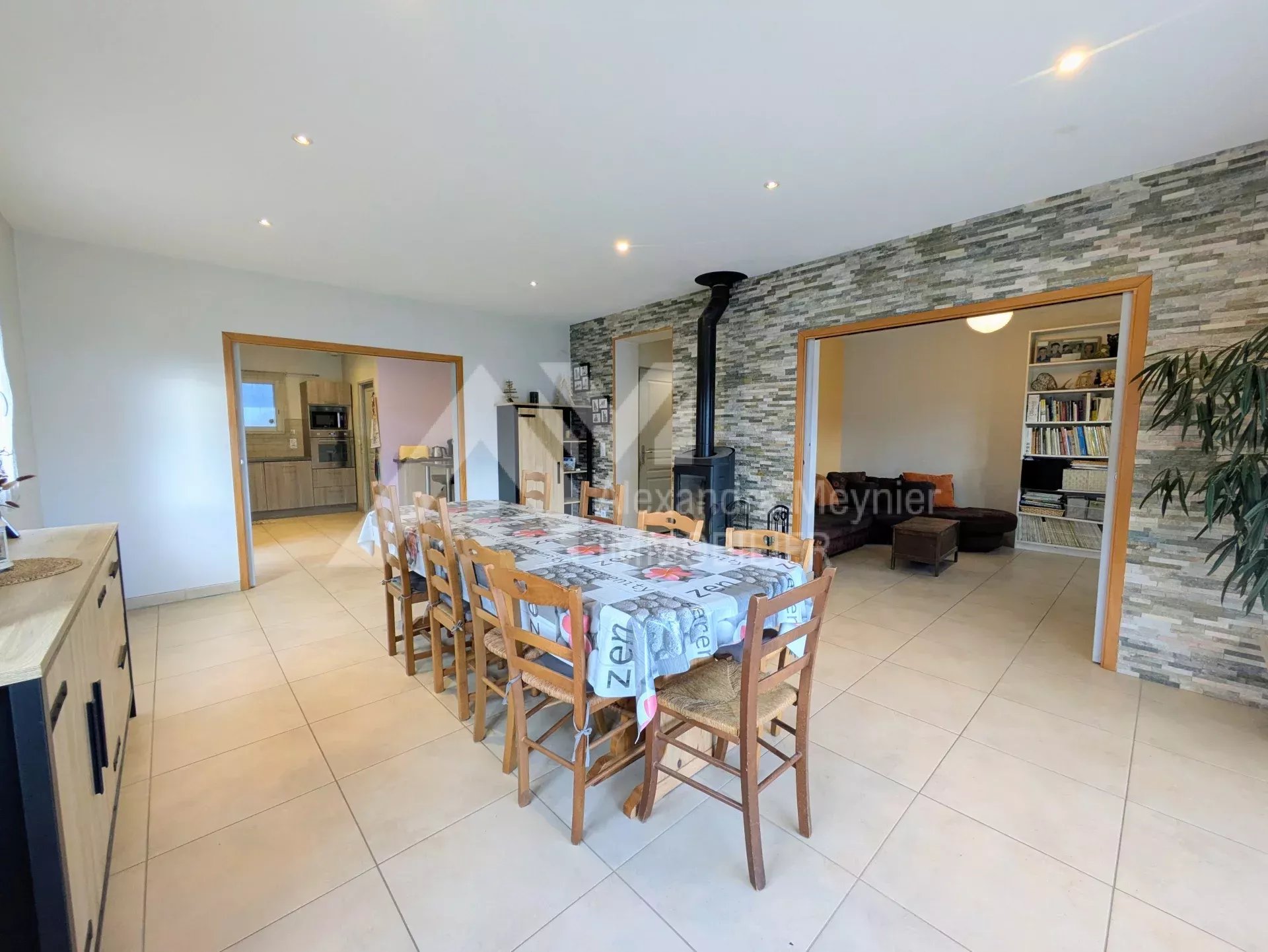 Hall d'entrée, dressing, cuisine équipée avec cellier attenant, ouverte sur une salle à manger et un salon donnant accès à une terrasse couverte. Un dégagement desservant quatre chambres avec placards, salle de bains (baignoire et douche à l'italienne) et toilettes avec lave-mains.