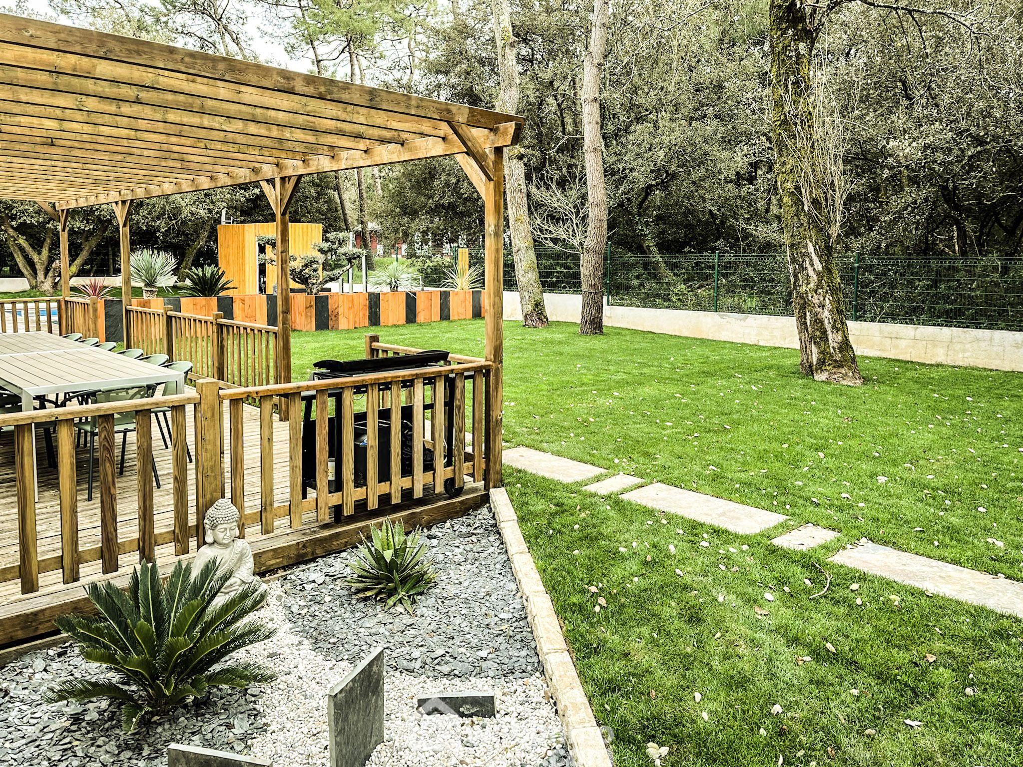 Le plus important c'est que vous pourrez vous prélasser sous les pins de son jardin clos de 1400 m² ou sur votre terrasse pendant les belles journées estivales et vous laissez porter par une farniente totale.