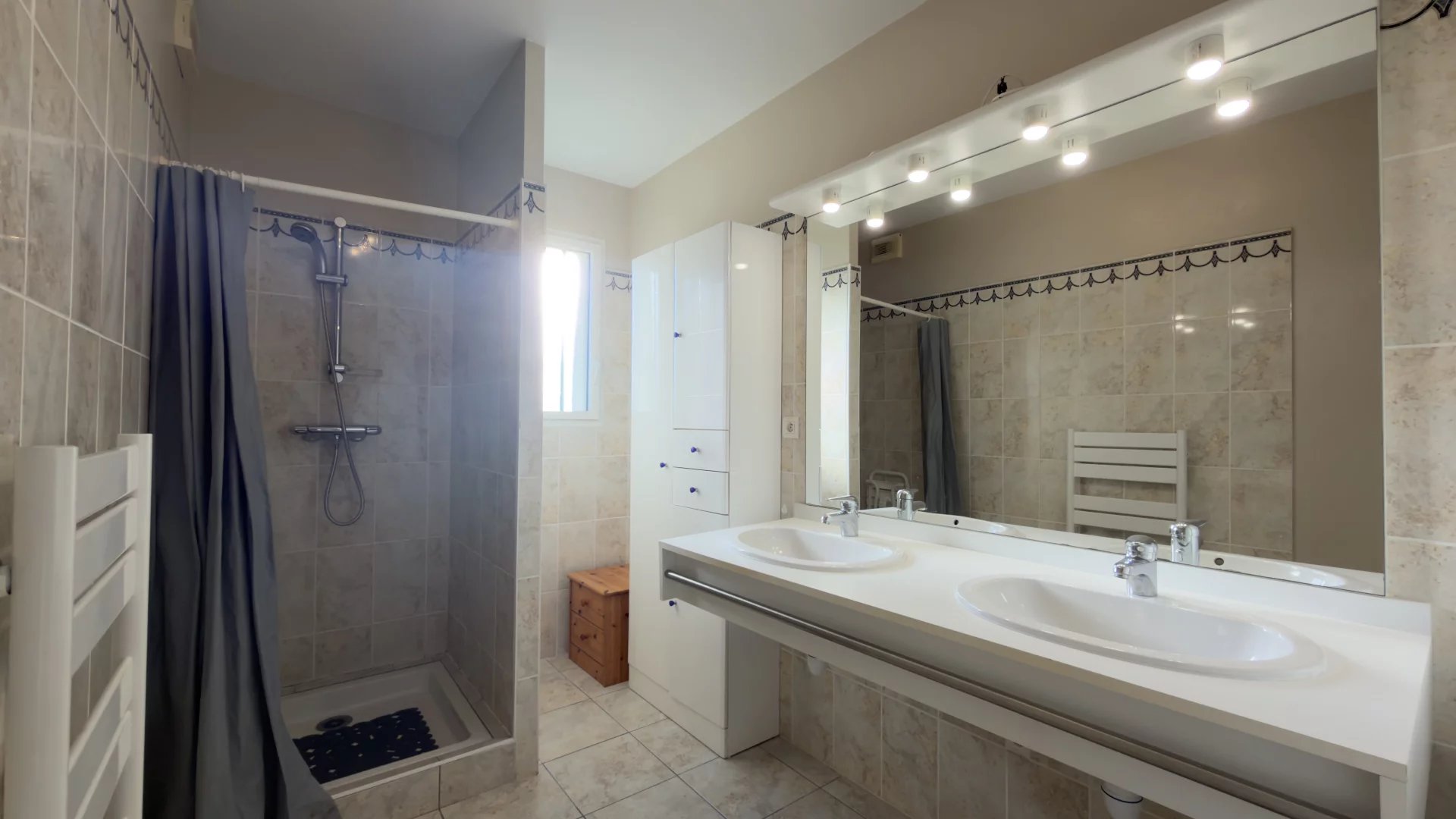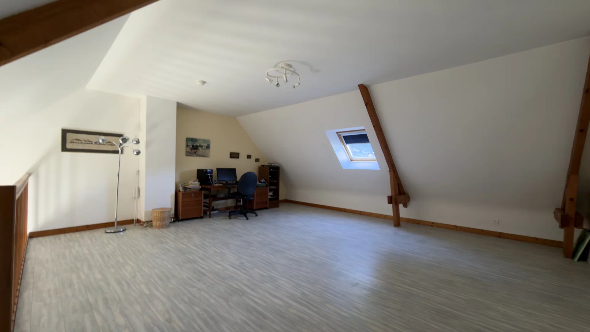 À l’étage, deux chambres supplémentaires, une salle d’eau avec WC et une vaste family-room offrant de multiples possibilités d’aménagement : espace détente, salle de jeux ou chambres complémentaires selon vos besoins.