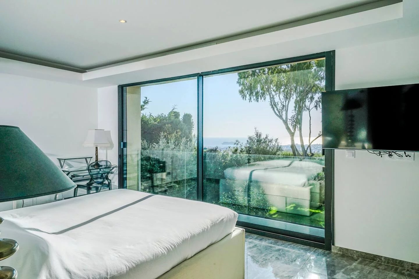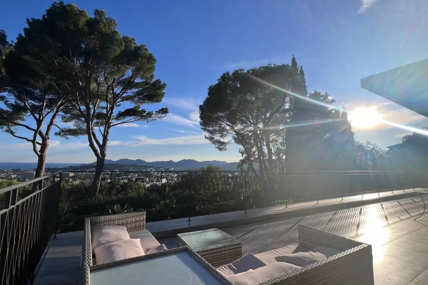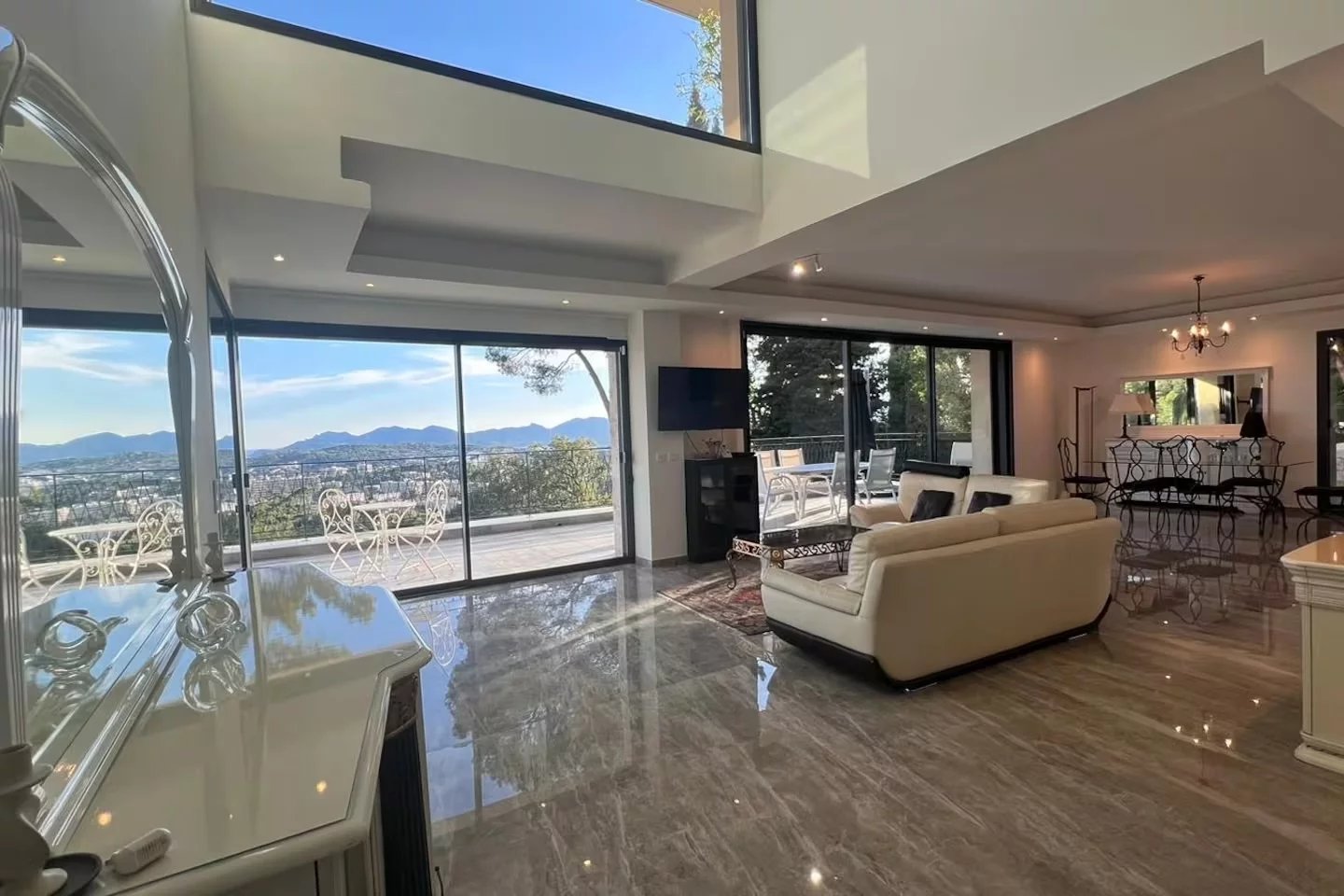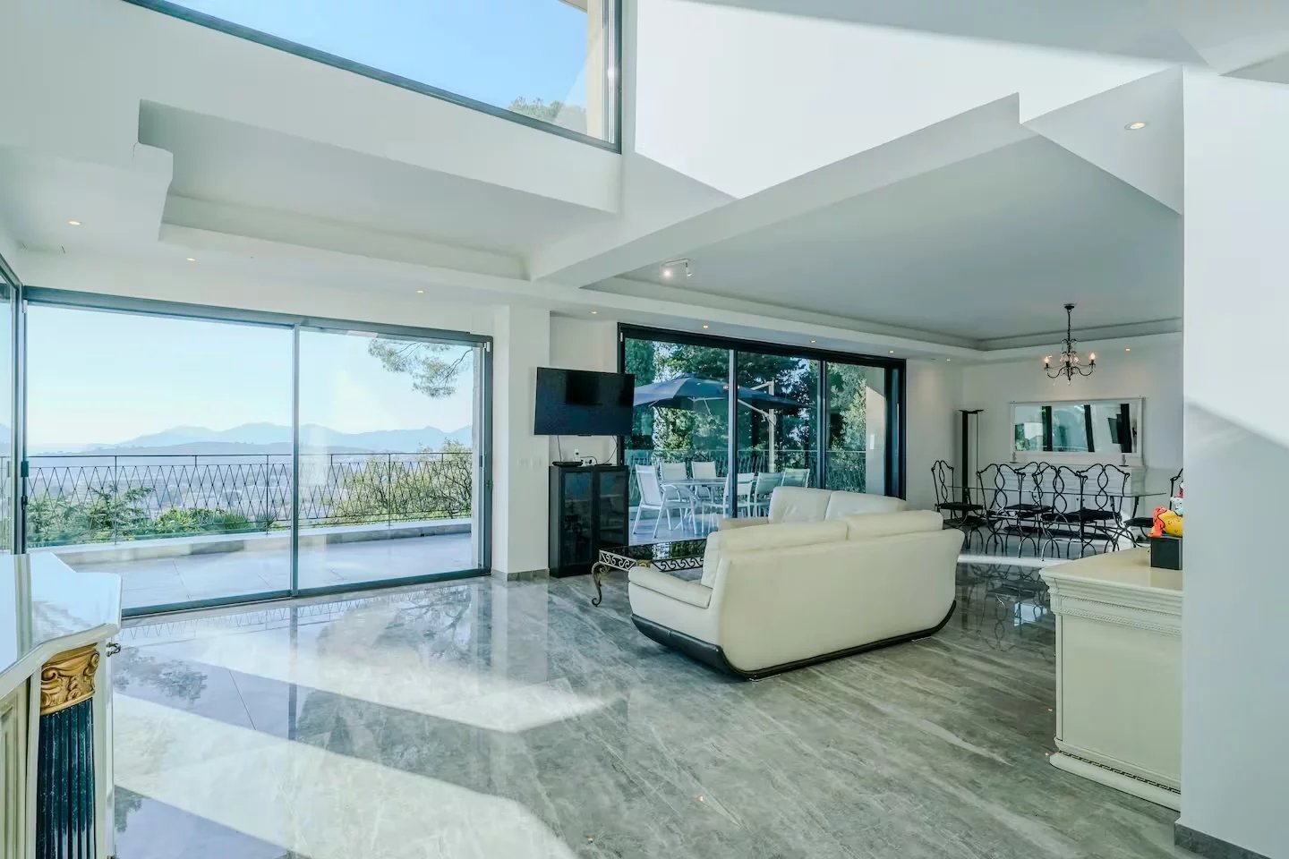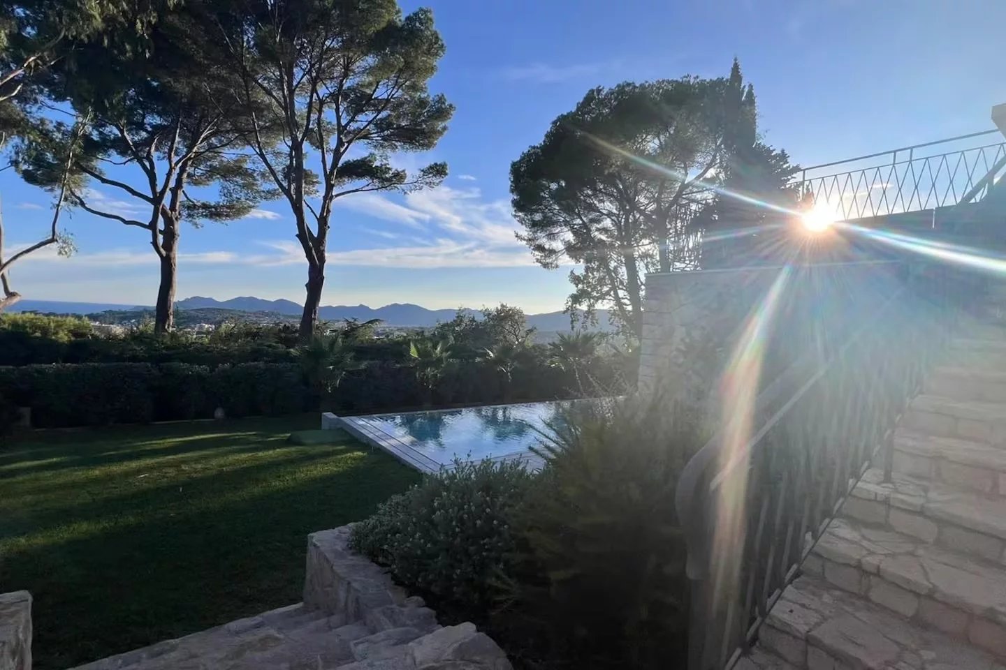Dans un quartier résidentiel prisé de Mougins, cette villa de prestige bénéficie d’une position dominante offrant une vue panoramique exceptionnelle sur la Baie de Cannes. Située à seulement quelques minutes de Cannes et du Palais des Festivals, elle allie parfaitement calme, intimité et proximité des commodités. D’une superficie d’environ 390 m², la propriété est implantée sur un terrain clos et paysager de 2 000 m². Pensée pour mettre en valeur la mer, la villa offre une vue imprenable depuis l’ensemble des pièces, baignant les espaces de lumière naturelle. Répartie sur trois niveaux, elle propose un vaste séjour d’environ 90 m² avec cuisine semi ouverte entièrement équipée, idéal pour recevoir. La villa dispose de six chambres en suite, toutes offrant confort, élégance et vue mer. Une salle vidéo, un hammam et un espace bien être complètent les prestations intérieures. À l’extérieur, de larges terrasses surplombent la Méditerranée. Une piscine chauffée à débordement de 15 x 5 mètres, plusieurs espaces repas et un jardin aménagé invitent à profiter pleinement du cadre et du climat azuréen. Un portail automatique sécurise l’accès à la propriété, qui bénéficie d’un stationnement aisé pour plusieurs véhicules. Cette villa rare incarne un art de vivre raffiné sur la Côte d’Azur, idéale en résidence principale ou secondaire.