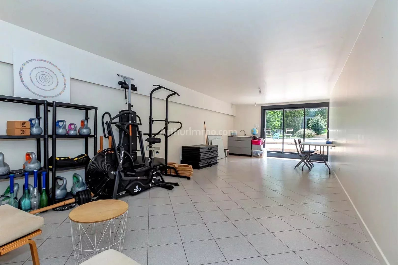 -En demi sous-sol : garage, remise, buanderie, cave, local technique, salle de sport de 40 m² avec toilettes, salle d'eau, donnant directement sur l'extérieur et la piscine. Cet espace peut facilement être aménagé en studio indépendant.