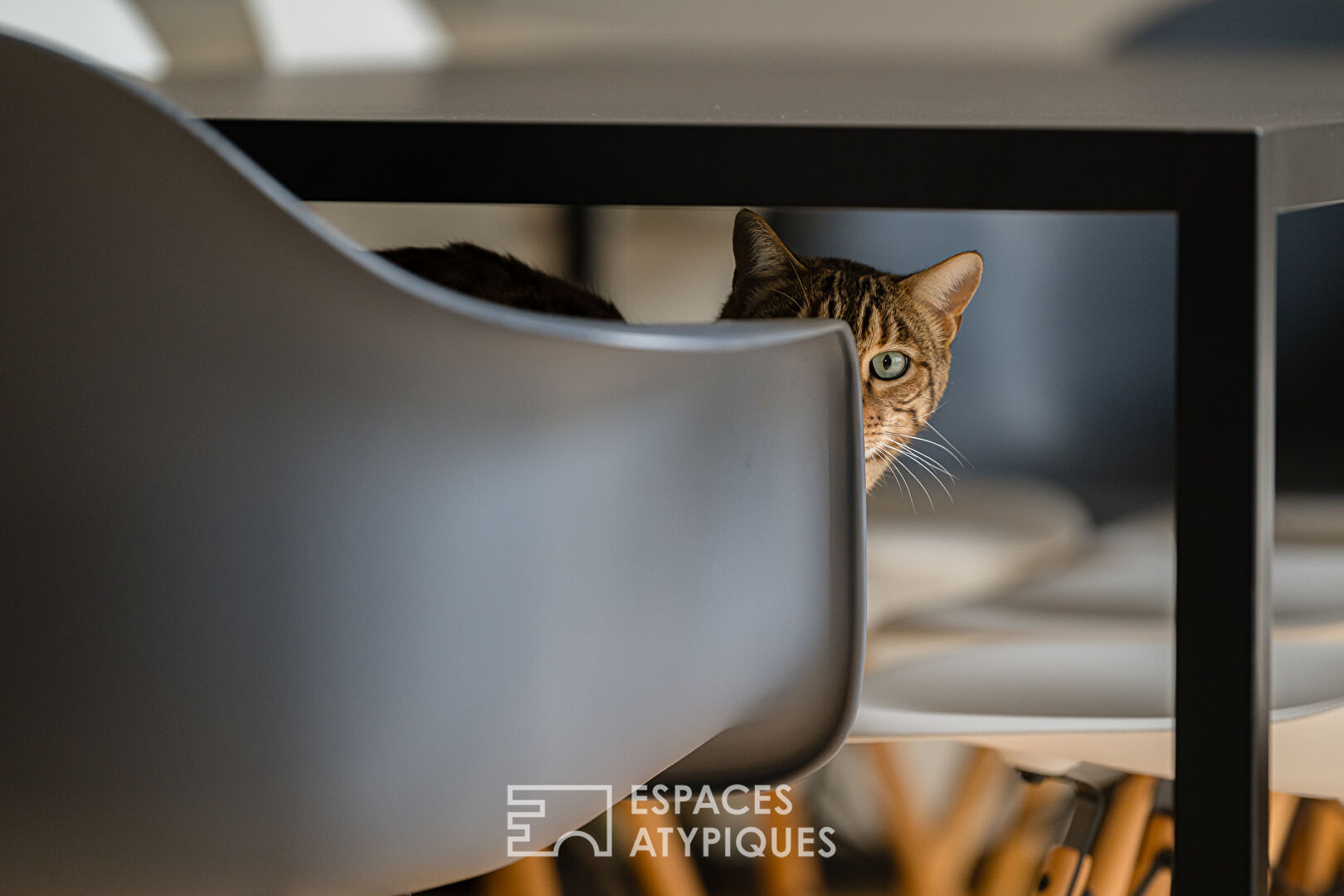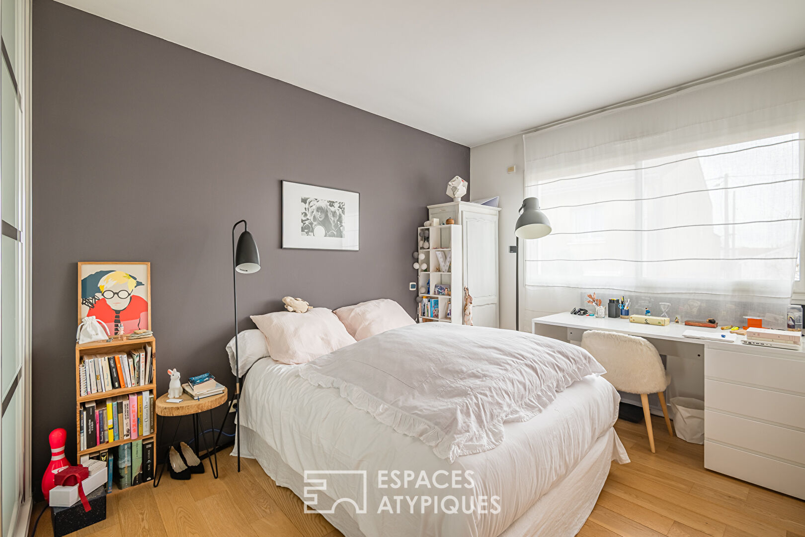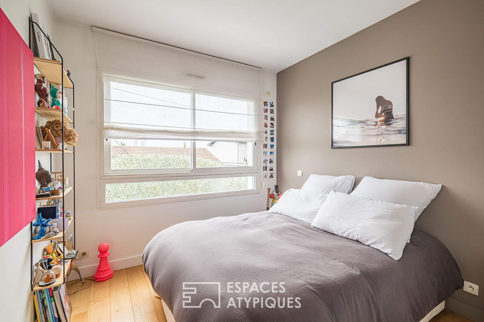 Idéalement située à seulement 5 minutes à pied du Parc de la Chêneraie et des écoles, cette maison réunit tous les atouts d'un bien familial moderne, fonctionnel et chaleureux. Nichée dans un quartier calme et résidentiel, elle offre dès l'arrivée un jardin d'accueil permettant le stationnement d'un véhicule, équipé d'une borne de recharge électrique. L'olivier centenaire donne immédiatement le ton : une maison avec du cachet, parfaitement entretenue et facile à vivre. L'entrée dessert une cuisine entièrement équipée et aménagée, semi-ouverte sur un vaste séjour baigné de lumière grâce à ses larges ouvertures. L'espace salon/salle à manger s'ouvre harmonieusement sur une grande terrasse avec piscine intimiste, à l'abri des regards : un véritable cocon pour profiter des beaux jours. Ce niveau comprend également un WC indépendant ainsi qu'un garage automatisé intégrant une cave à vin. A l'étage, le palier avec son espace bureau sur-mesure distribue trois chambres avec placards, une salle d'eau avec grande douche à l'italienne et un WC indépendant. Les parents bénéficient d'une superbe extension de 40 m² réalisée avec beaucoup de charme : un espace nuit chaleureux, un dressing et des rangements sur mesure, ainsi qu'une sublime salle de bain équipée d'une baignoire, d'une douche à l'italienne et d'une double vasque. Côté transports, tout est à portée de main : tram D ou bus accessibles en 10 minutes à pied, permettant de rejoindre le centre de Bordeaux en environ 20 minutes. Avec ses 130 m² habitables, ses volumes harmonieux et son atmosphère douce et conviviale, cette maison séduira les familles en quête de confort et de qualité de vie dans un secteur très prisé du Bouscat. CLASSE ÉNERGIE : D / CLASSE CLIMAT : B. Montant moyen estimé des dépenses annuelles d'énergie pour un usage standard, établi à partir des prix de l'énergie de l'année 2023 : entre 2 410 et 3 290 euros. Tommy Bertrand (EI) Agent Commercial : 06 13 39 29 78/ Numéro RSAC : 952 660 272 Bordeaux. Tommy BERTRAND (EI) Agent Commercial - Numéro RSAC : - .