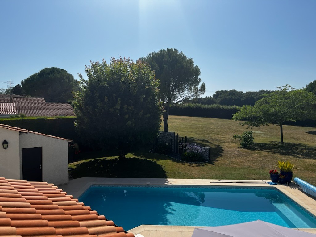 ROYAN-ST SULPICE de ROYAN, au calme, situé sur un très beau Parc arboré avec piscine, MAISON en très bon état de plain pied, avec double Garage Comprenant: Entrée , Séjour/Salon lumineux avec vue sur Piscine, Grande Mezzanine avec fenêtre, Cuisine aménagée ouvrant sur belle terrasse, 3 Chambres, Salle de bains avec douche et baignoire, Grande pièce d'environ 44m²(salle de réunion, salle de jeux, bureau, espace artistique) TERRASSES, PISCINE, DOUBLE GARAGE. TERRAIN ARBORE de 1344m² Possibilité d'acquérir un terrain attenant arboré et clos de 3000m² non constructible. (4.50 % honoraires TTC à la charge de l'acquéreur.)