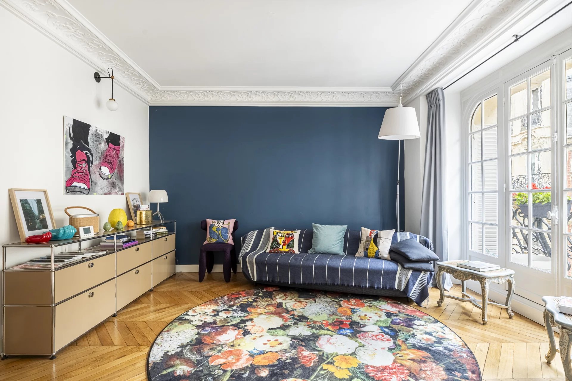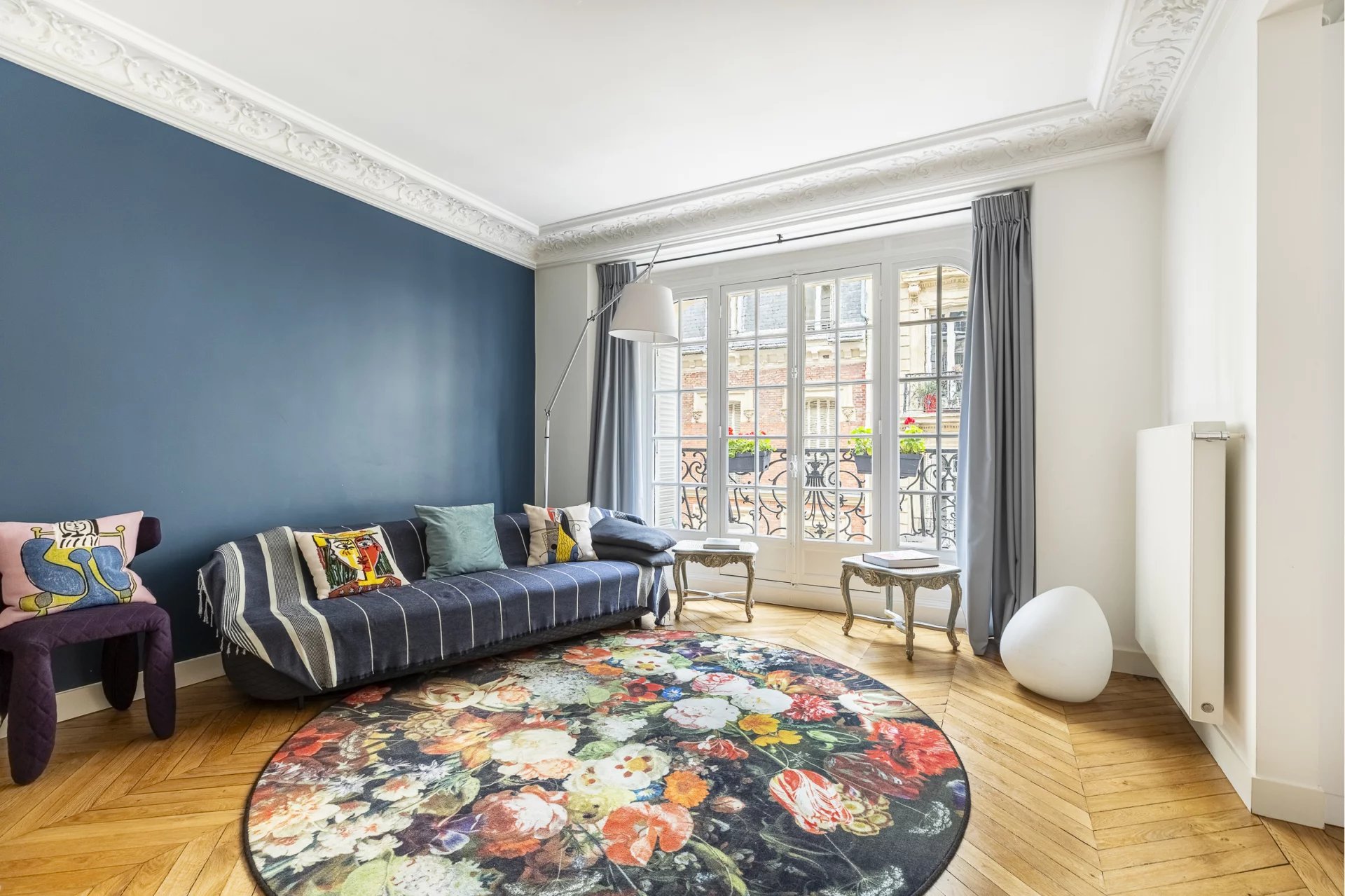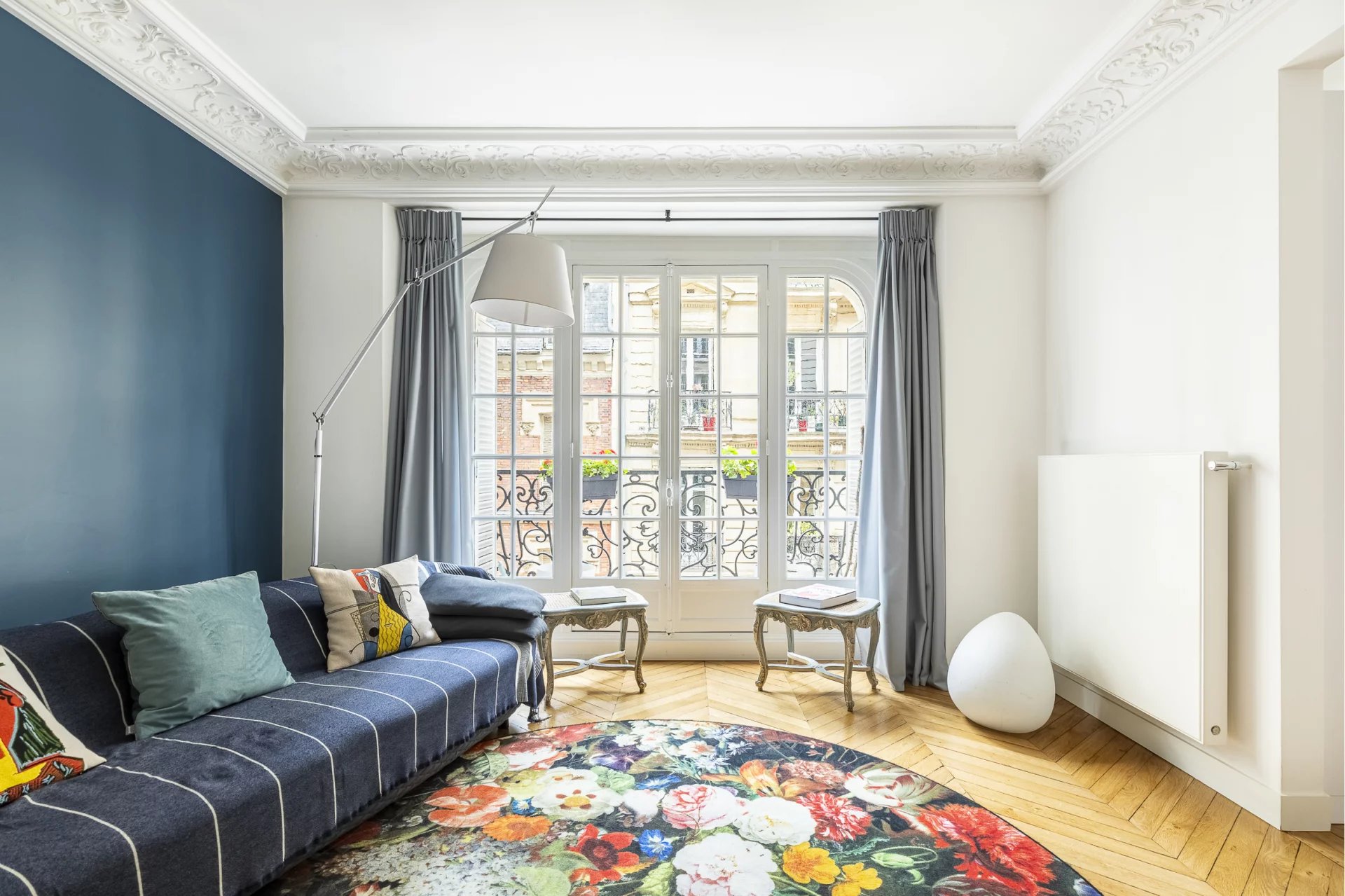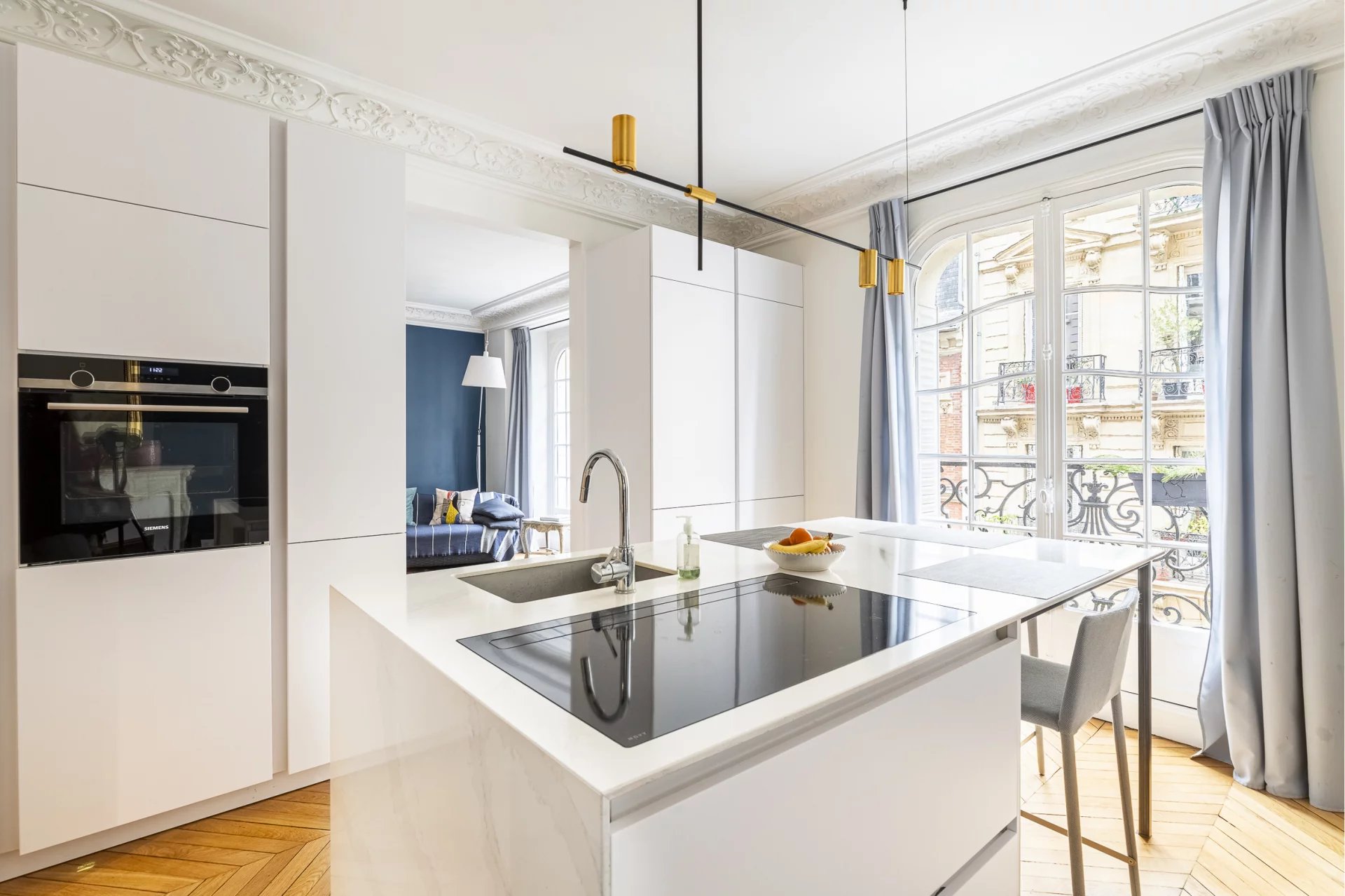 Un subtil mélange harmonieux d'ancien et de moderne, le tout conçu de façon à mettre en valeur le style haussmannien (moulures, cheminée en marbre et parquet en point de Hongrie) de l'appartement qui plaira au plus exigeants.