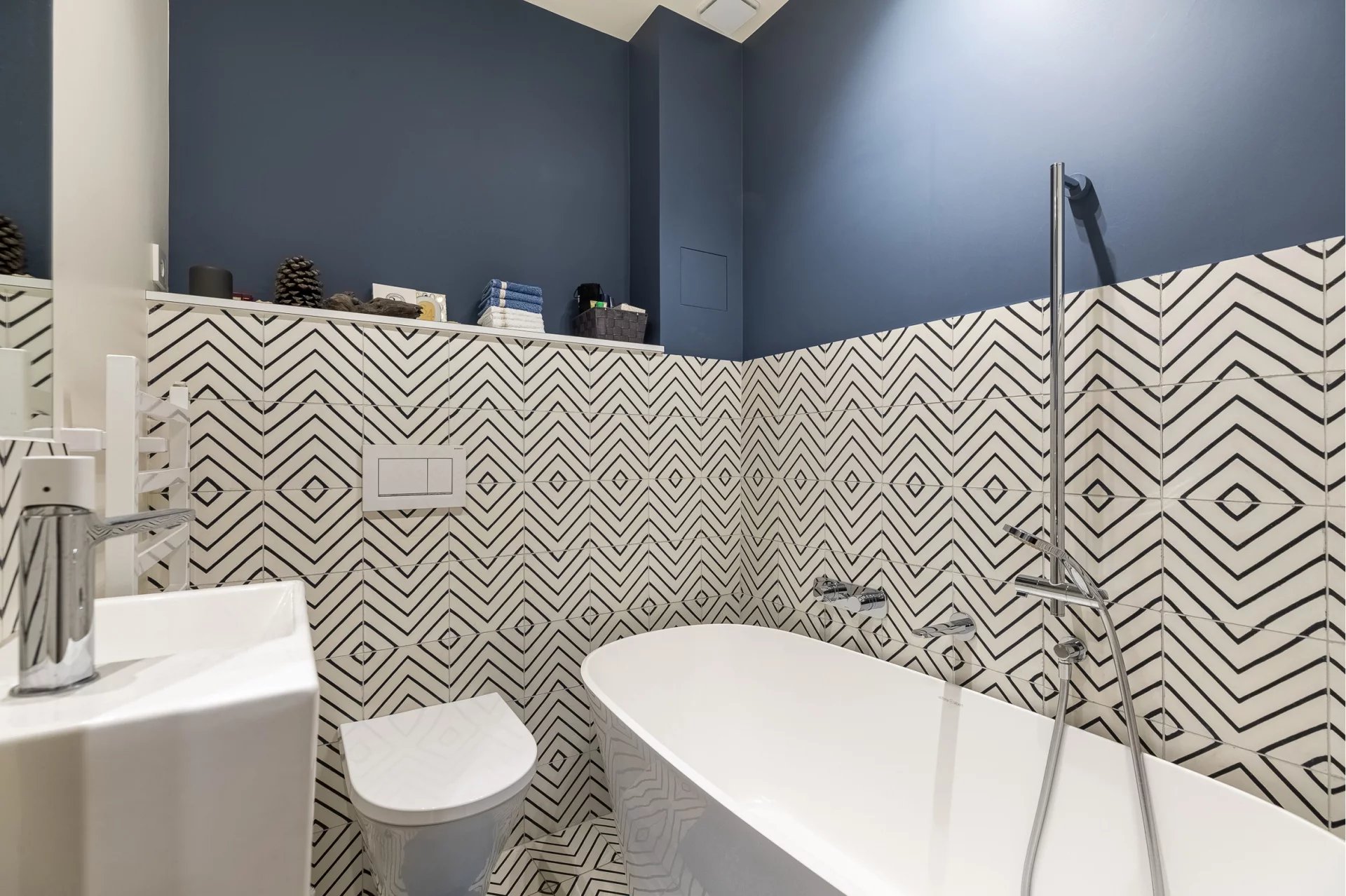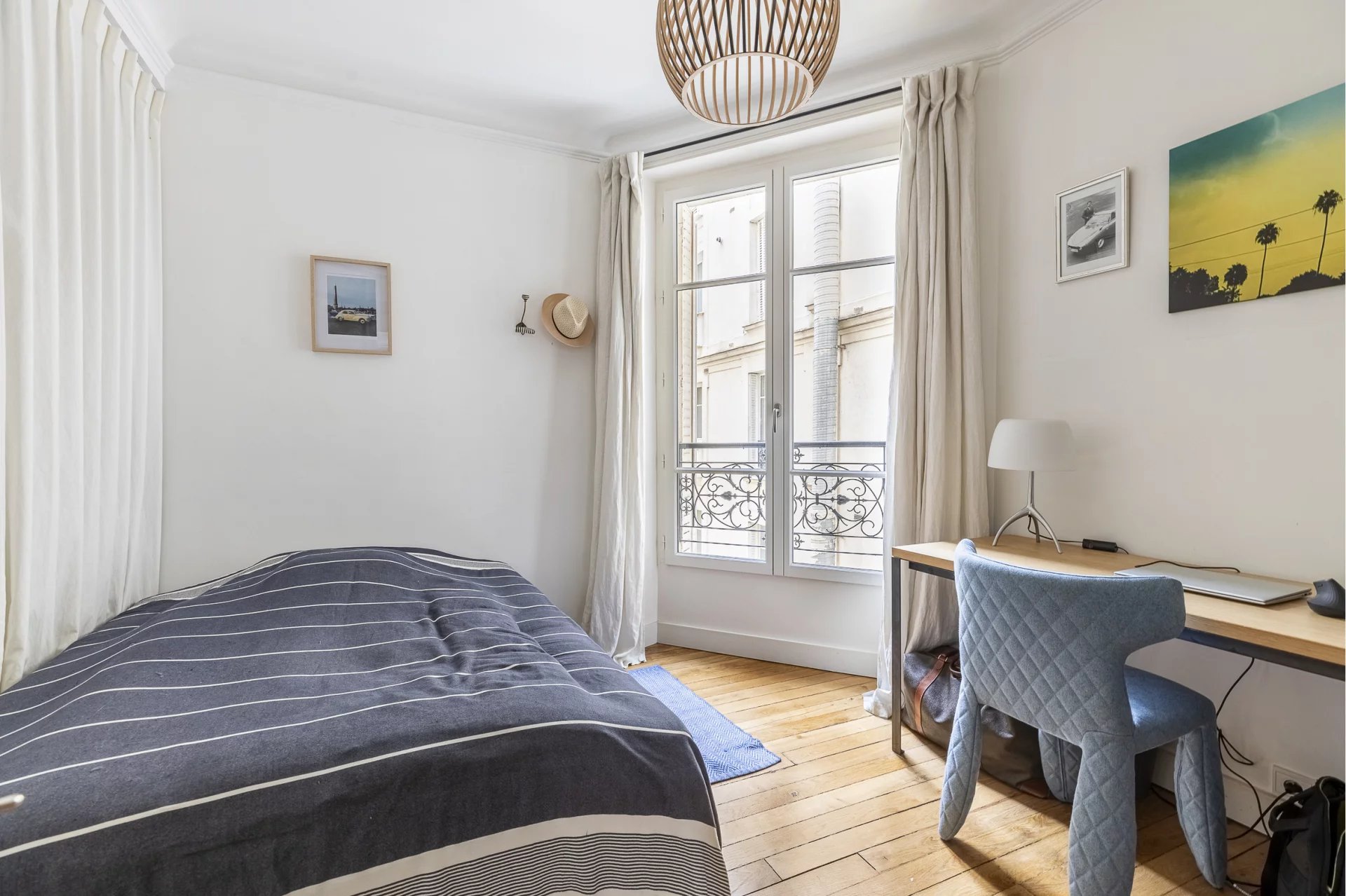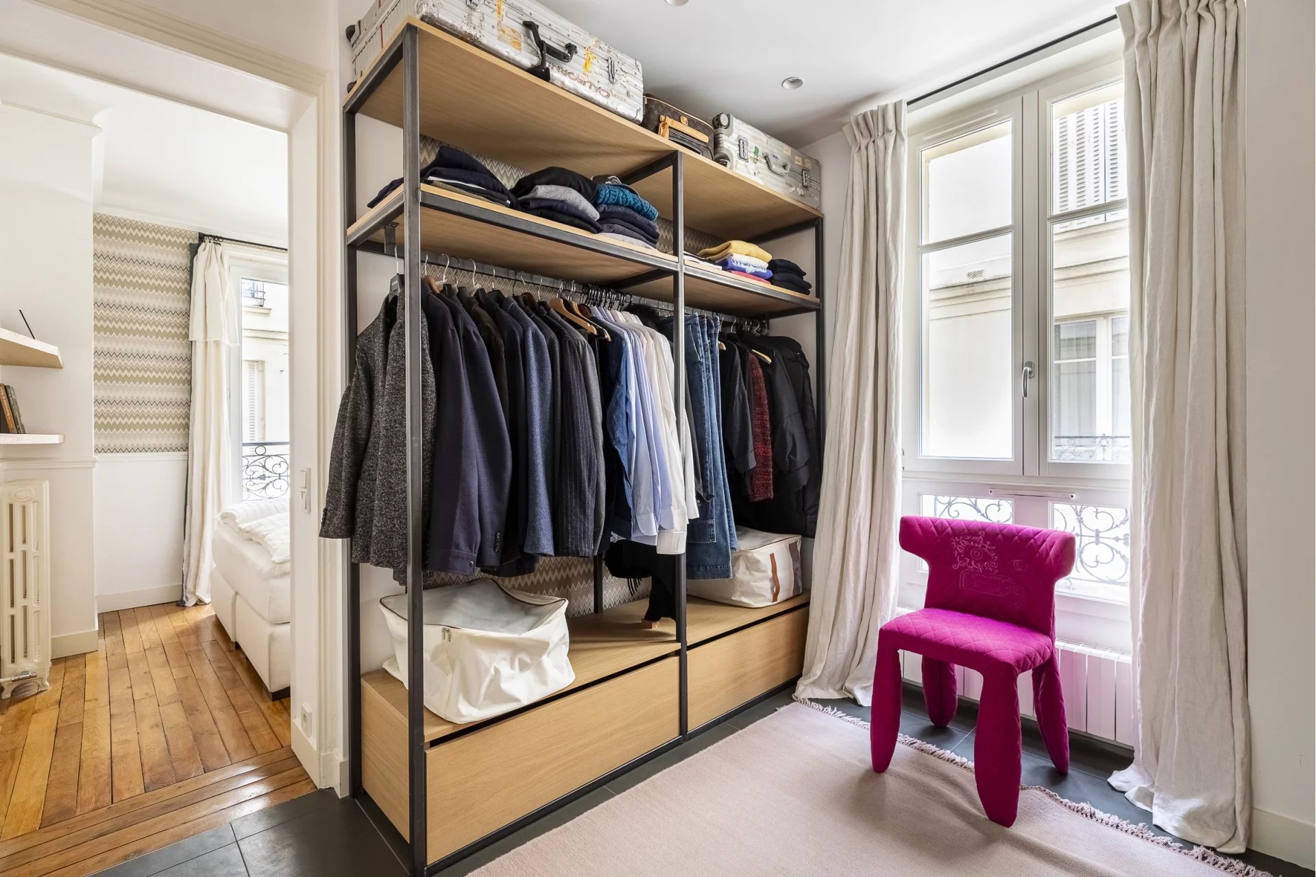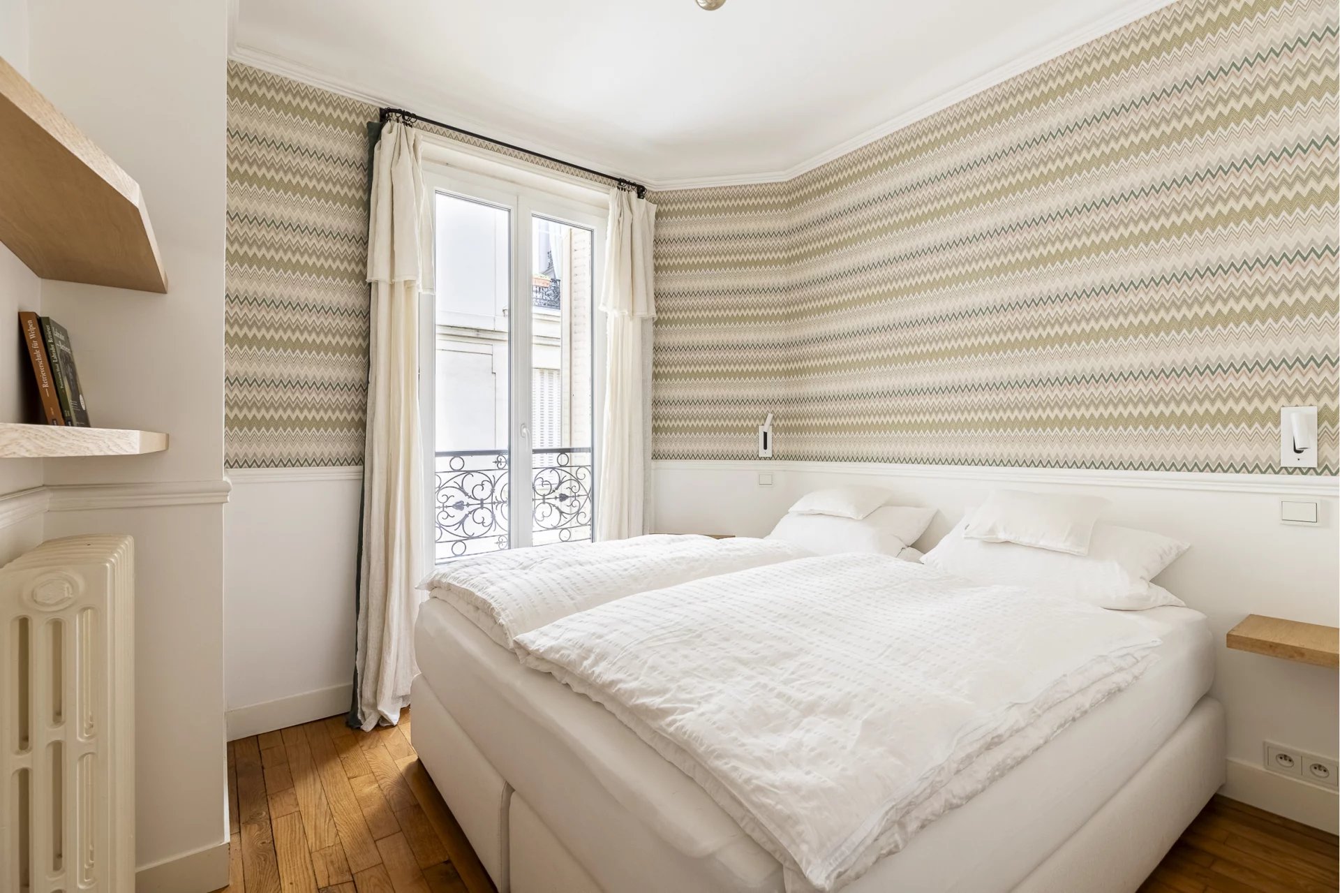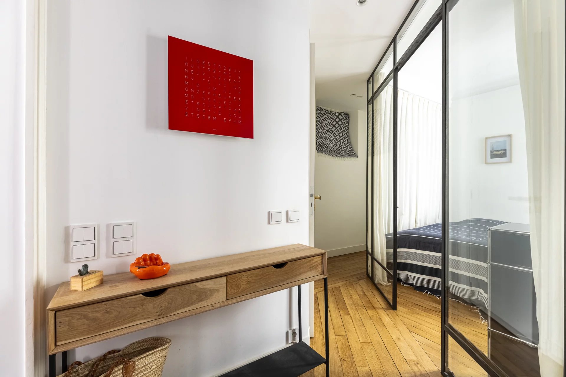 Un subtil mélange harmonieux d'ancien et de moderne, le tout conçu de façon à mettre en valeur le style haussmannien (moulures, cheminée en marbre et parquet en point de Hongrie) de l'appartement qui plaira au plus exigeants.