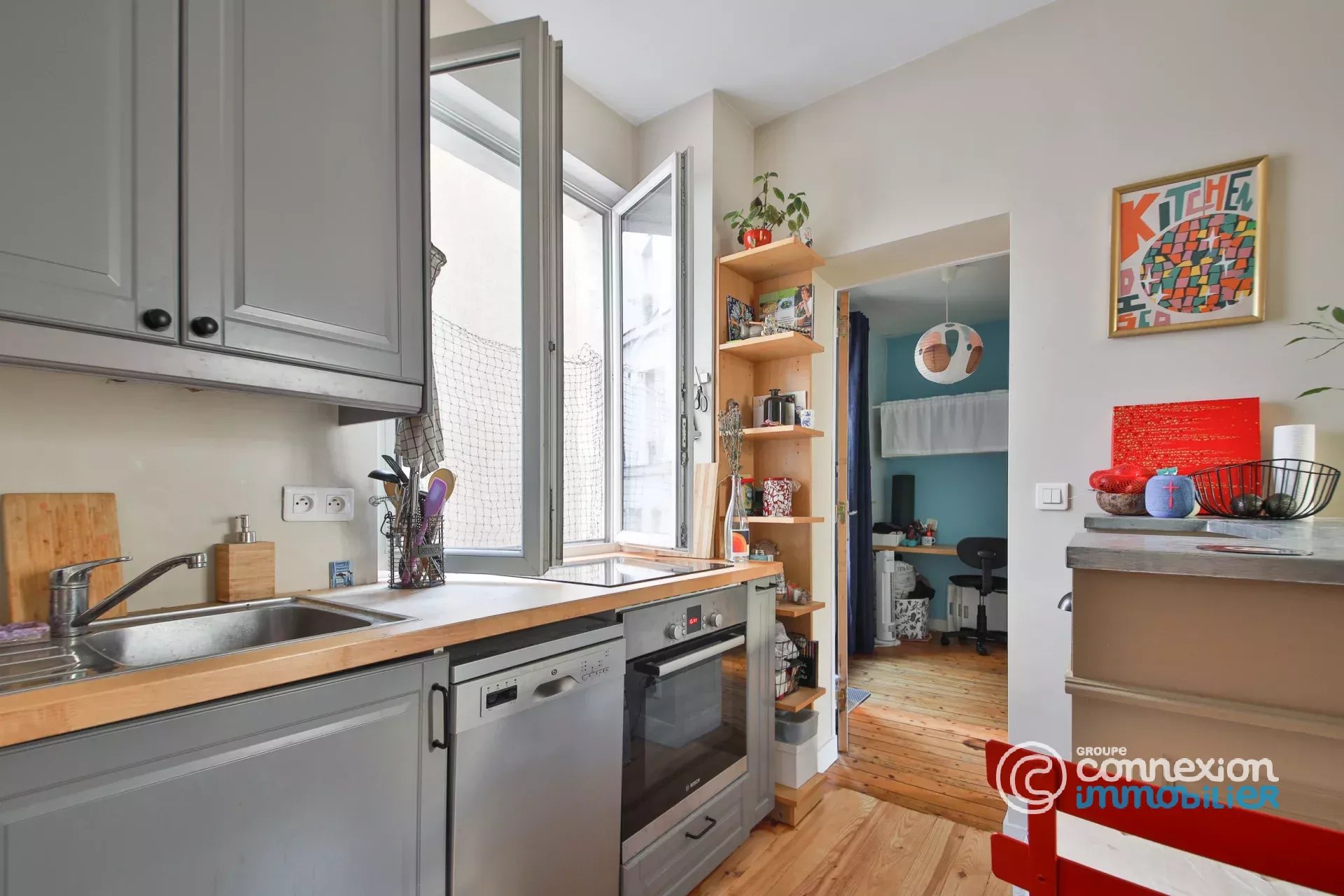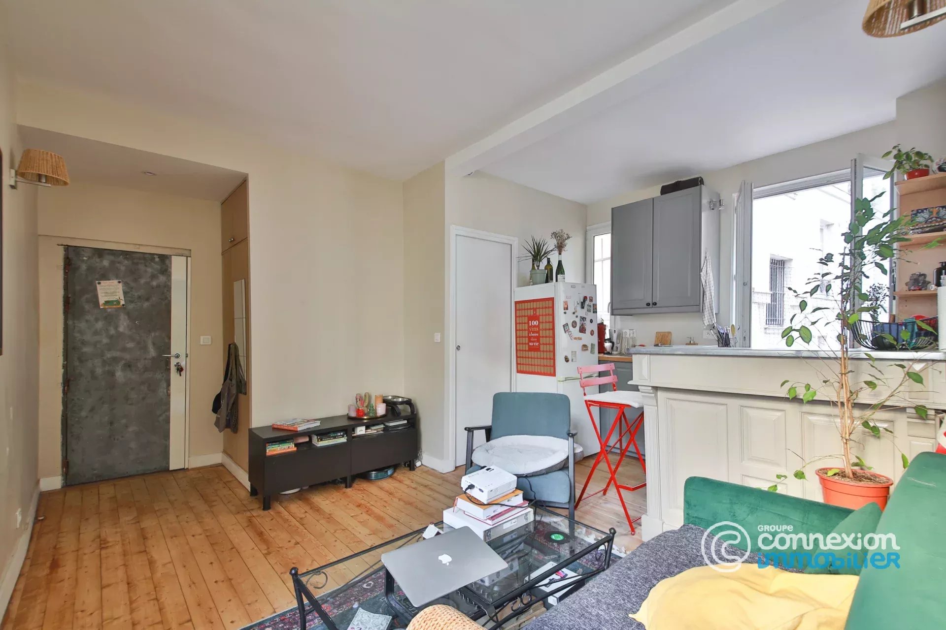 Un appartement traversant de 33,4m2 Carrez composé d'une pièce à vivre avec cuisine ouverte équipée, 1 chambre et un bureau et une salle de douche avec WC.