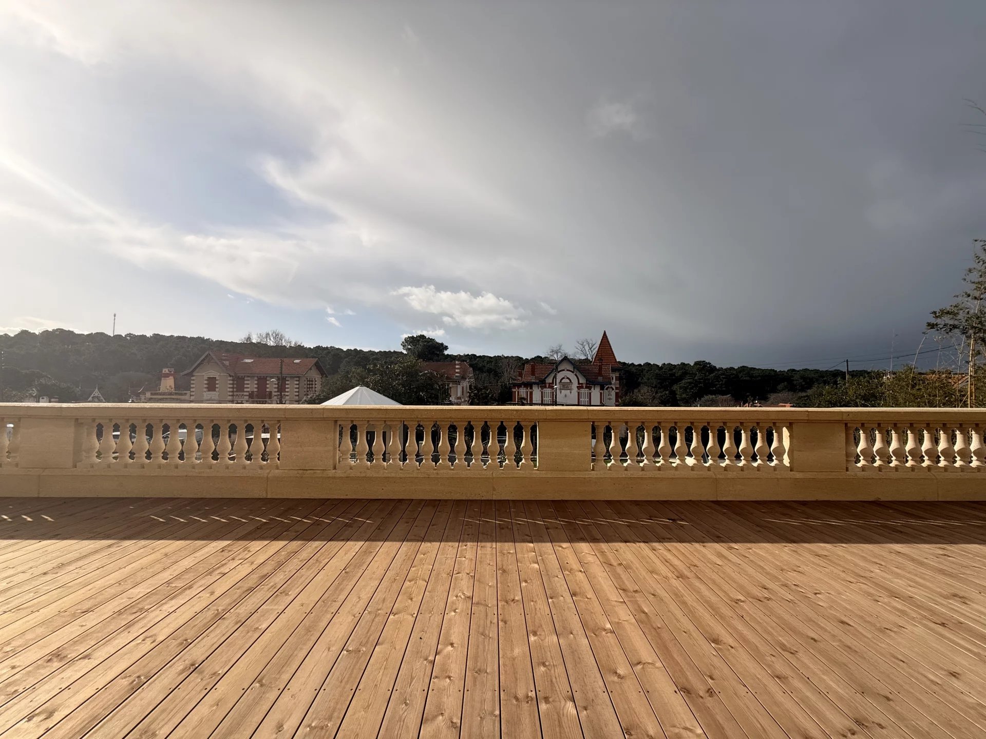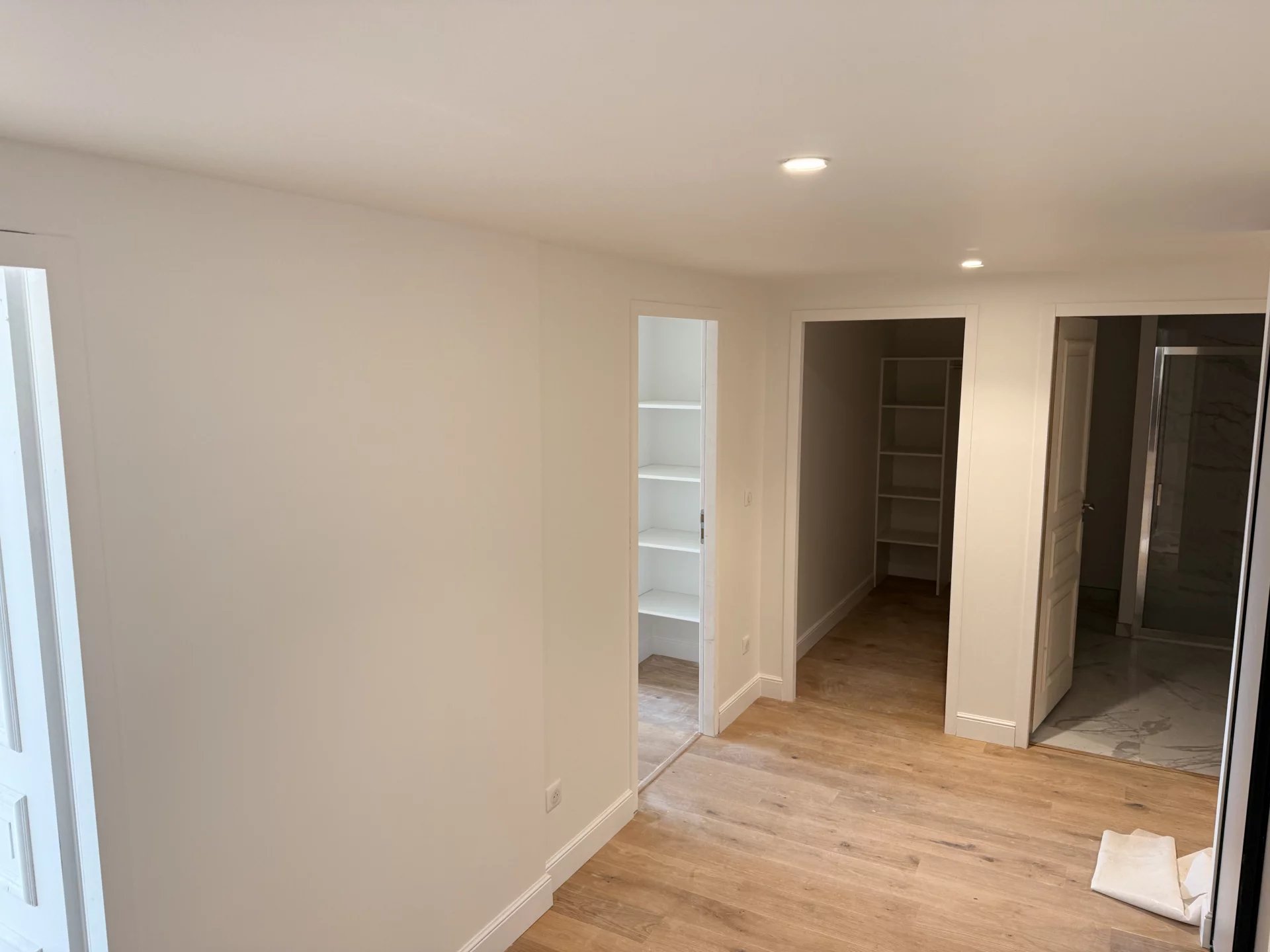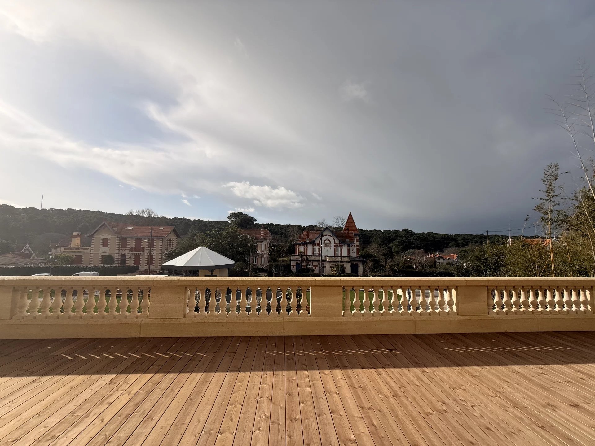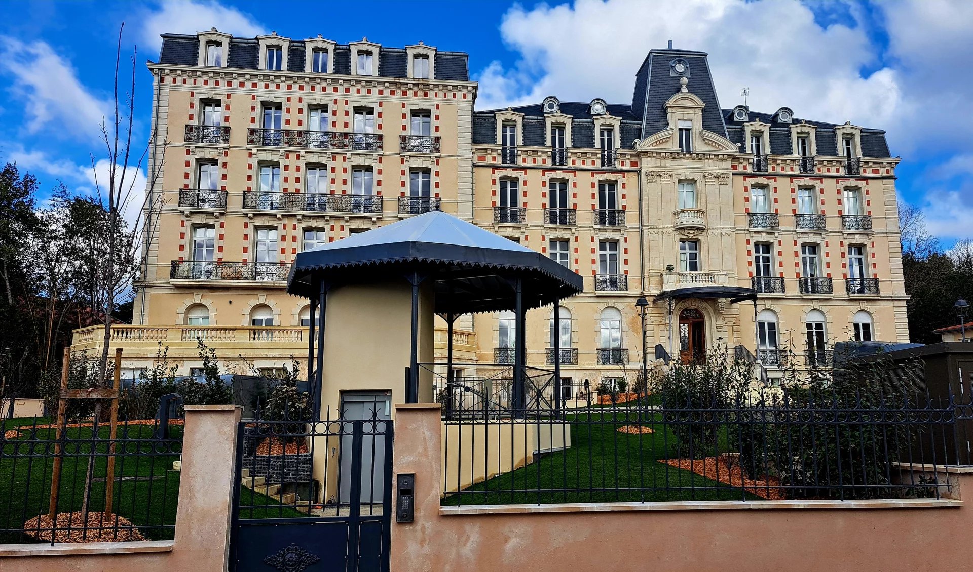 Le logement s’ouvre sur un vaste balcon offrant une vue imprenable sur un jardin en copropriété soigneusement entretenu. L'éclairage extérieur met en valeur la beauté de ce cadre unique, sécurisé par un portail électrique et un vidéophone.