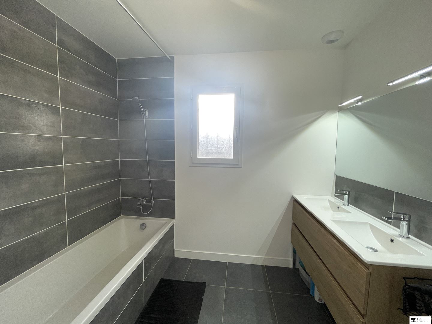 Lespace nuit, accessible par un couloir, se compose de trois chambres, dont une suite parentale avec salle deau attenante. Une salle de bain équipée dune baignoire et dun meuble double vasque complète cet espace, offrant tout le nécessaire pour répondre aux besoins dune famille.