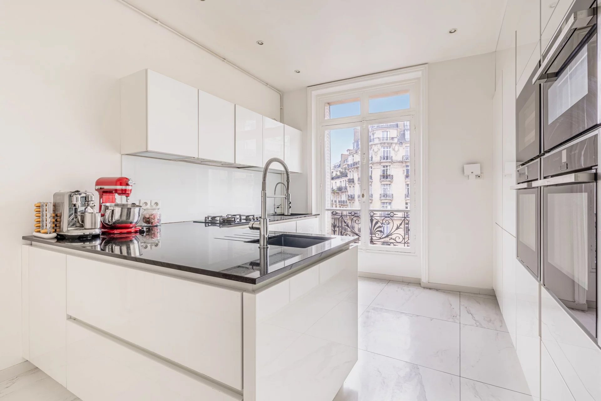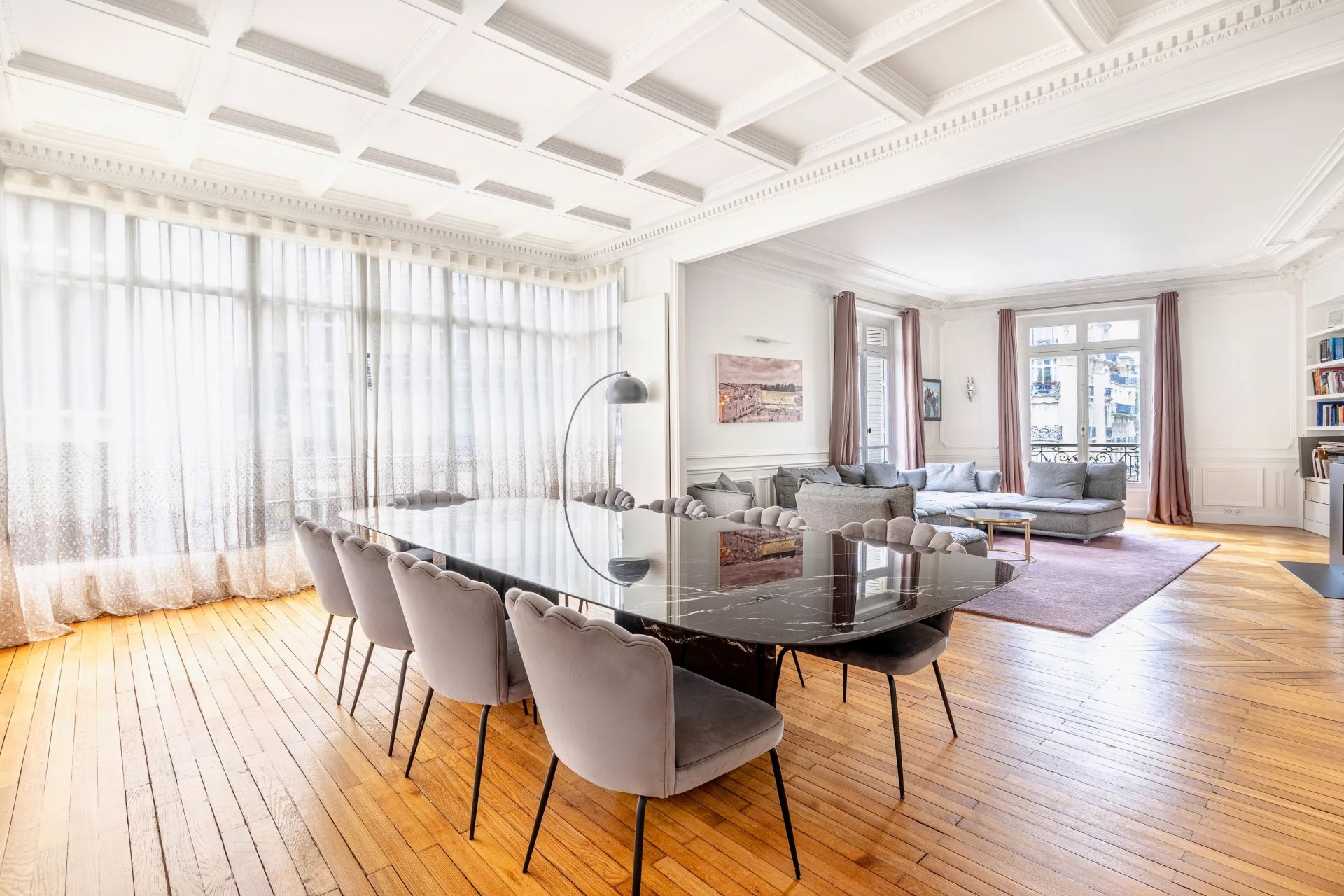 Appartement familial - 3ème étage - 161 m² Situé au 3ème étage par ascenseur d'un immeuble haussmannien 1892, en plein coeur du 16ème arrondissement, et donnant sur la prestigieuse Place Mexico et l'Avenue d'Eylau, à deux pas de la place Trocadéro et de la Tour Eiffel. Situé à proximité des commerces et écoles de renom. Ce bien en excellent état dispose de beaux volumes et d'une excellente distribution. Galerie d'entrée, vaste double réception, cuisine entièrement aménagée et équipée, suite parentale avec salle d'eau et dressing, deux chambres (4ème chambre possible), dégagement bénéficiant de nombreux rangements, salle de bain avec douche et coin buanderie, deux toilettes séparées. Avec plus de 3m de hauteur sous-plafond, l'appartement conserve tout le charme de l'ancien (parquets, moulures, et cheminée d'époque). Environnement chic, calme et sécurisé, avec des parties communes de grand standing et gardien. Deux caves complètent ce bien.
