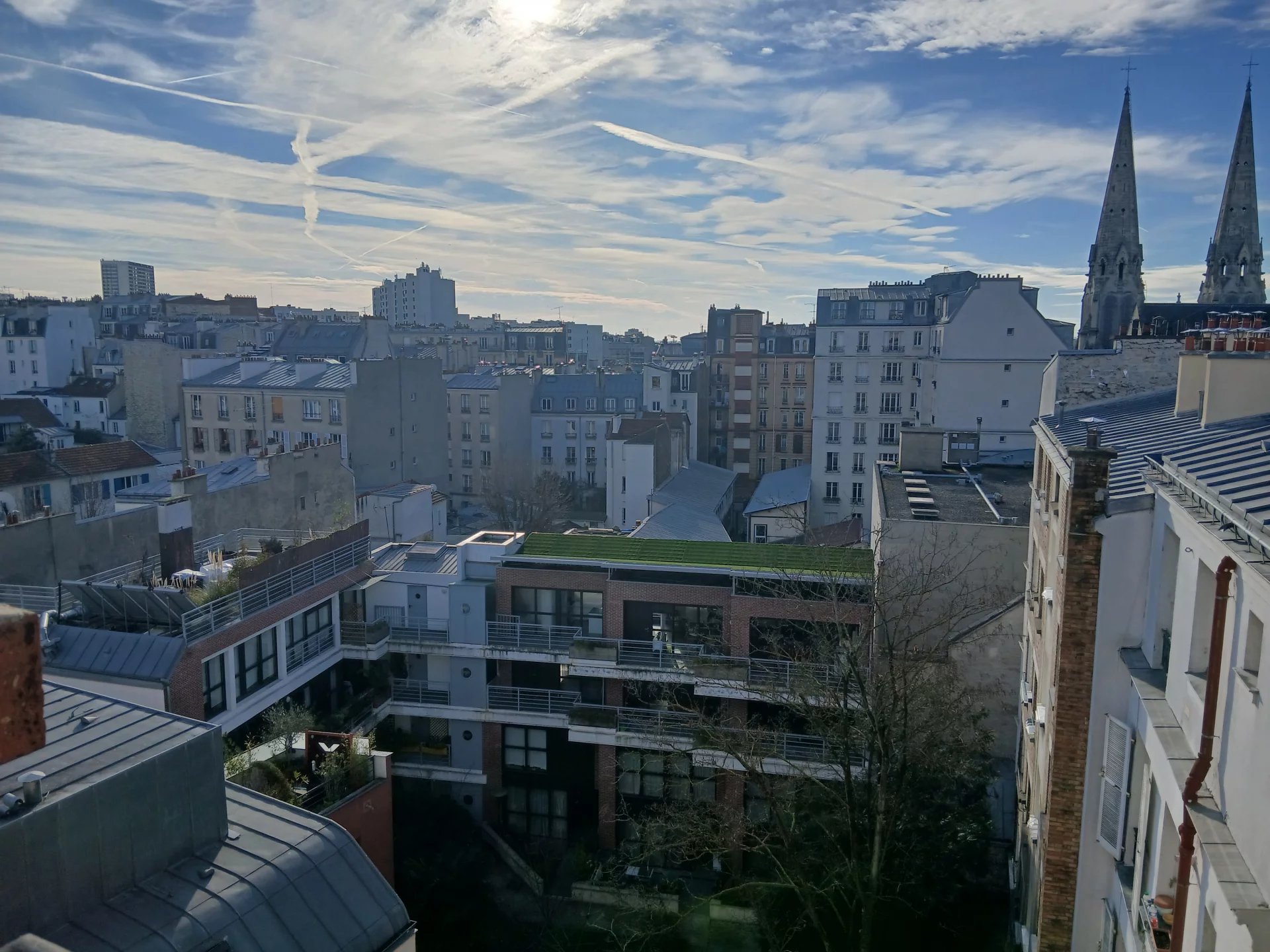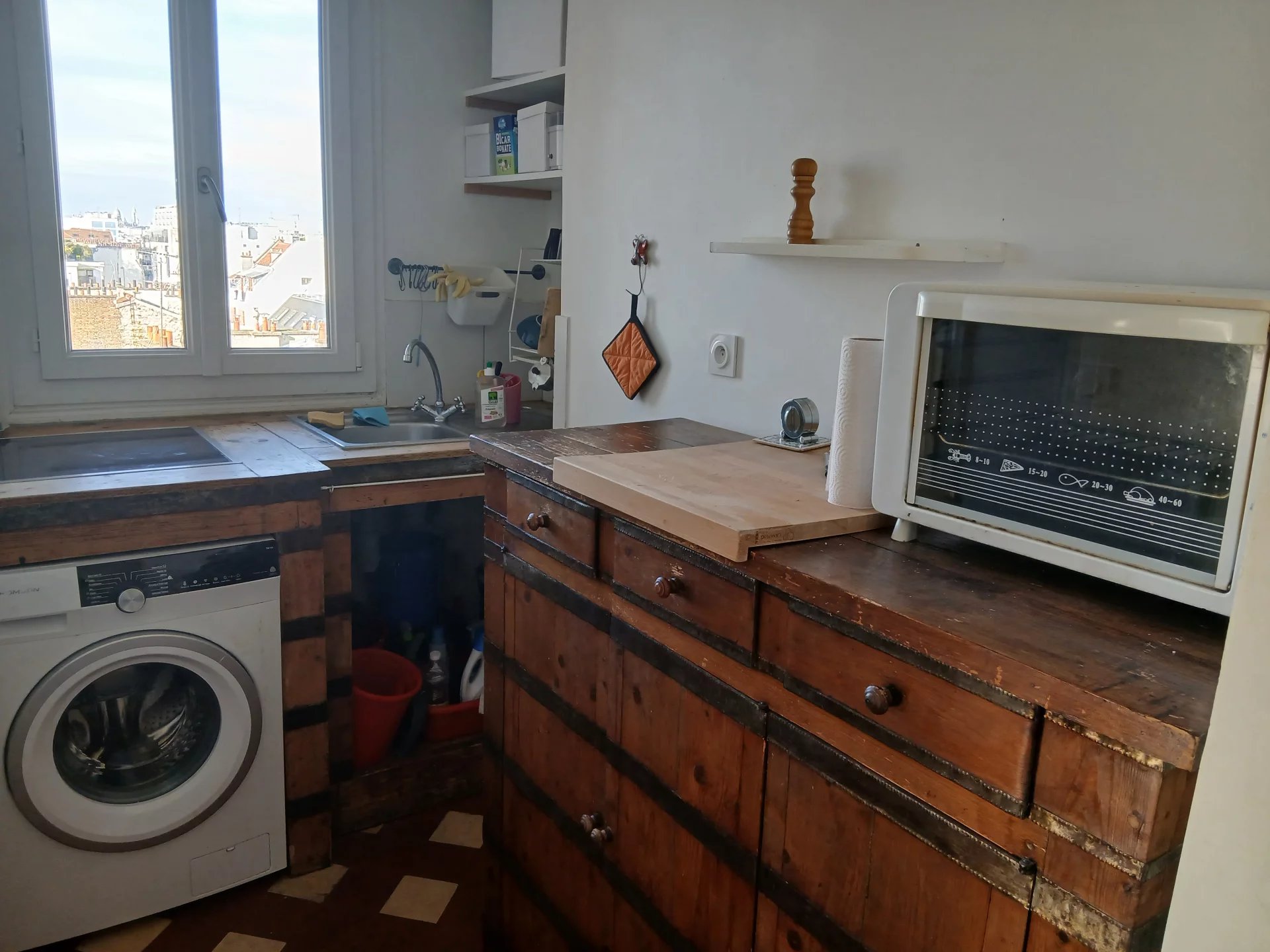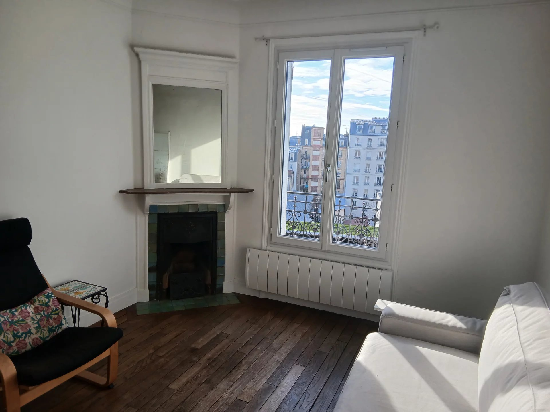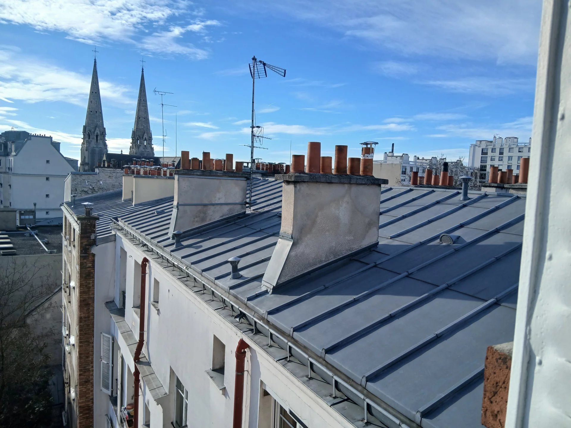 Paris 19ème Métro Jourdain 2 pièces au dernier étage sans ascenseur avec vue dégagée composé d'une entrée, une cuisine, un séjour, une chambre salle d'eau avec wc. Un débarras.