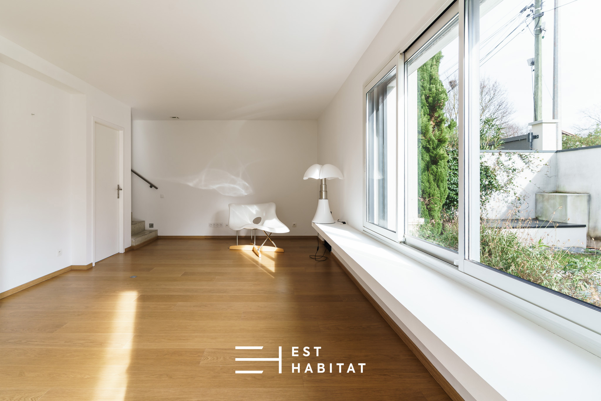La pièce à vivre de 62 m2, exposée sud, s'ouvre par de larges baies vitrées sur le jardin arboré. Les chambres, au nombre de quatre, sont grandes et lumineuses. La suite parentale a l'avantage d'être de plain-pied sur une agréable terrasse arborée.