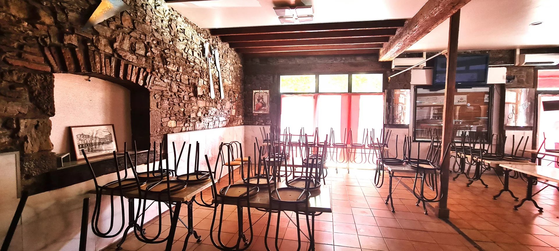 Au centre du village, restaurant avec salle à manger de 130m², cuisine 25m² avec accès cave de 40m², toilettes clients, climatisation réversible. A l'étage, grande pièce de 40m² et toilette employés.