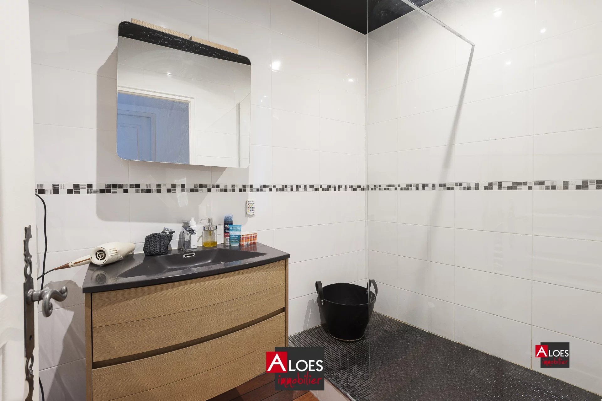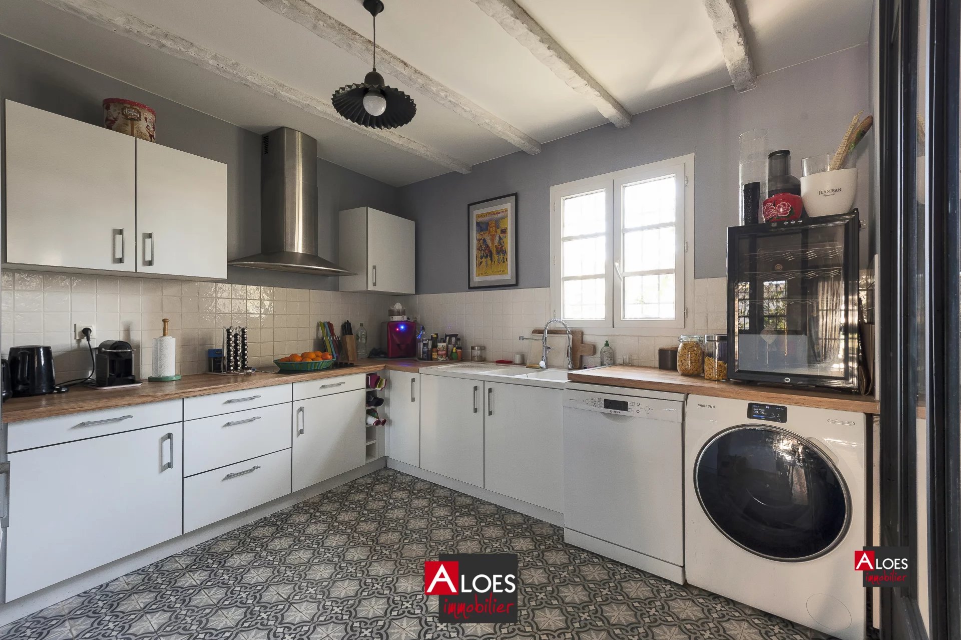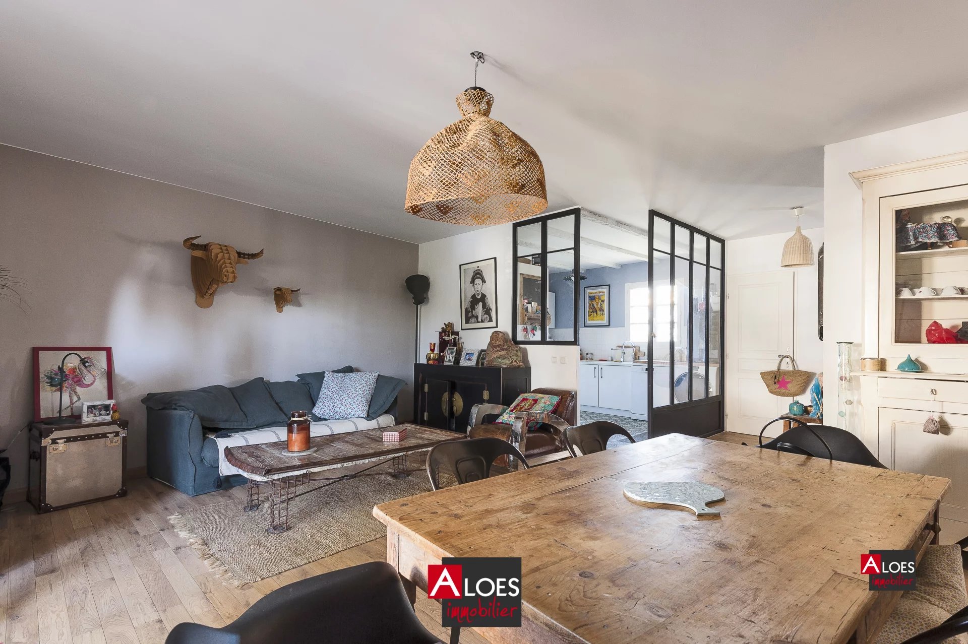 Dès l’entrée, le rez-de-chaussée s’ouvre sur un hall accueillant menant à une belle pièce de vie lumineuse et agréable. La cuisine, ouverte sur le séjour, est aménagée et entièrement équipée. Elle bénéficie d’une verrière apportant une luminosité naturelle remarquable et un style contemporain à l’ensemble.