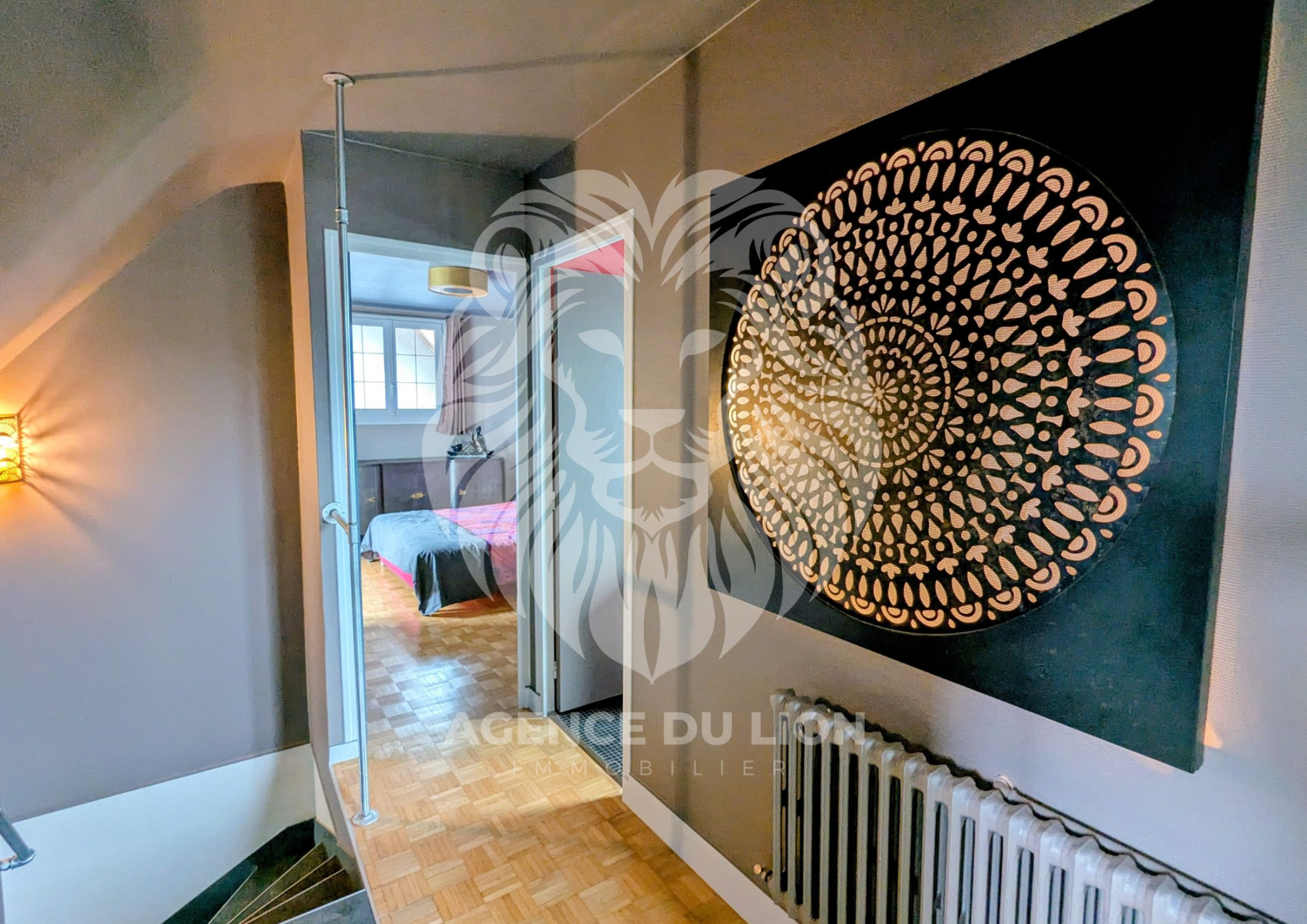 À l'étage, un palier dessert deux chambres supplémentaires, un bureau, une salle de bains avec douche et un WC, offrant un espace nuit fonctionnel et bien agencé.