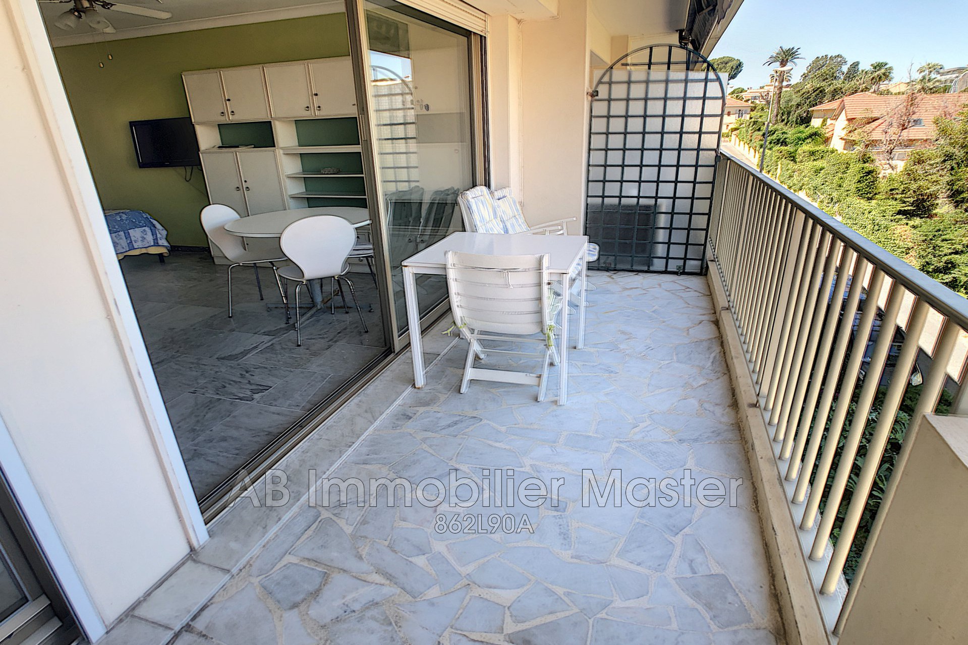 Antibes Salis, dans immeuble de très bon standing avec gardien et piscine, à 50 mètres des plages, beau studio de 27,13m² composé d'une entrée, d'un séjour s'ouvrant sur une belle terrasse de 9m² avec vue mer, d'une cuisine américaine toute équipée, d'un coin nuit et d'une salle de douche avec toilettes. Internet par fibre optique compris.