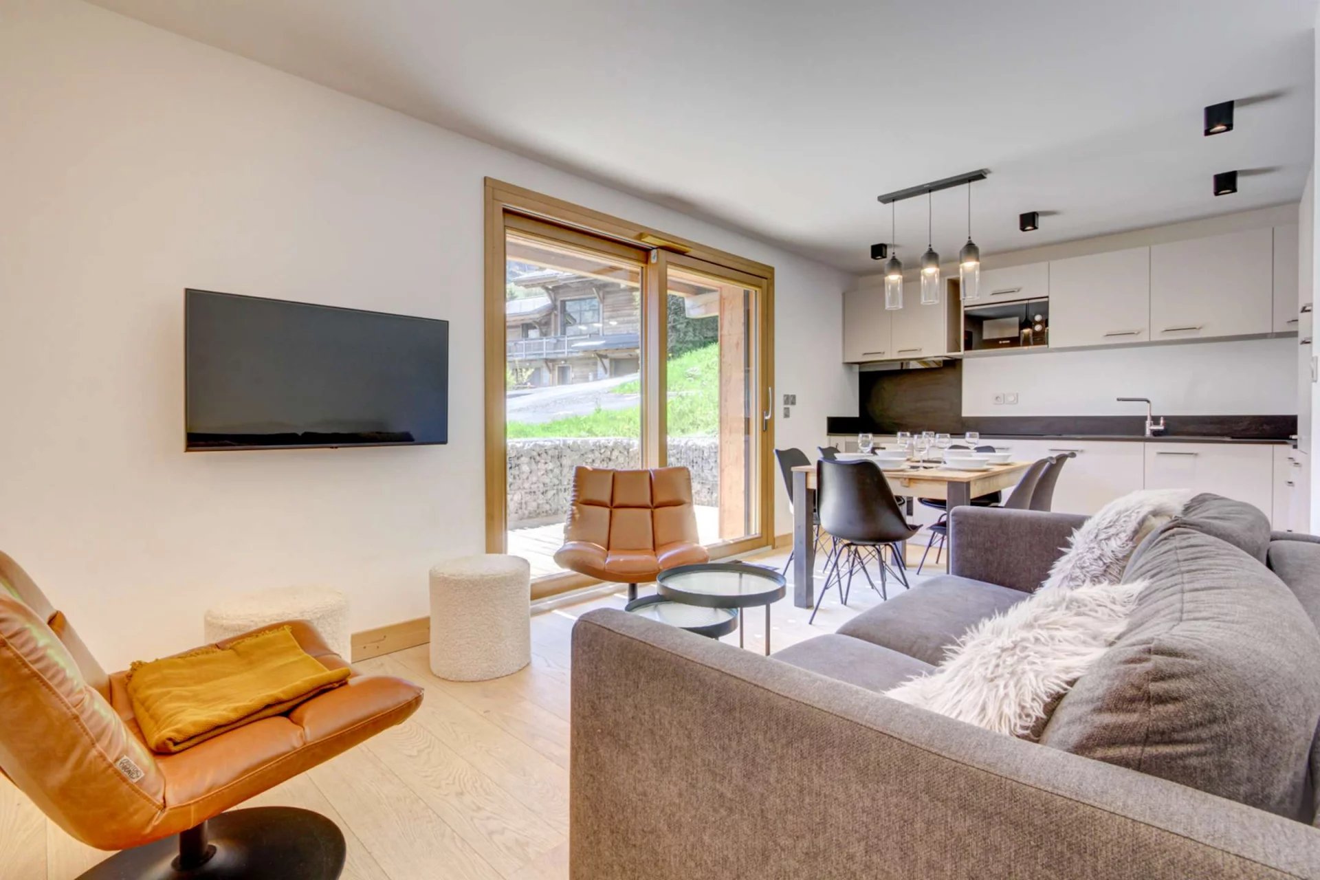 L'Espace Vie : Un salon convivial ouvrant sur une terrasse face aux pistes du Pleney. Parfait pour le café du matin ou l'après-ski.