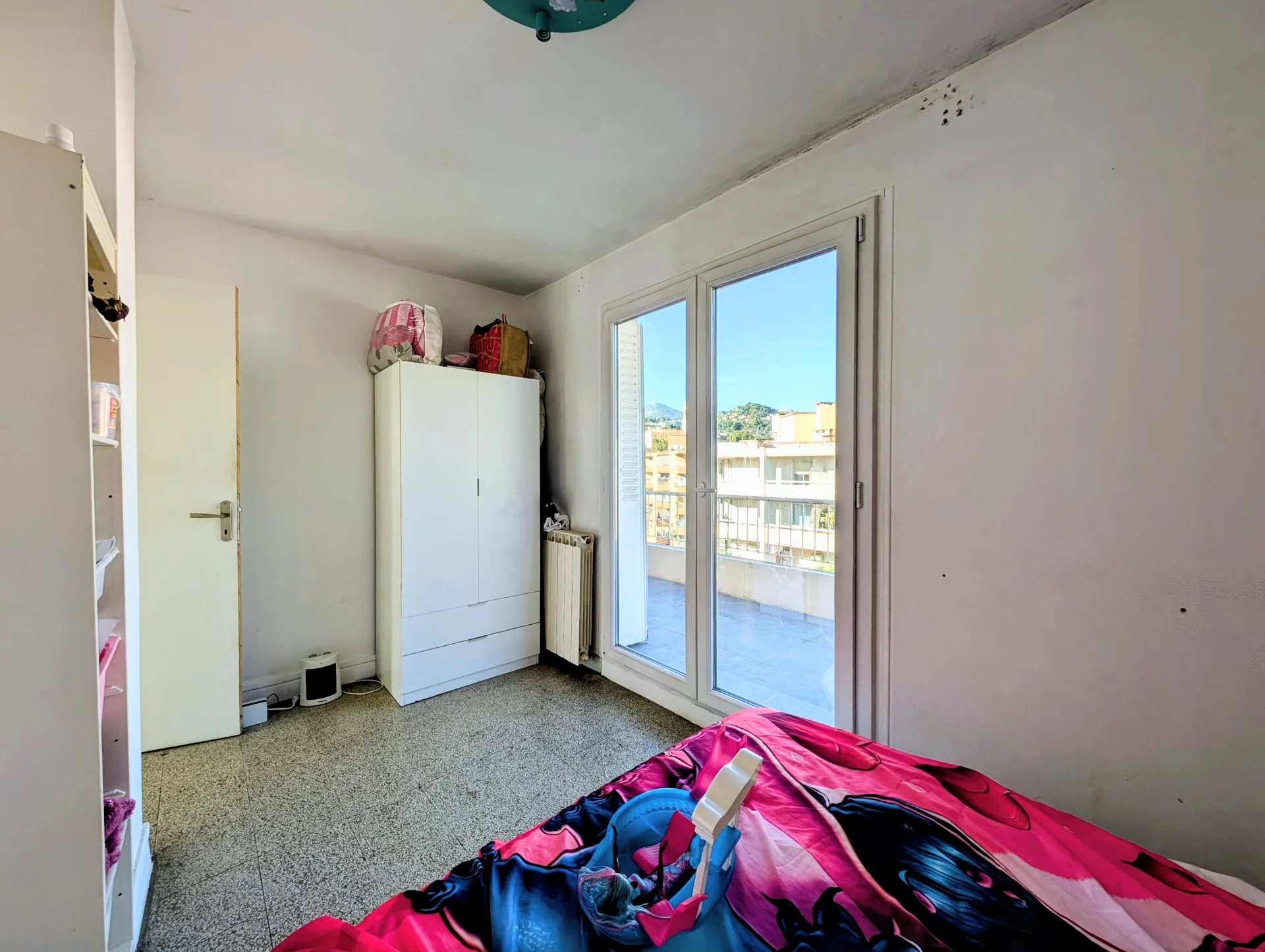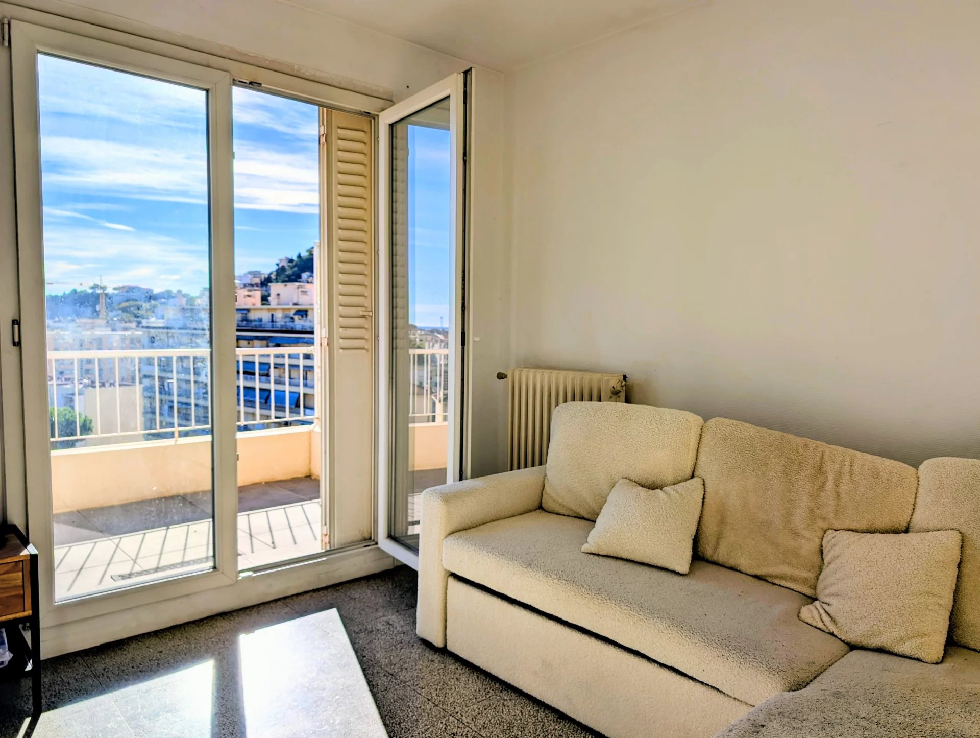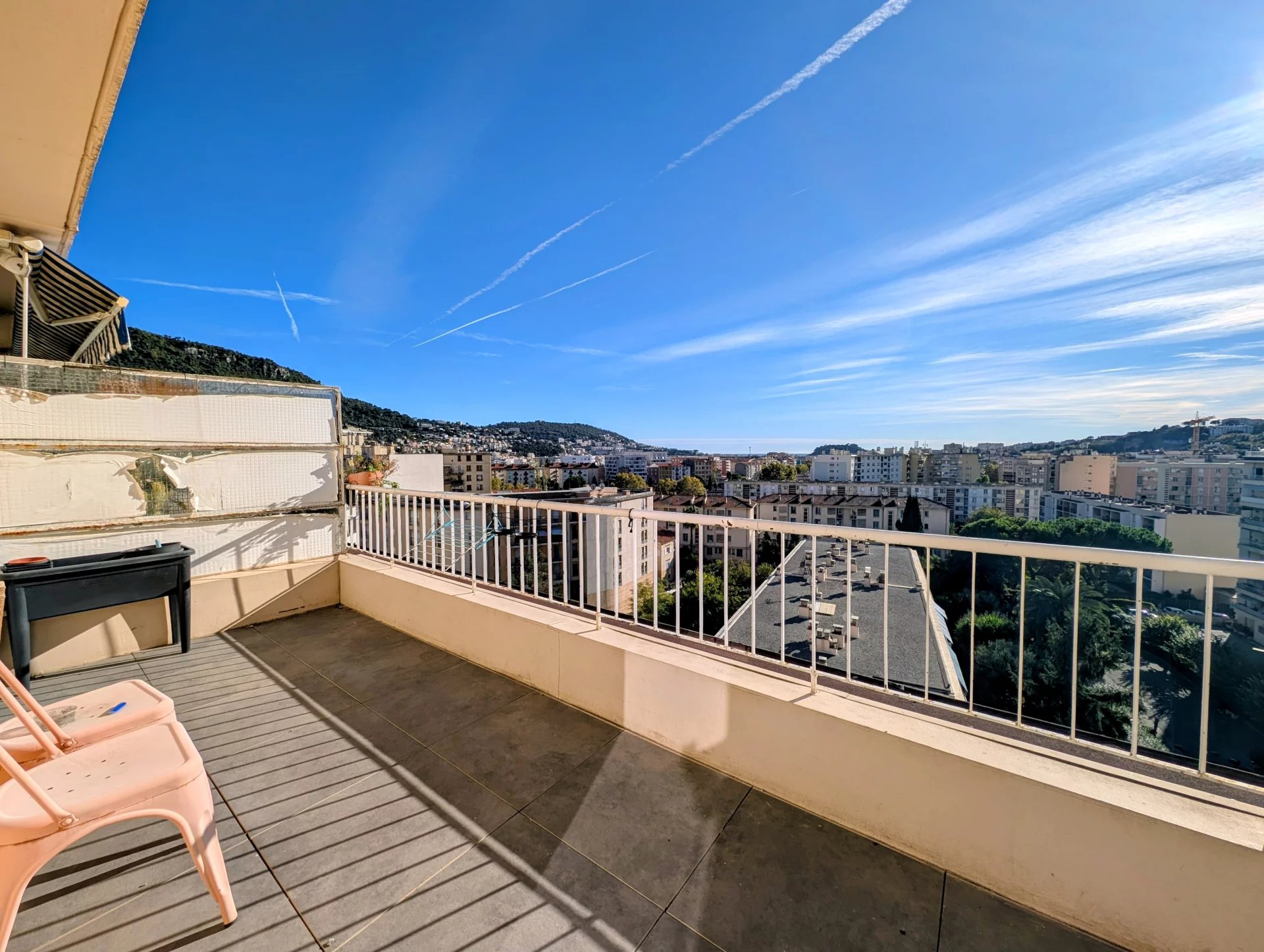 Dans une résidence avec gardien, au calme, 2 pièces traversant de 35 m² au dernier étage, offrant deux grandes terrasses 15 m² sans vis-à-vis, avec vue dégagée jusqu’à la mer.