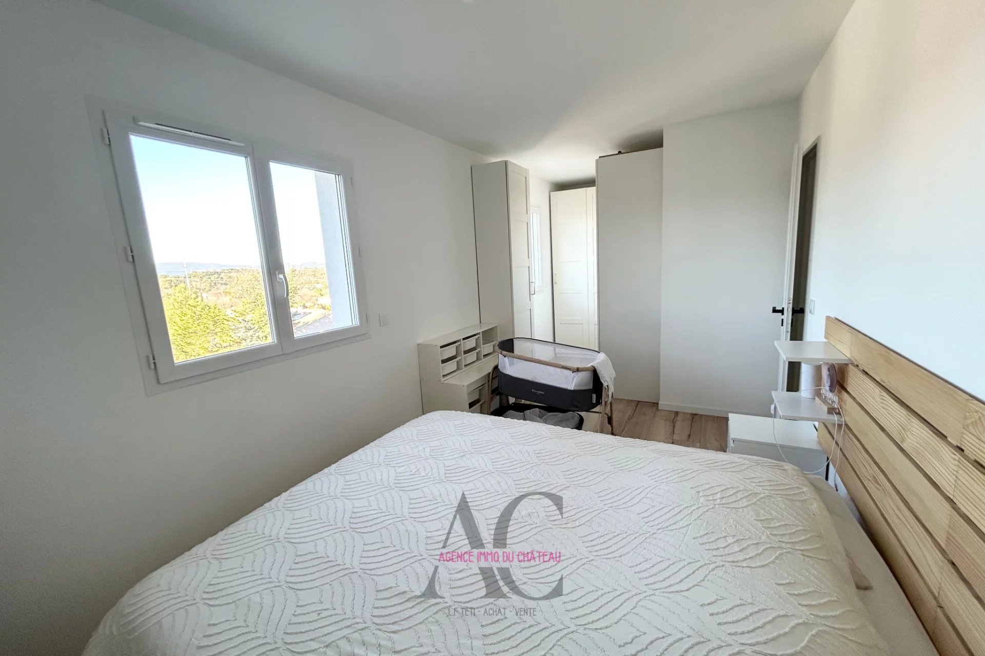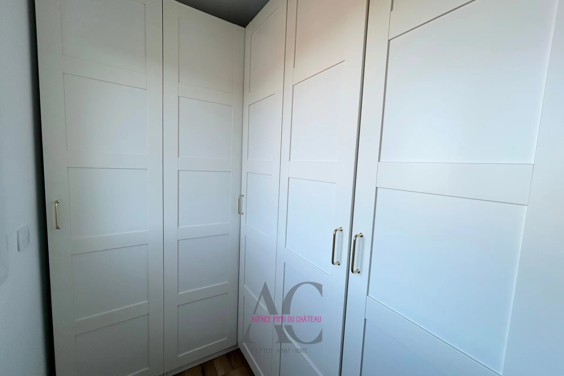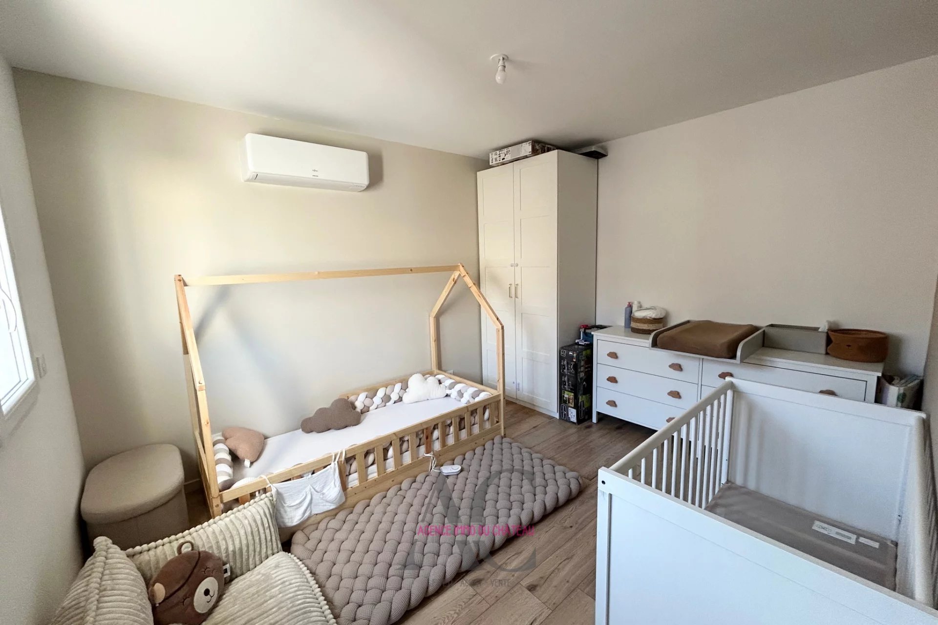 À l’étage, l’espace nuit offre deux chambres confortables, dont une avec un véritable dressing, ainsi qu’une belle salle de bains aux matériaux modernes, équipée à la fois d’une baignoire et d’une douche.