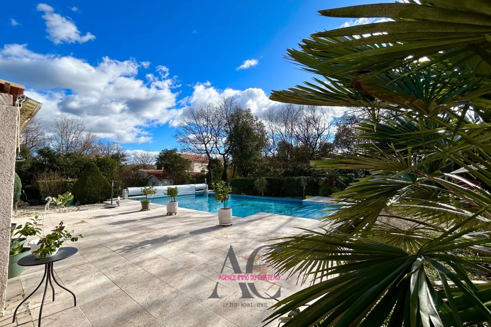 À l’extérieur, vous profiterez d’un terrain plat de plus de 1 600 m², parfaitement ensoleillé, agrémenté de plusieurs terrasses dont une couverte, et d’une piscine traditionnelle à débordement.