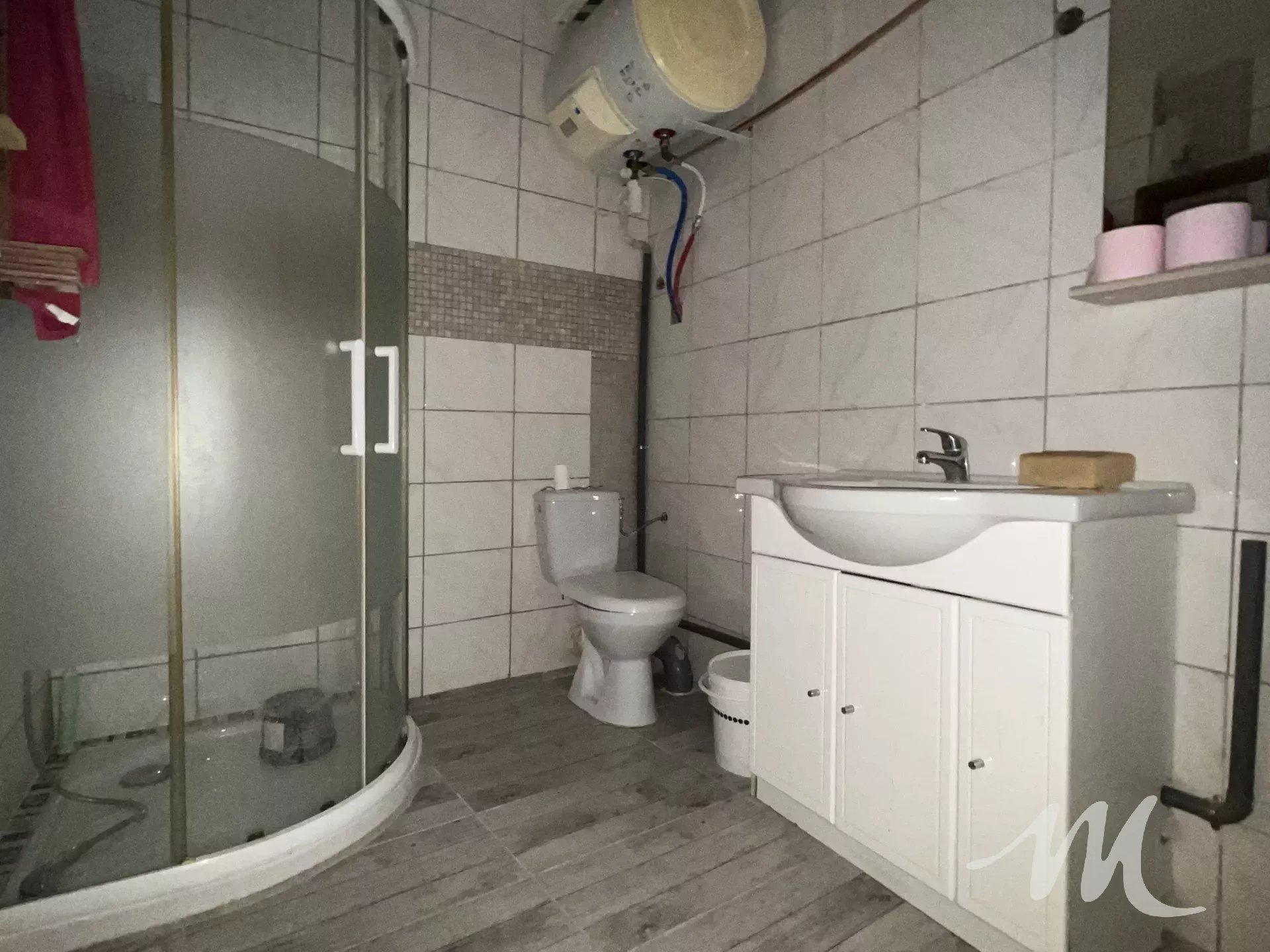 Un escalier mène au premier étage, où vous trouverez un espace séjour/cuisine, ainsi qu’une salle d’eau avec toilettes.
